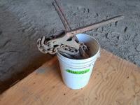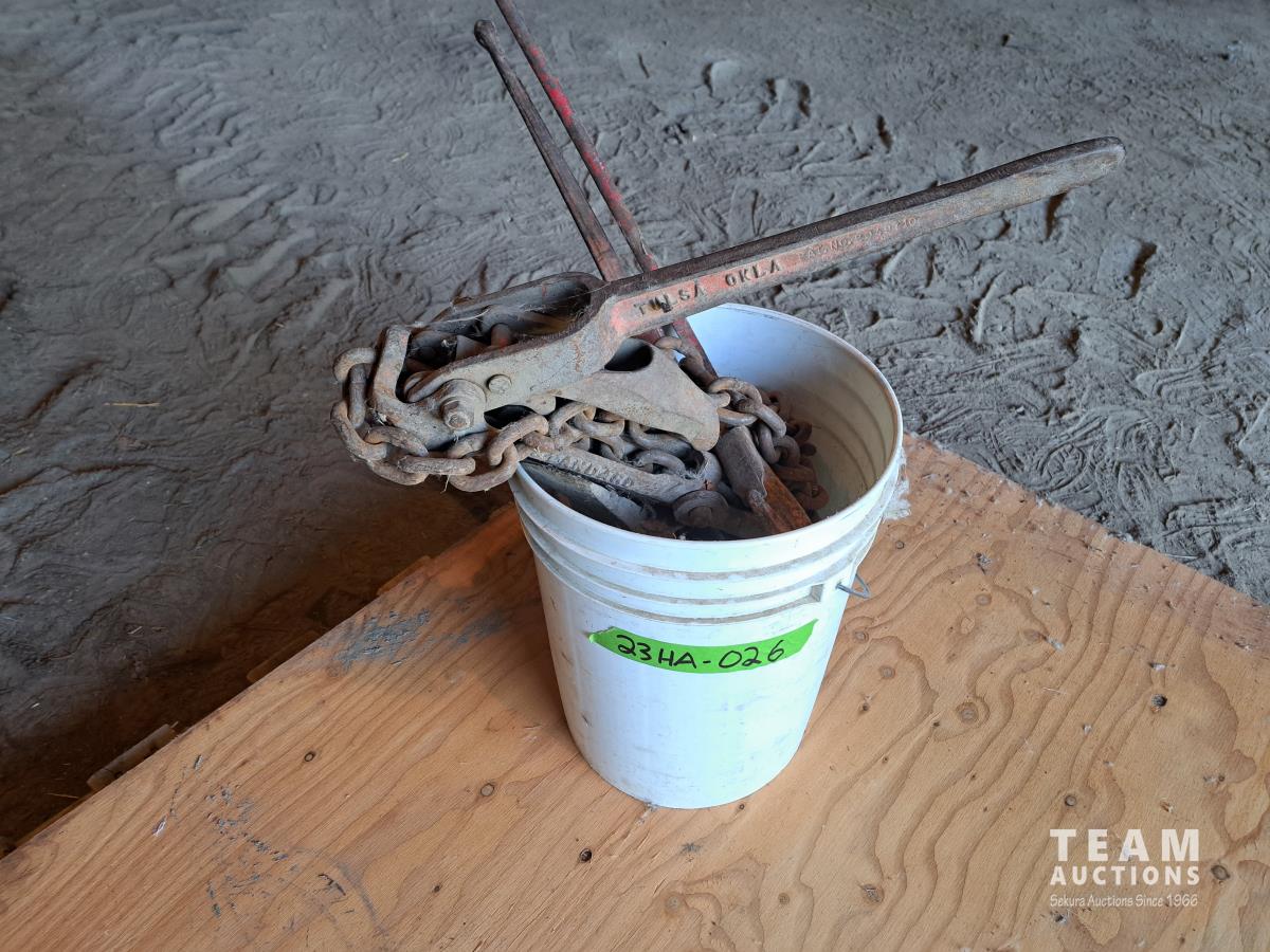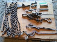 Chains, boomers, hitch pins, clevis, 10 items total.