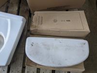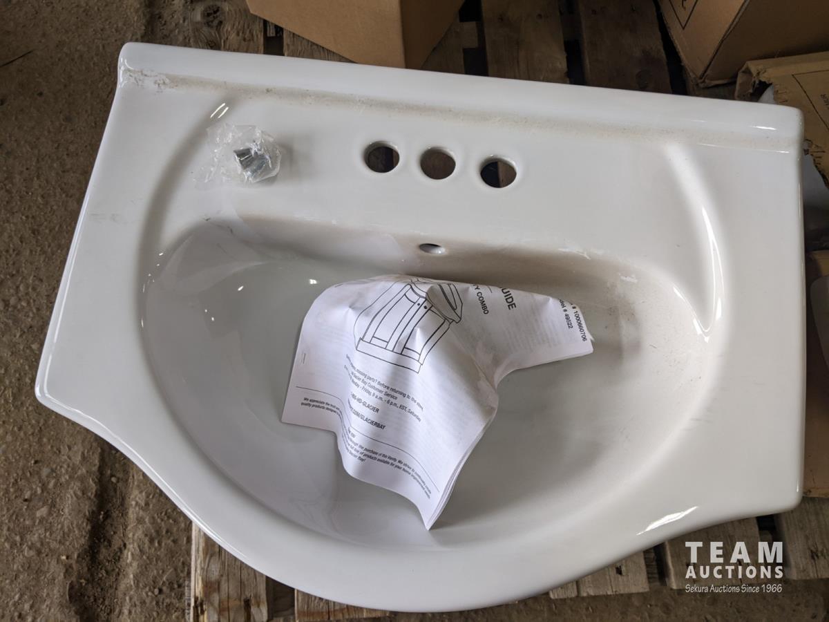 Gerber wall hung lavatory 19 inch x 17 inch, 4 inch cc; 24 inch semi-cast vanity with 4 inch cc; (3) toilet tank lids; (2) Danze shower heads and pressure balance valves