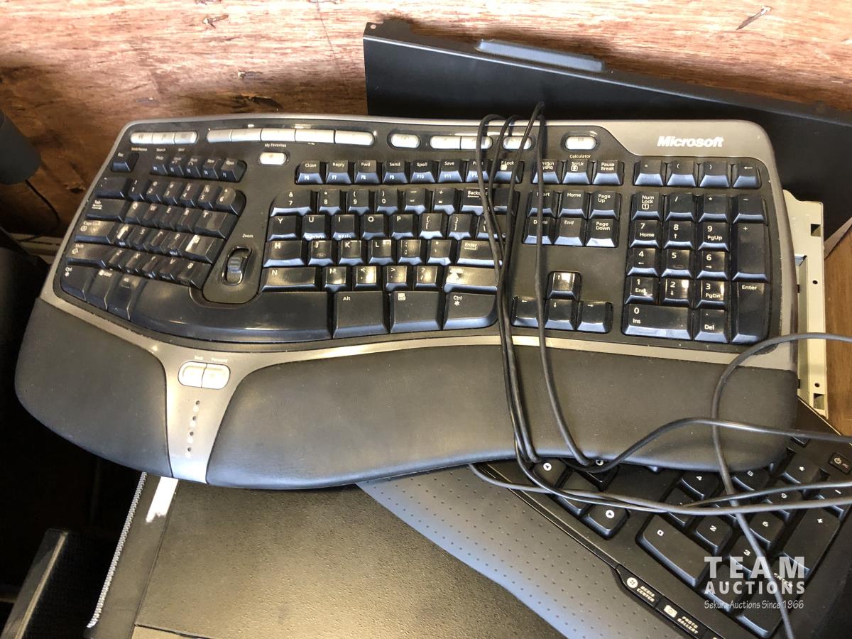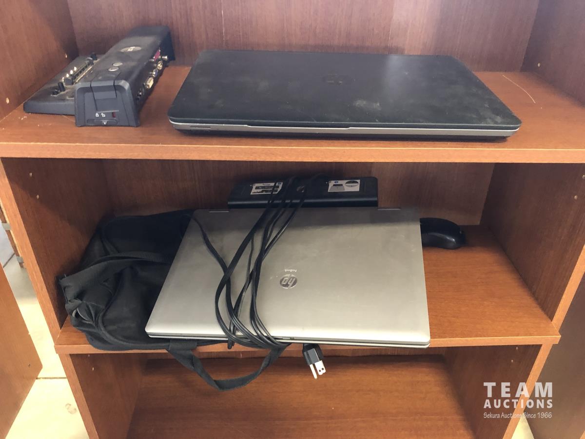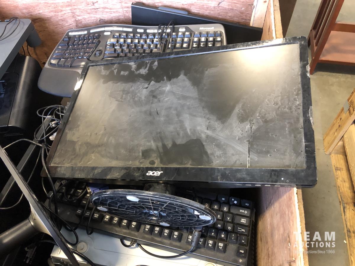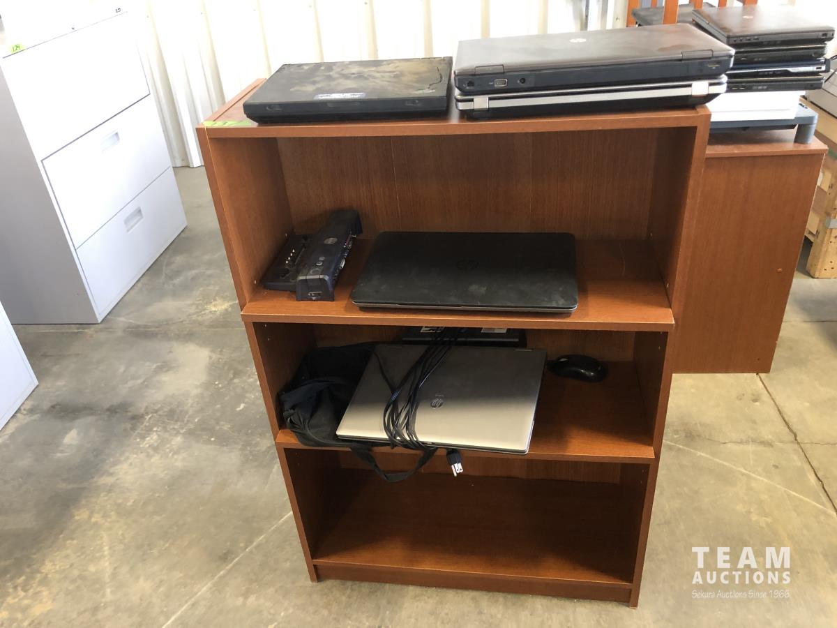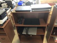 Computers, printers, keyboards, monitors and miscellaneous related equipment. Three tier shelf: 29.5 inch l x 11.5 inch d x 43.5 inch h, includes contents