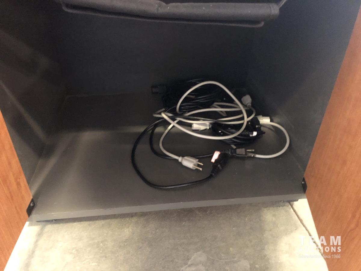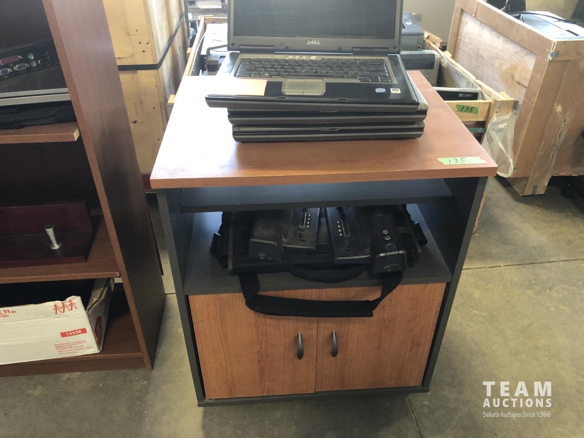 Keyboards, computers, printers, laptops, monitor and related equipment. Cabinet: 23.5 inch l x 19.5 inch d x 29.5 inch h, contents included