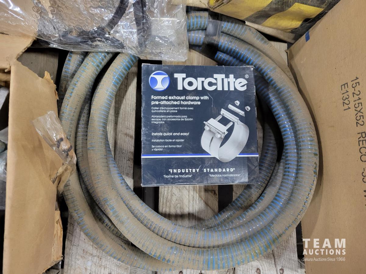 Qty of gauges, various truck flags, Gladhand grips, various sized threadfasts, rad caps, Torctite 4 inch exhaust clamp, plastic lug covers