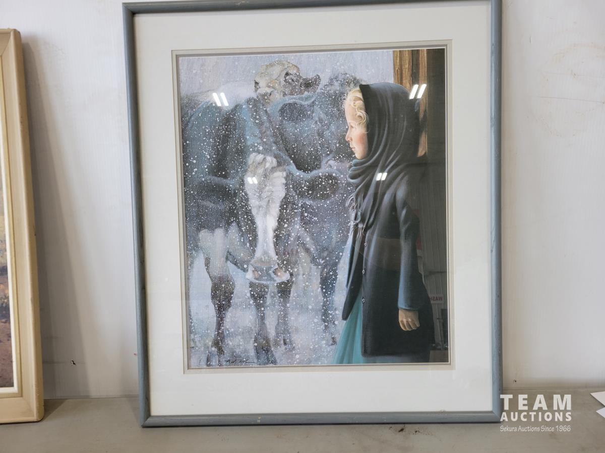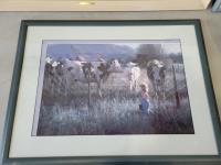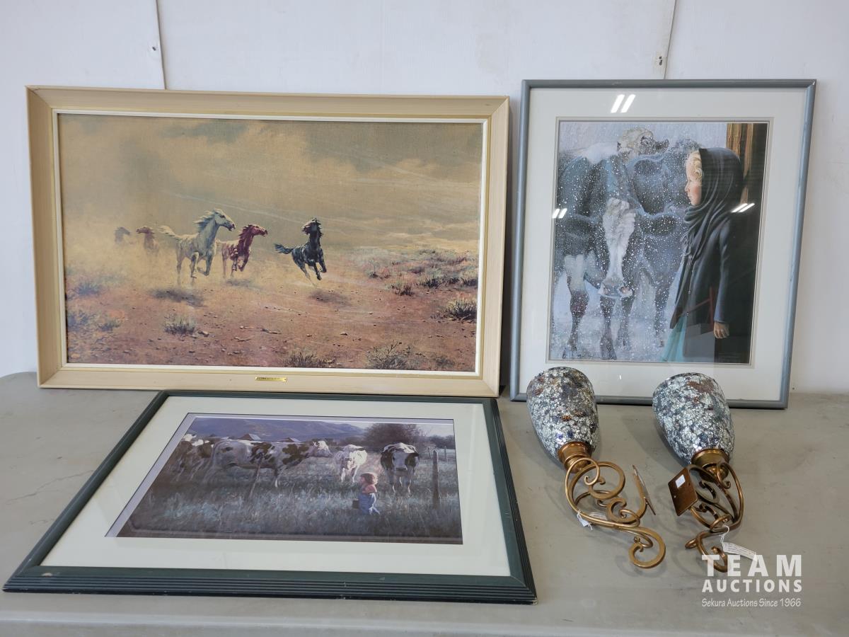 (3) large pictures, (2) vintage wrought iron sconces with glass shade candle holders Pictures : Horse picture "Free As the Wind" by August Albo Cattle Picture "Anniken and the cows by Robert Duncan