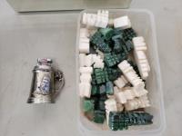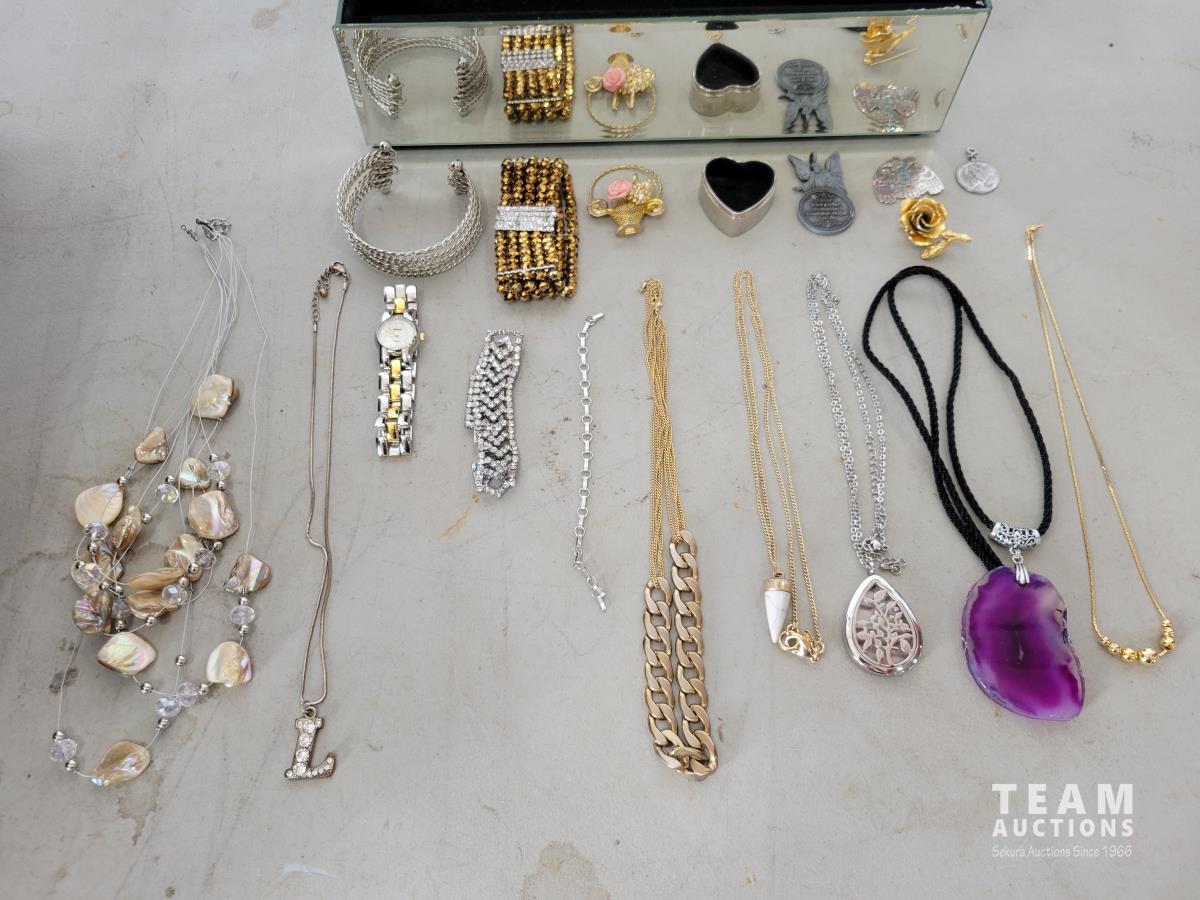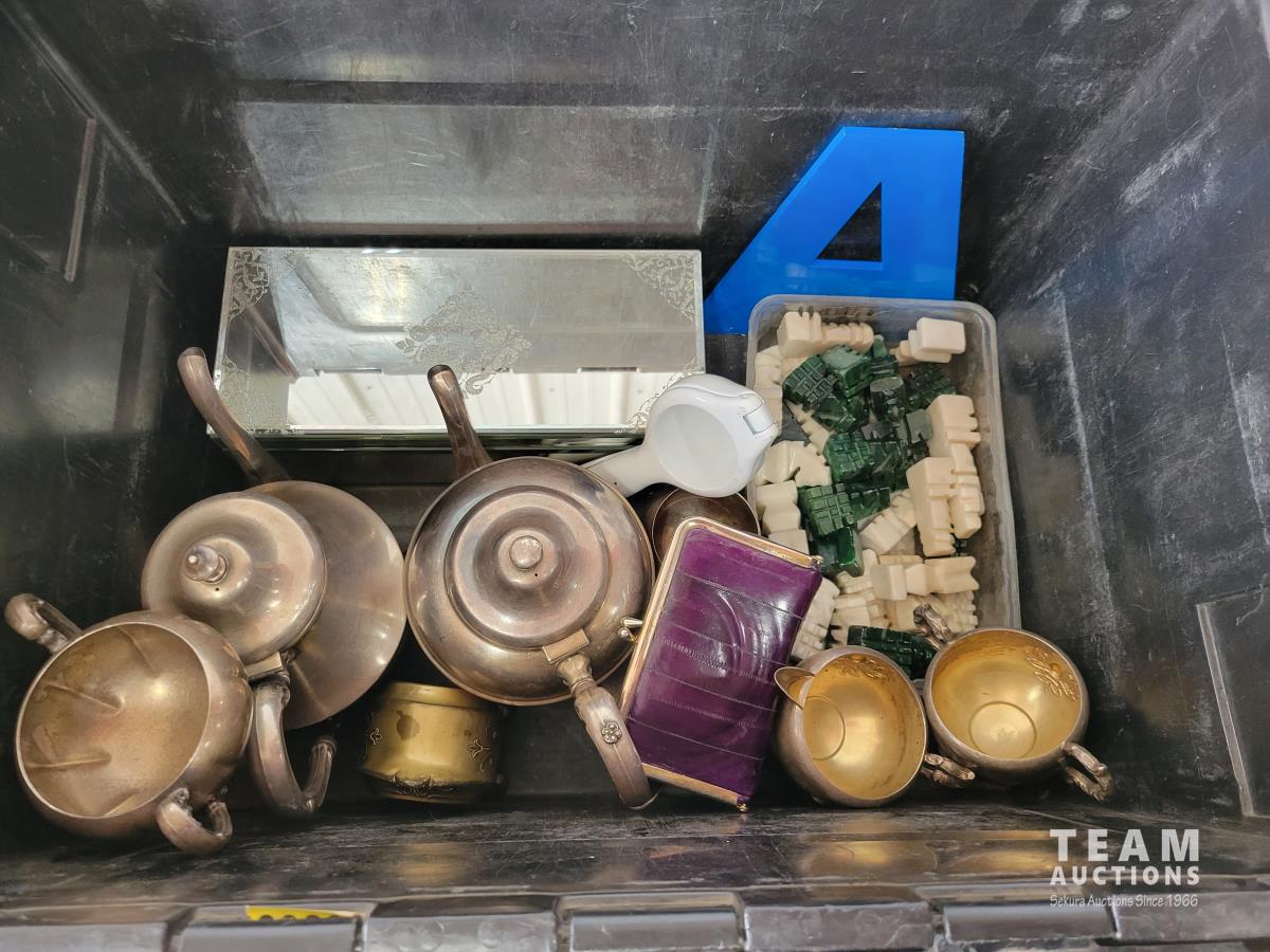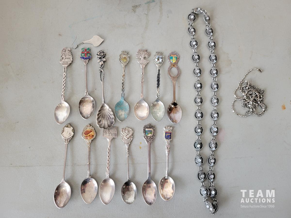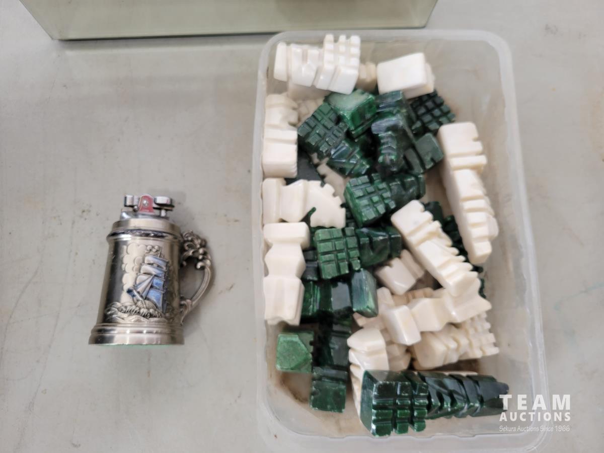 Copper tea set, qty of collectable spoons, mirrored box with costume jewelry, carved chess pieces
