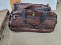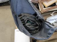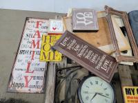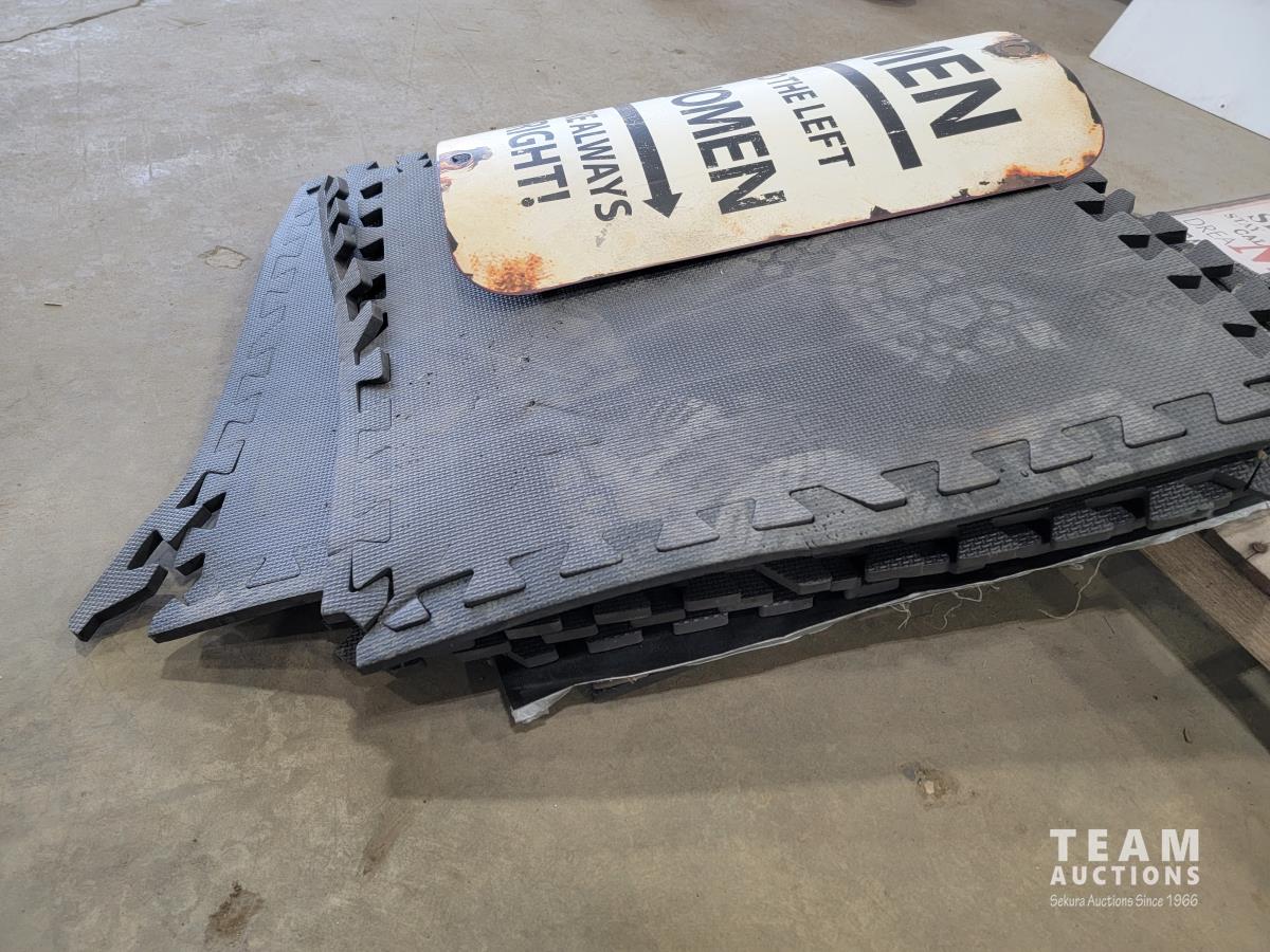 Qty of signs, frames, beach body P90X, outside clock, small tent, Heys duffle bag, wooden shelf and qty of foam floor mats
