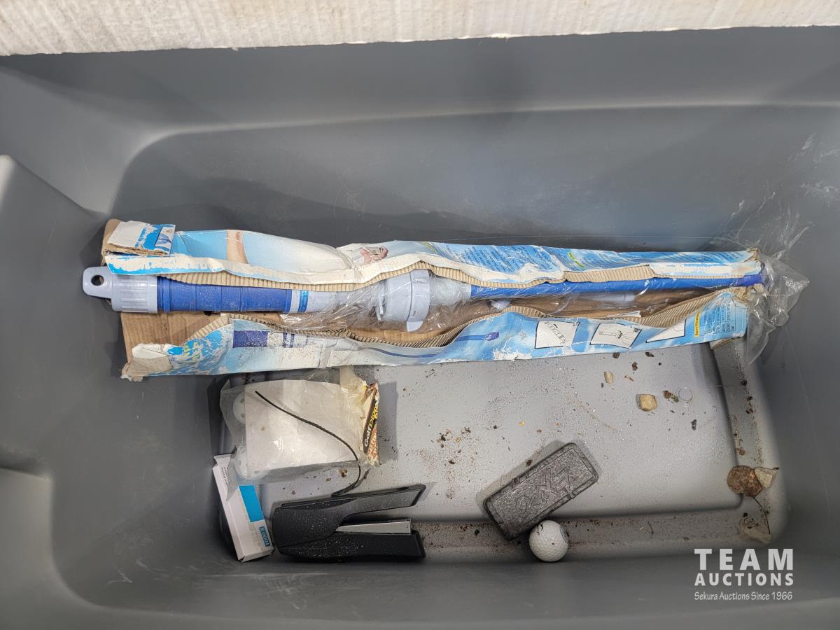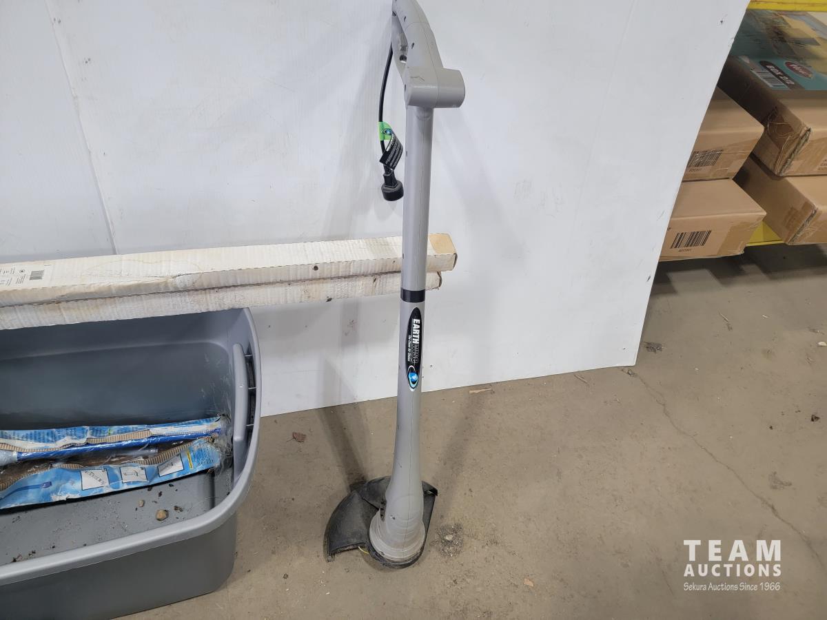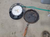 Horse tack, whip, cast iron pan, clock, water pump, (2) sliding door track and hardware, Earthwise trimmer