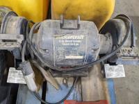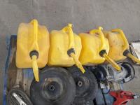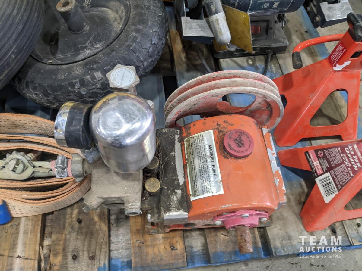 (4) Jerry cans, Mastercraft 6 inch bench grinder, (2) axle stands, (2) ratchet straps and Magikist pump