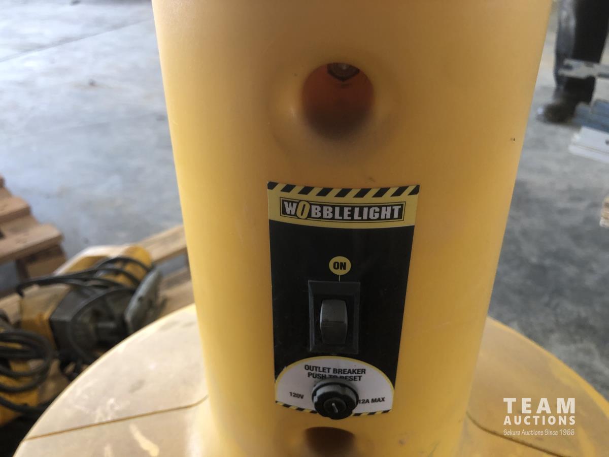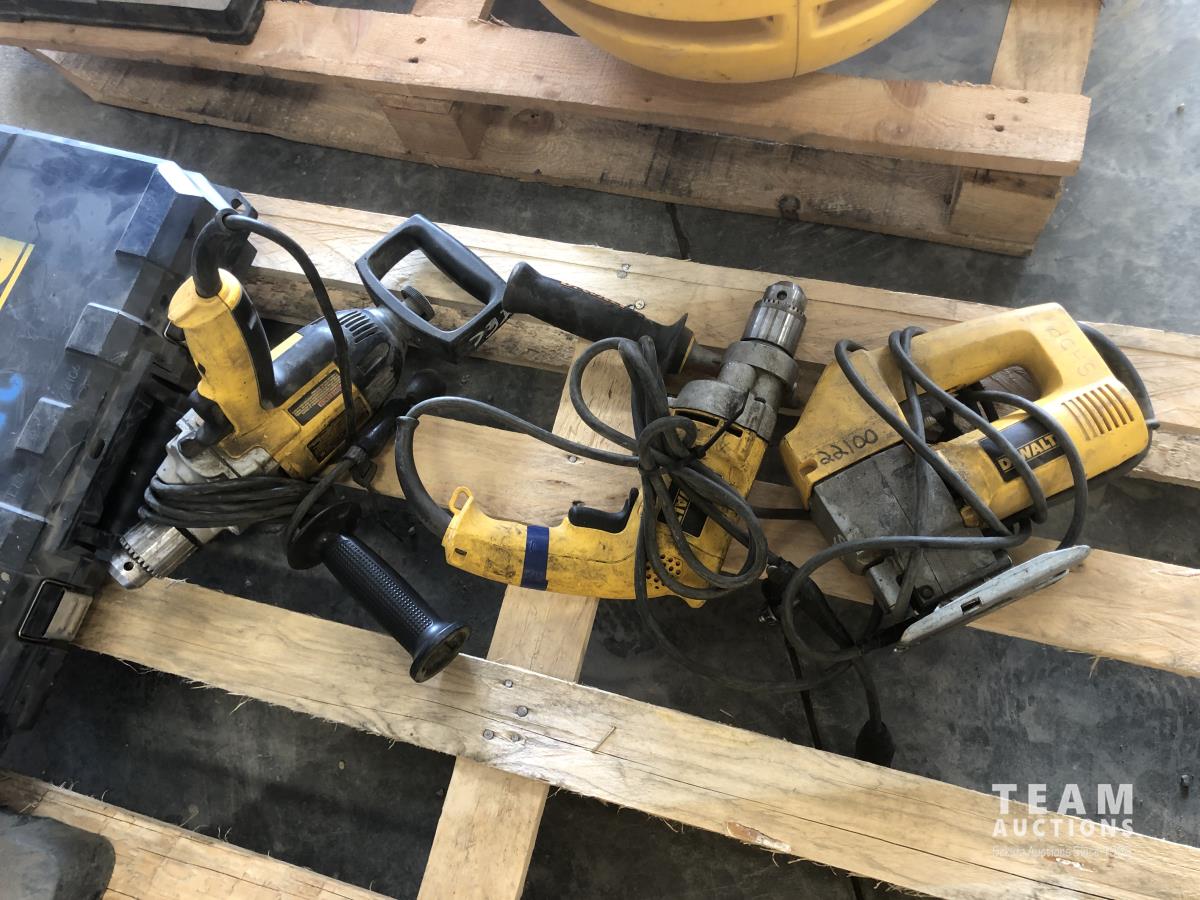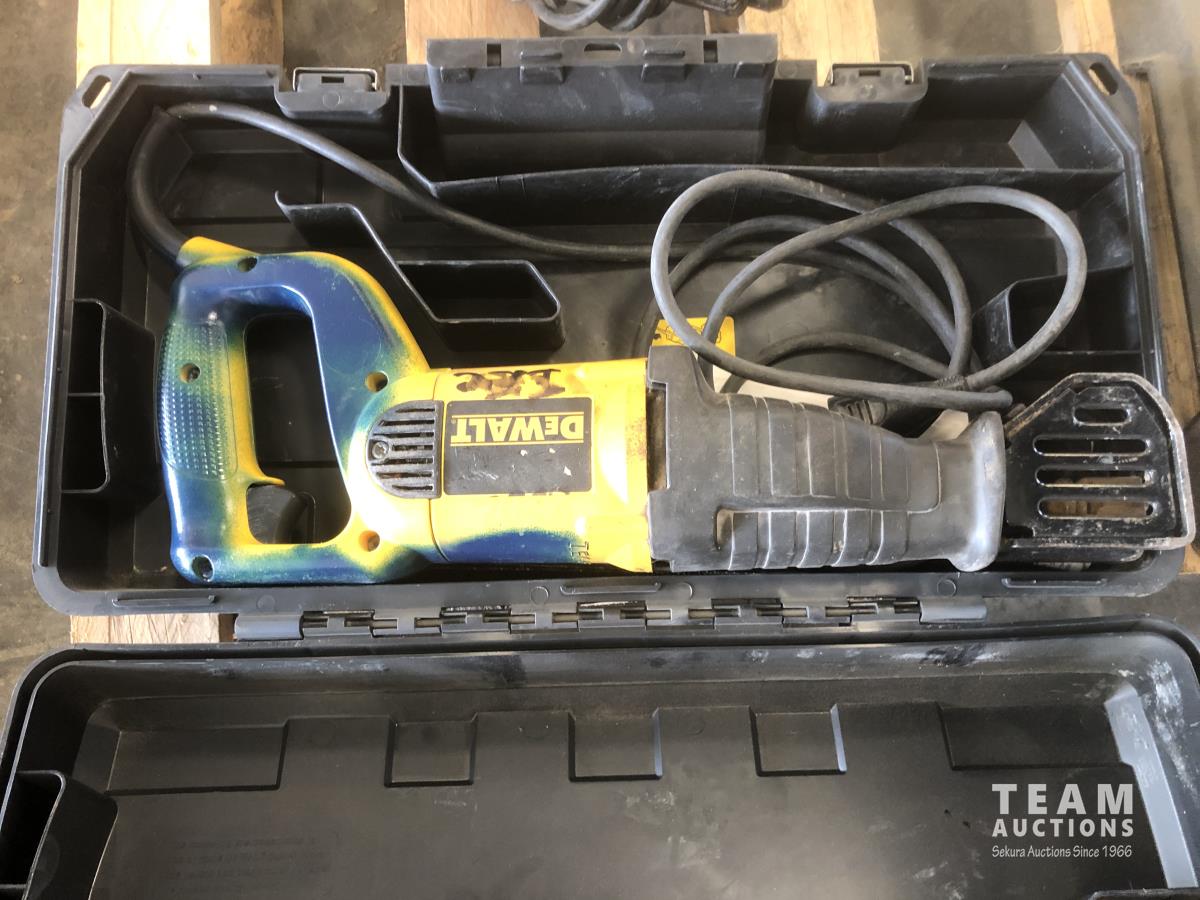 Wobblelight (inoperable), Ryobi drill press, Dewalt jig saw, (2) Dewalt hammer drills and reciprocating saw with case