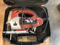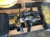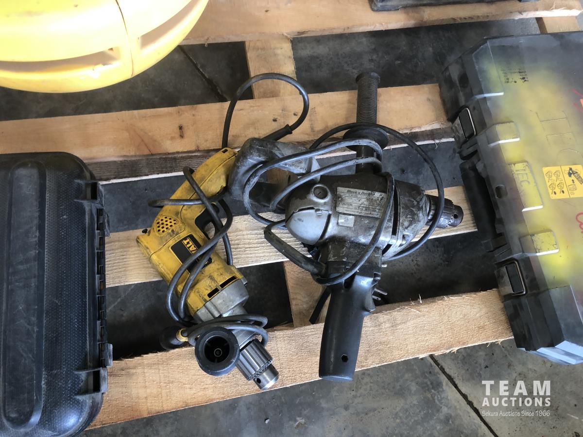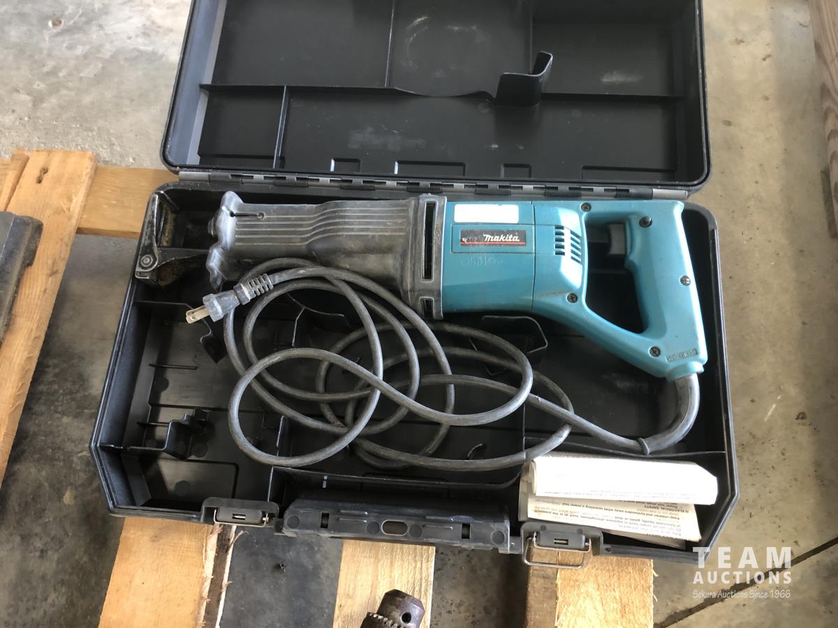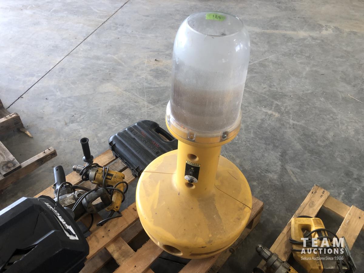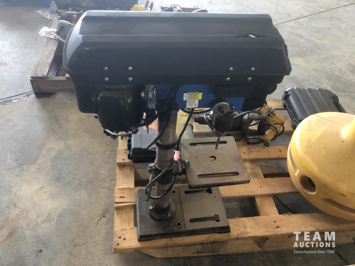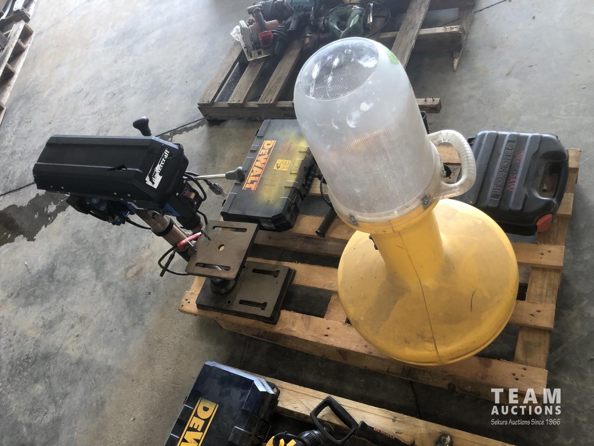 Wobblelight, Black & Decker jig saw with case, Mastercraft 10 inch drill press, Dewalt hammer drill, Black & Decker hammer drill and Makita reciprocating saw with case