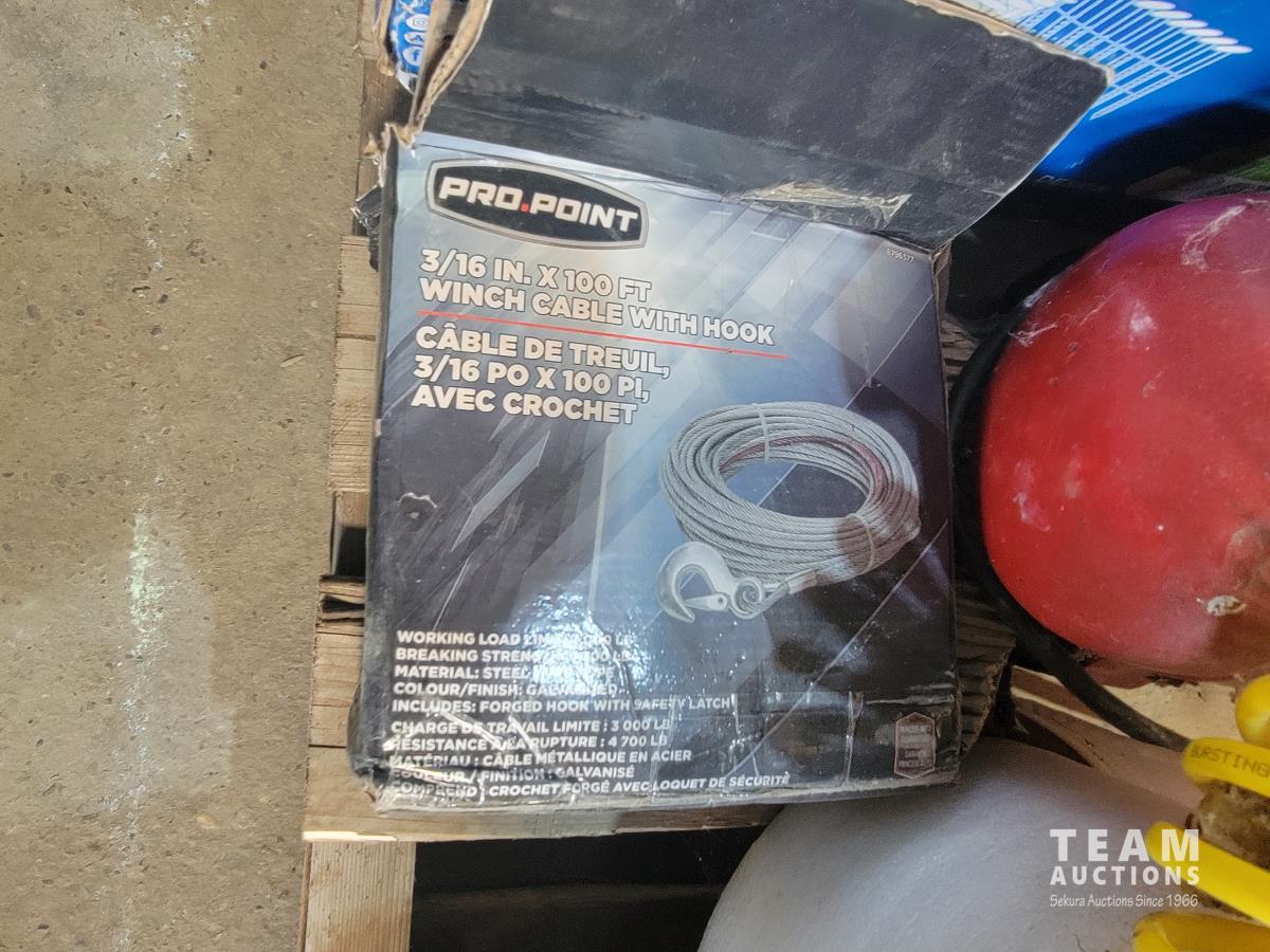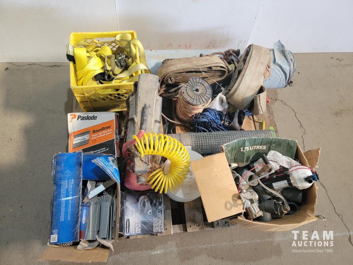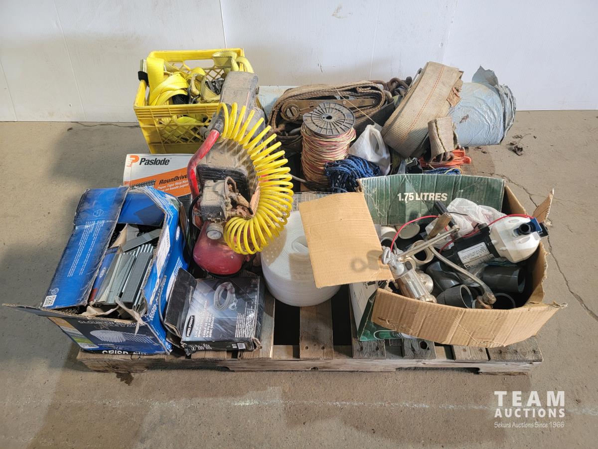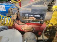 Pipe connectors, ratchet straps, framing nails, winch cable, King Canada 1.5 HP air compressor