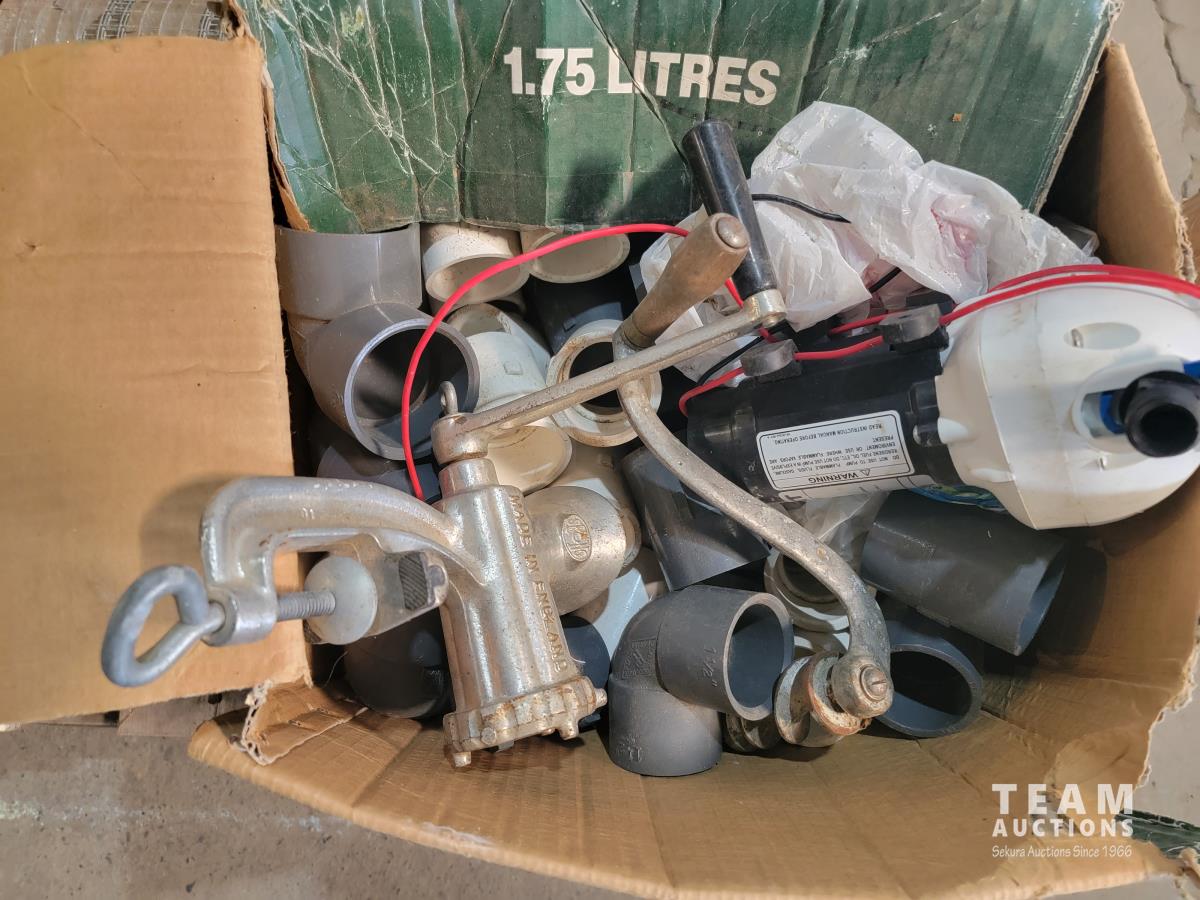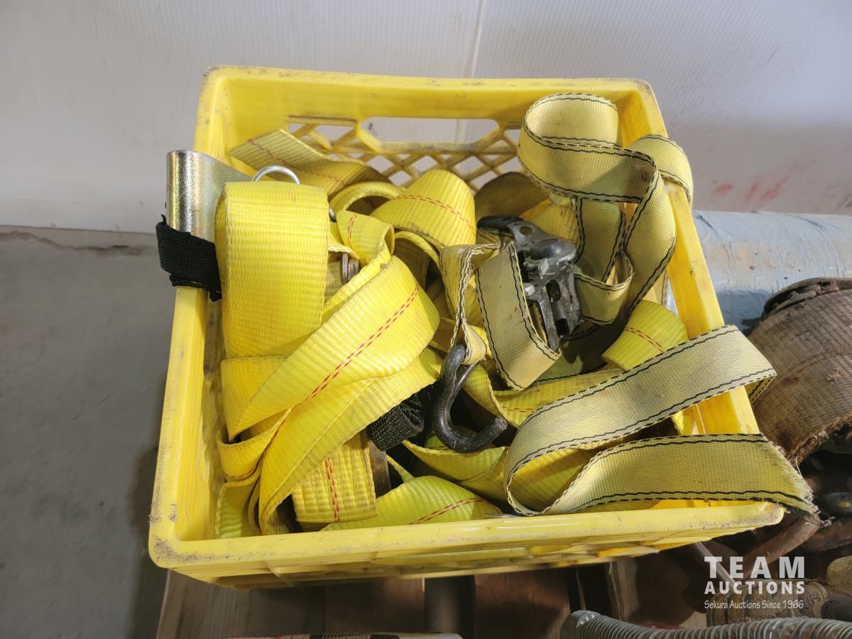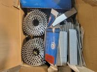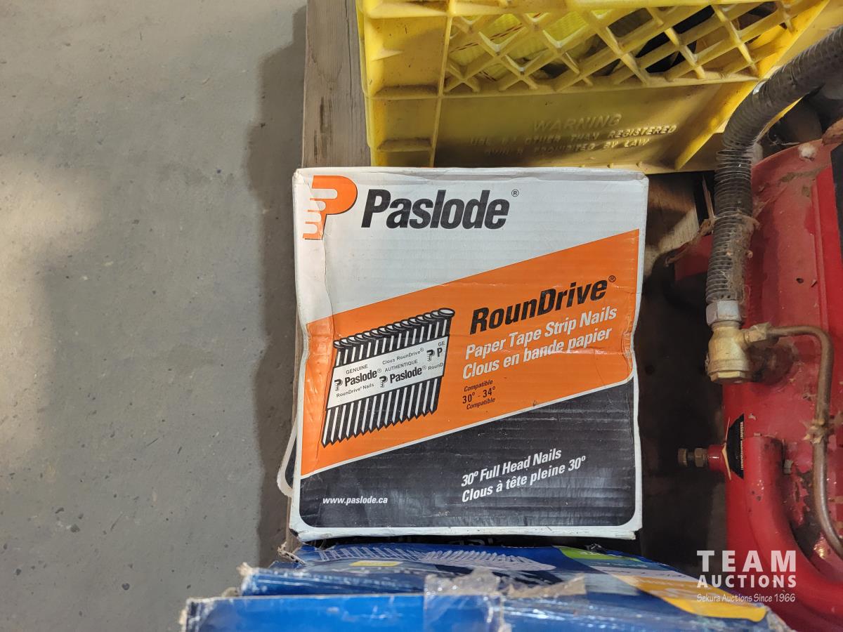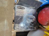 Pipe connectors, ratchet straps, framing nails, winch cable, King Canada 1.5 HP air compressor