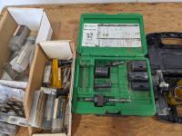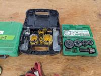 (2) hole saw kits, knock out punch set, miscellaneous drill bits, crimping pliers, assorted taps, (2) straps