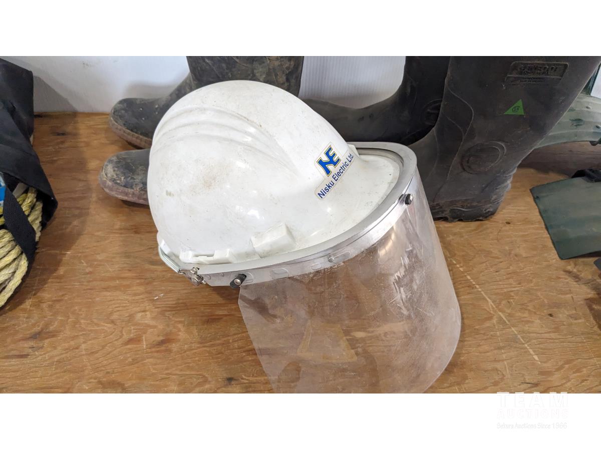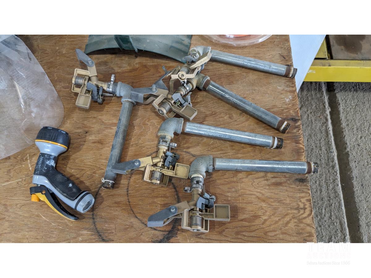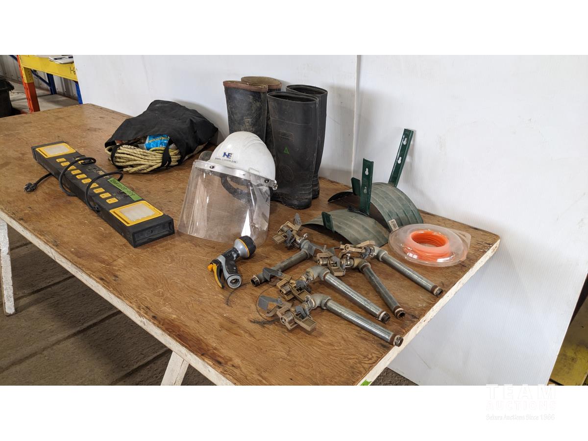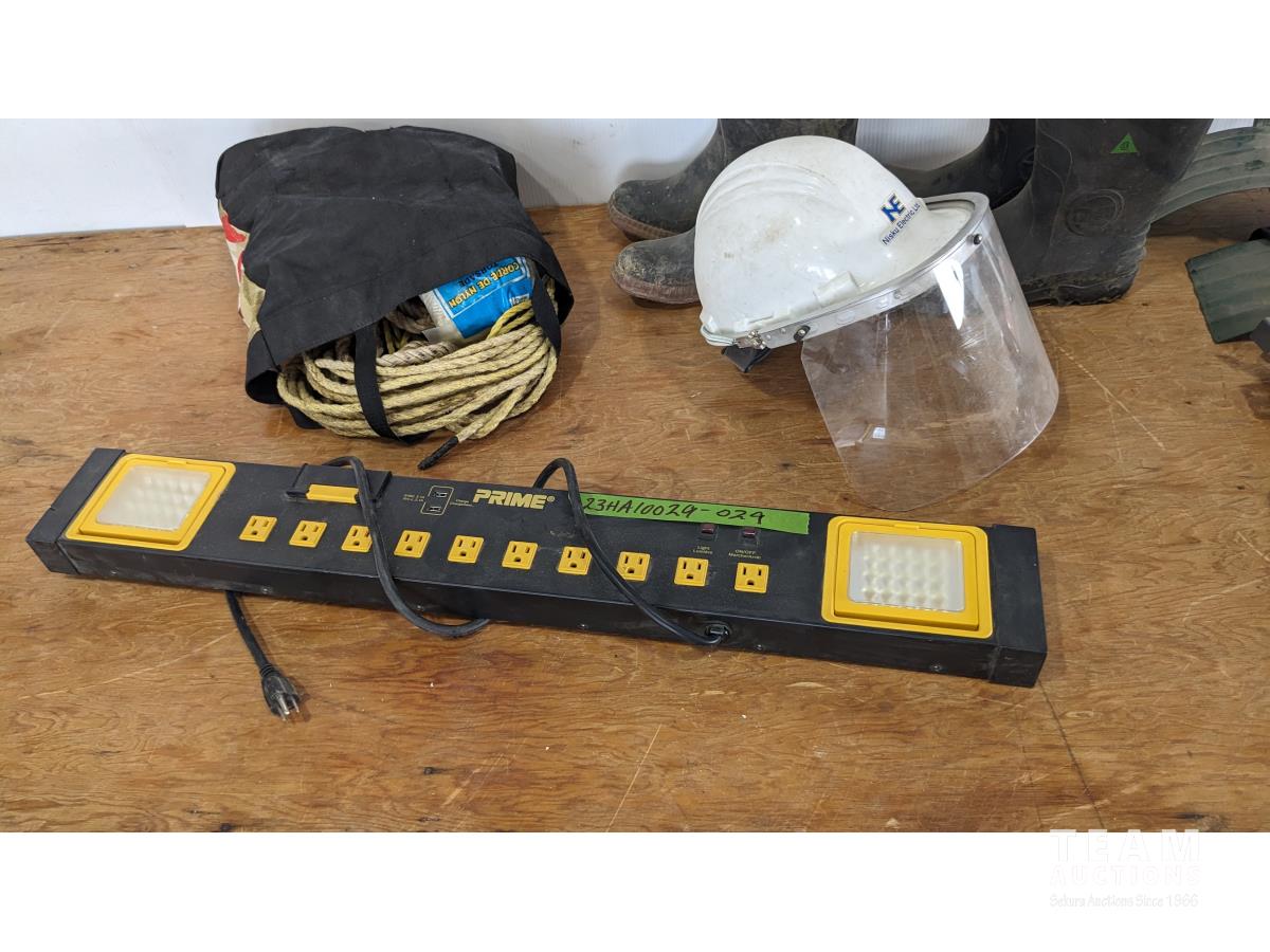 Rubber boots, light bar with plugs, hard hat, rope with bag, (5) irrigation sprinklers