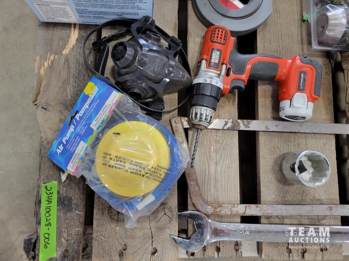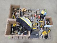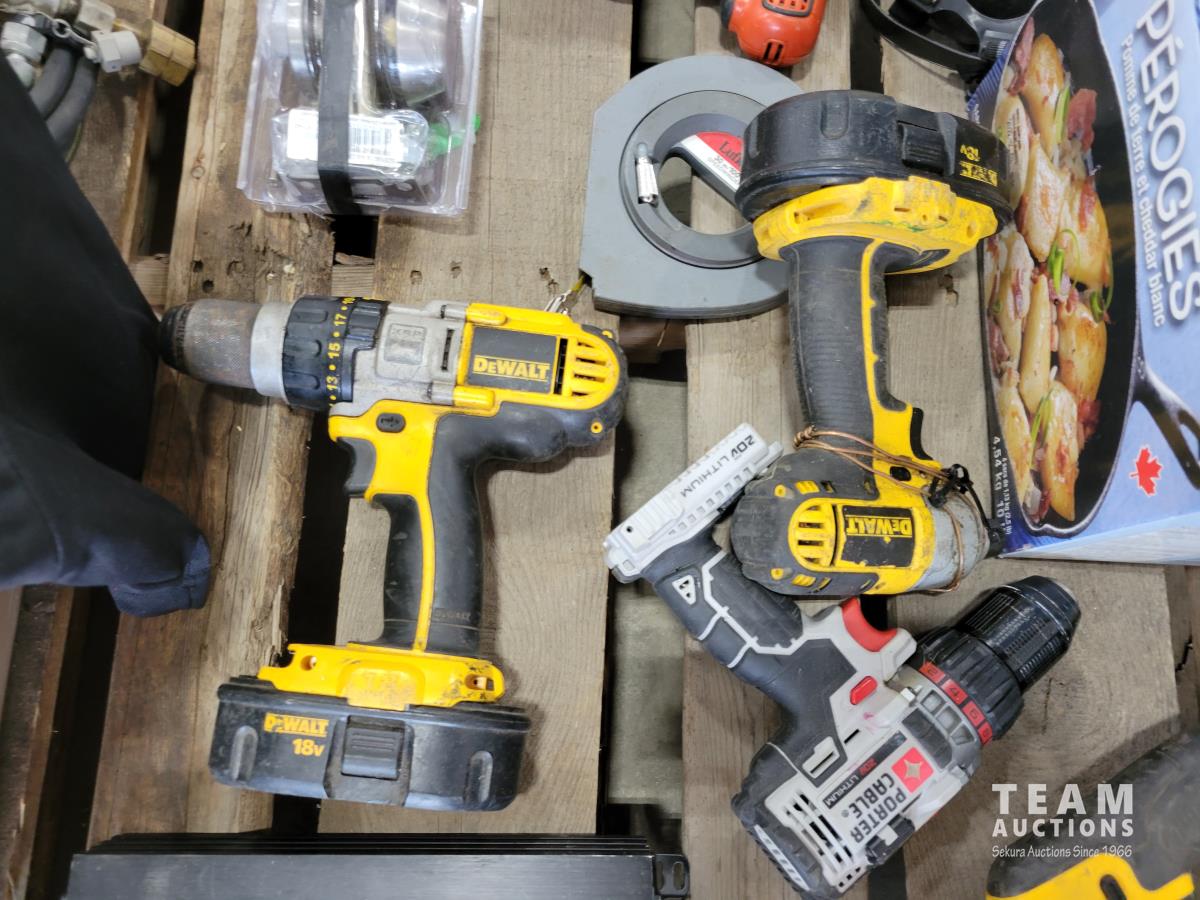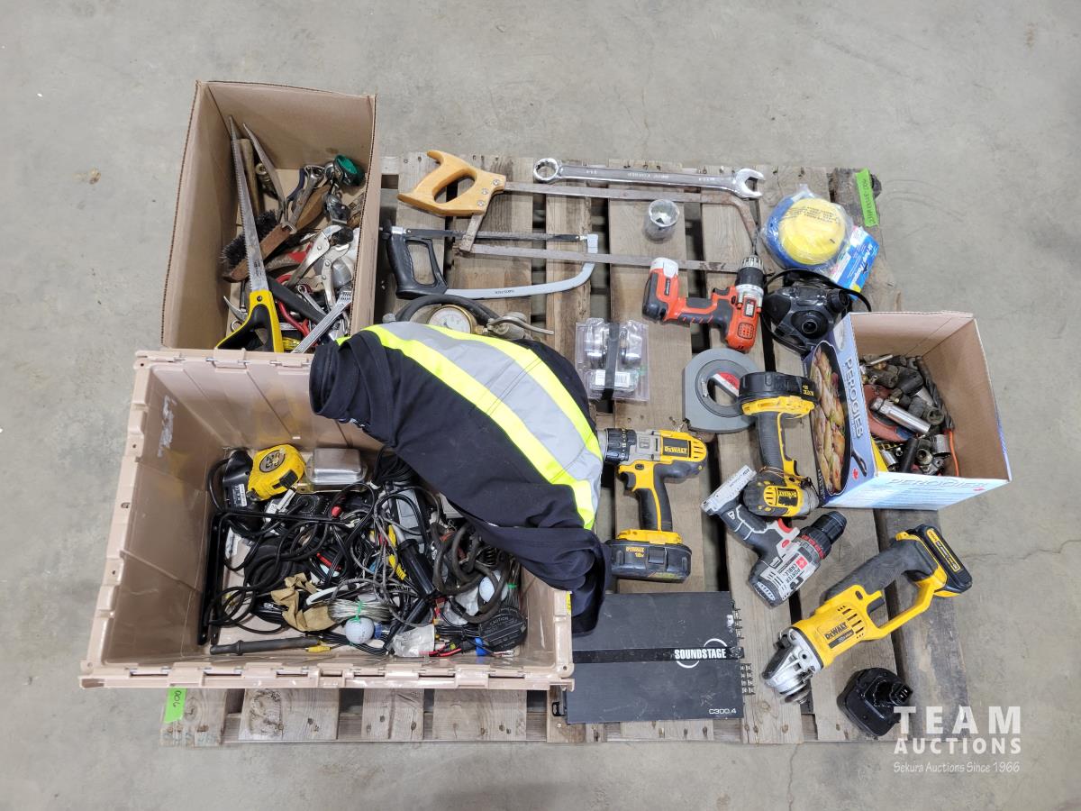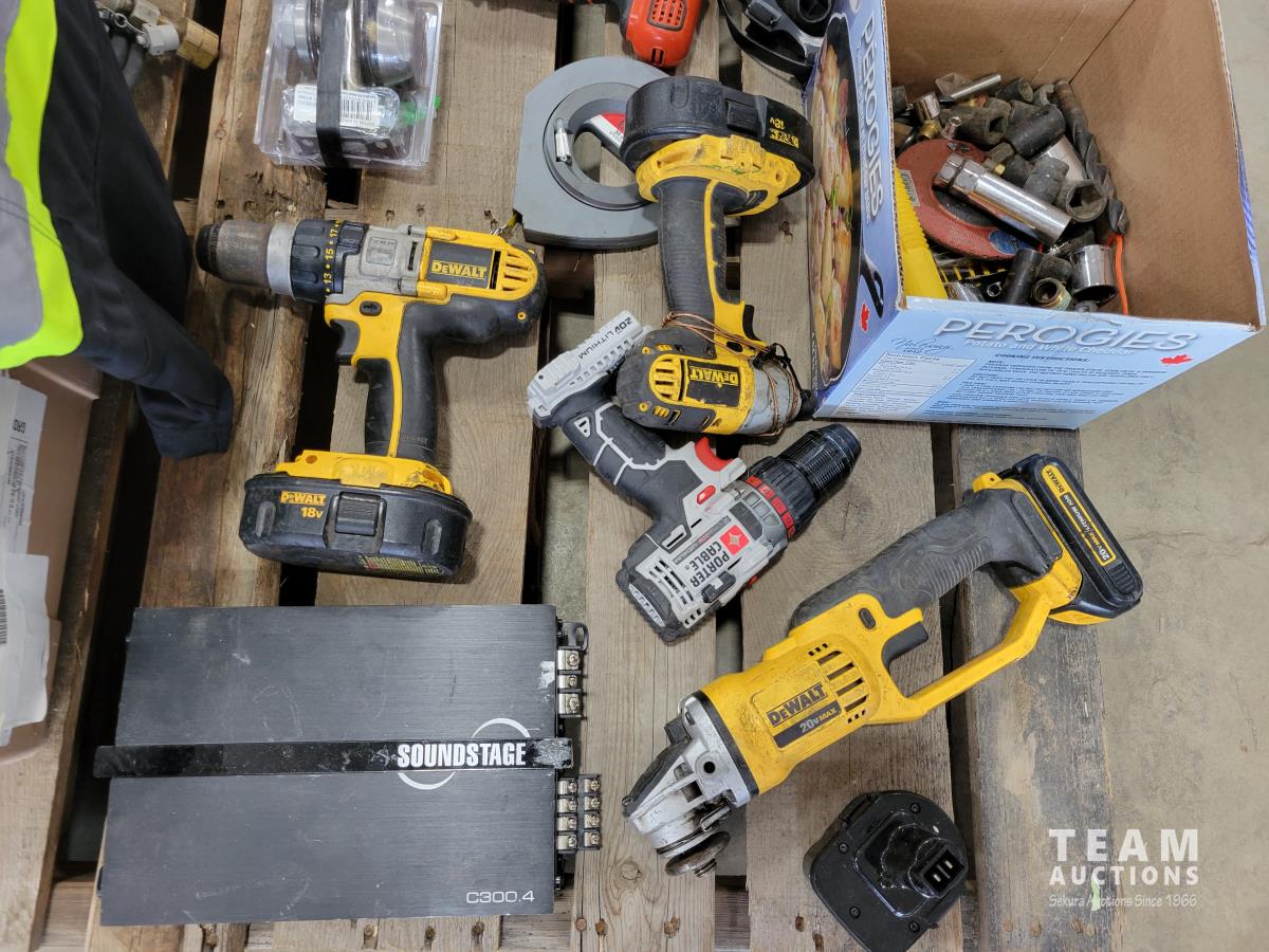 Dewalt 1/2 inch 18v drill (no charger), Dewalt 20v grinder (no charger), hand saws, wrenches, drill bits