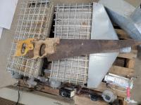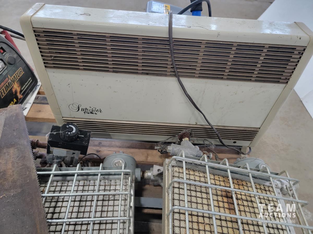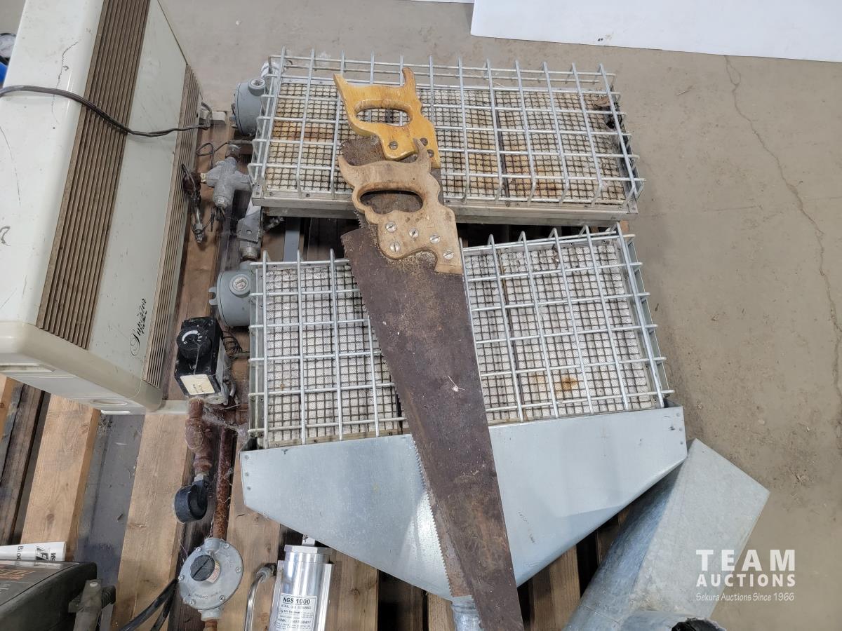 Mastercraft 3 gallon air compressor, Motor Master Eliminator 500A mobile power pack, natural gas scrubber, (2) gas heaters, heater and (2) hand saws