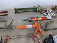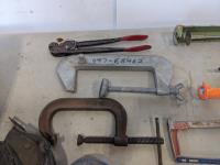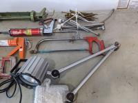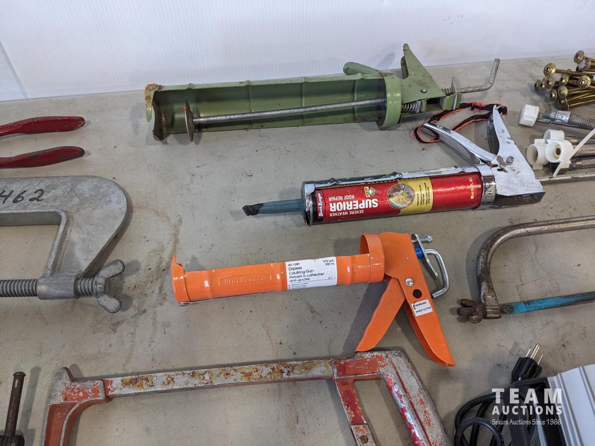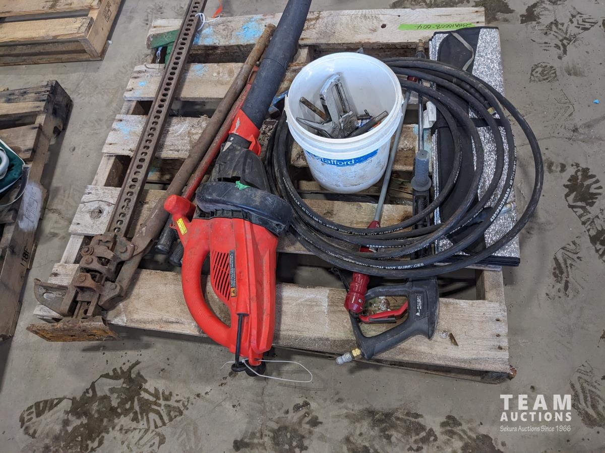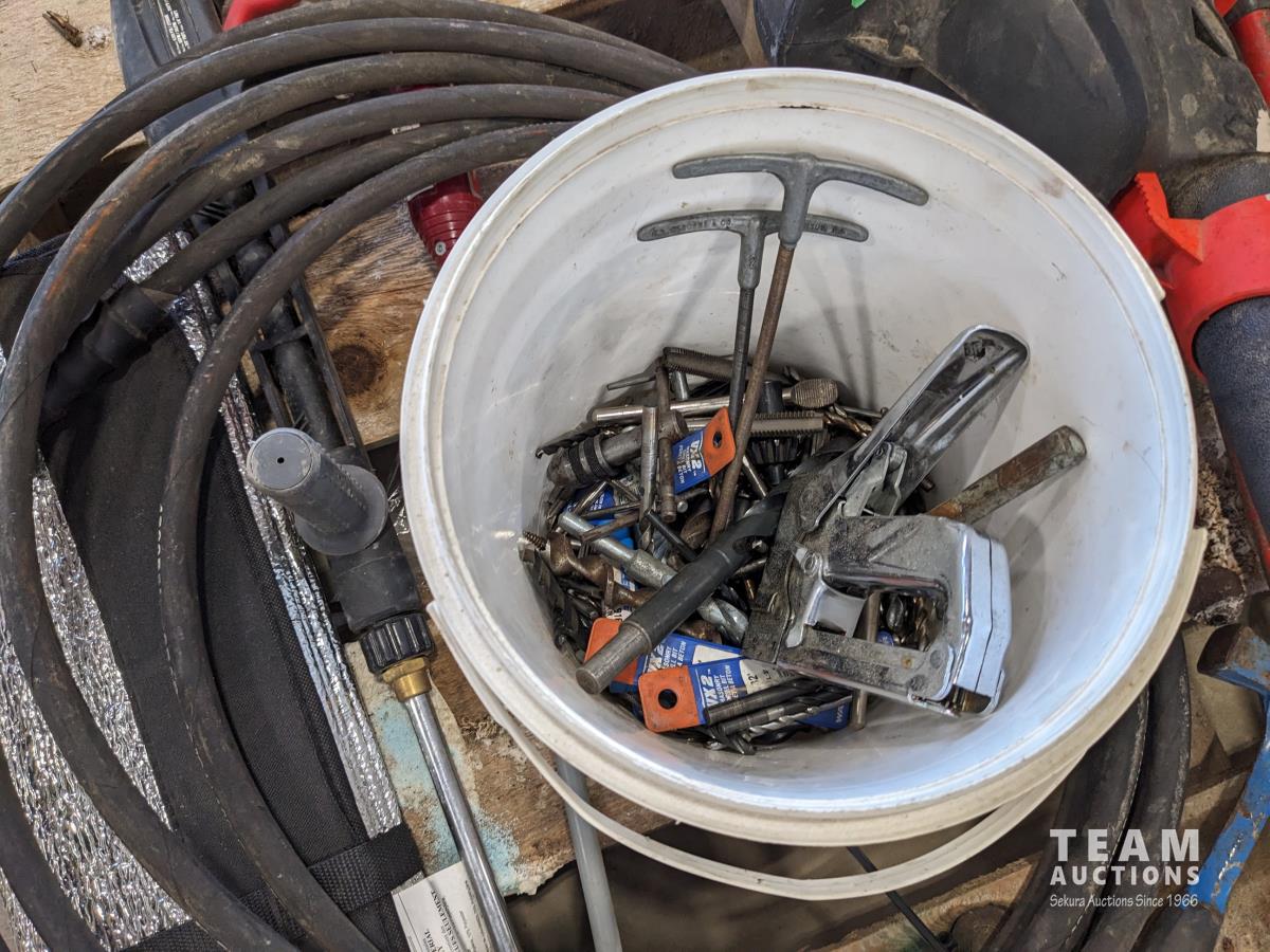 jack-all, bolt cutter, drill bits, hyd hose, electric leaf blower, (2) c clamps, bench top work lights, misc tools and hardware