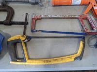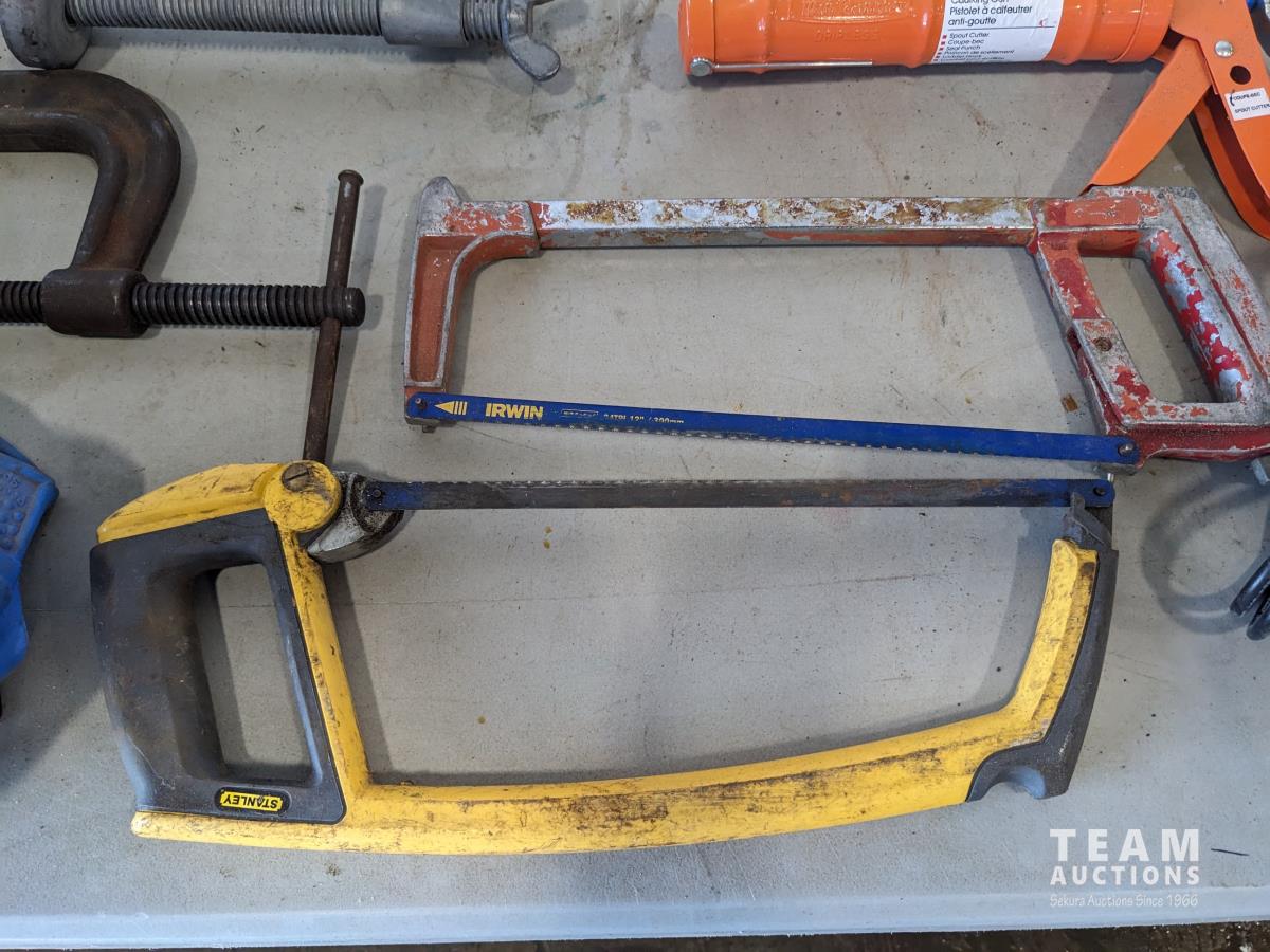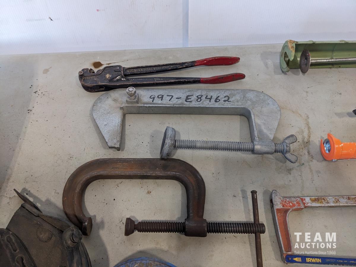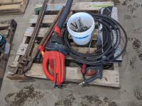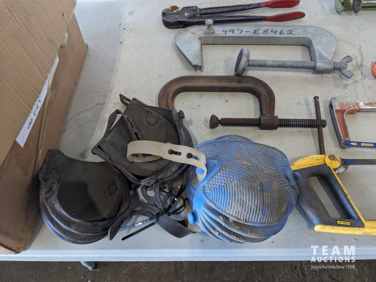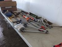 jack-all, bolt cutter, drill bits, hyd hose, electric leaf blower, (2) c clamps, bench top work lights, misc tools and hardware