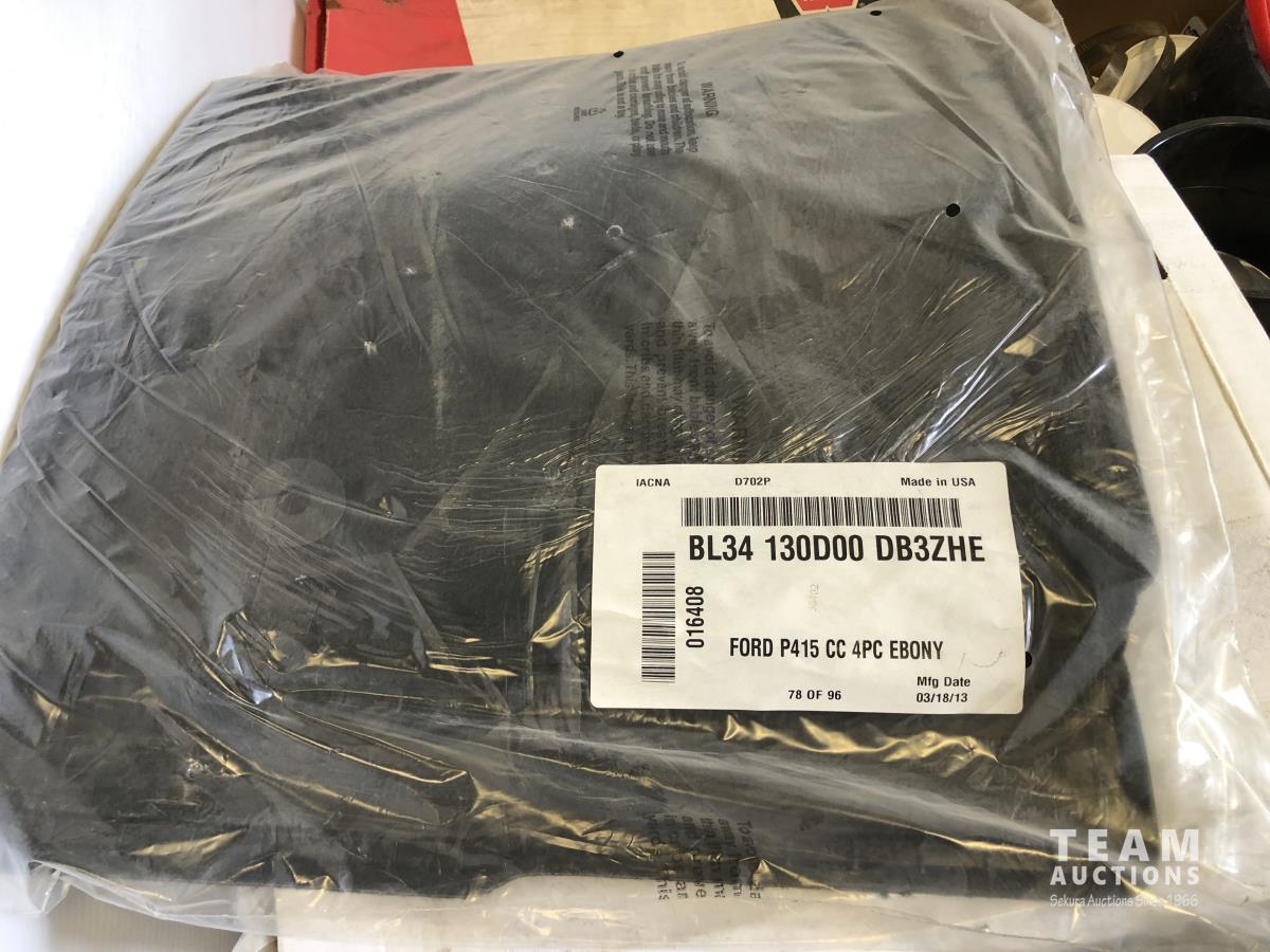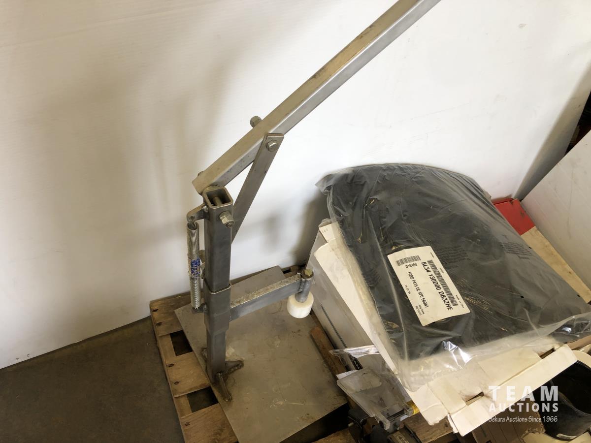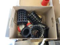 Aluminum hand press, Worksmith bench grinder, Ford P415 ebony car mats, qty of shop hardware, various pump fittings and filters