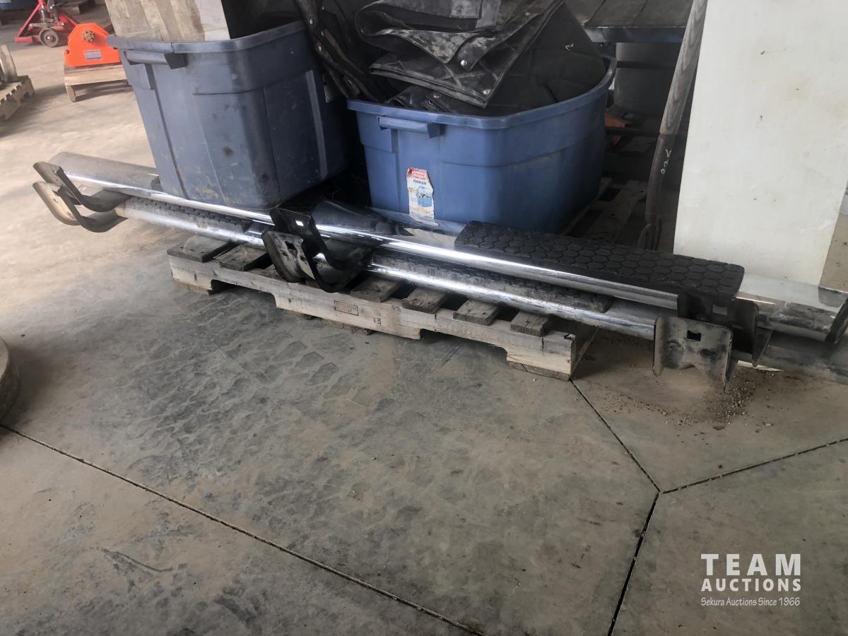 Vehicle floor mats, weather fronts, 7.5 ft running boards for Dodge Ram, (3) Dodge Ram hub caps, trailer torsion bar clamps