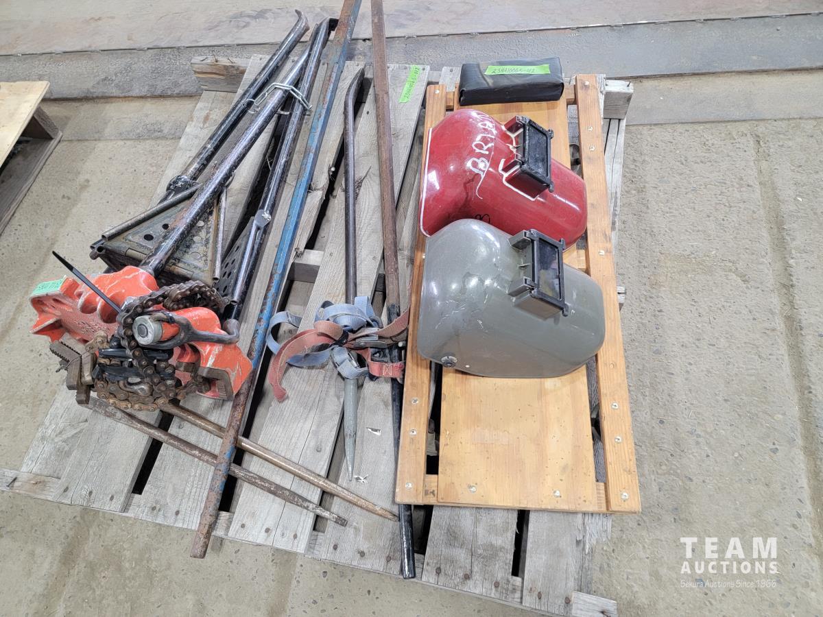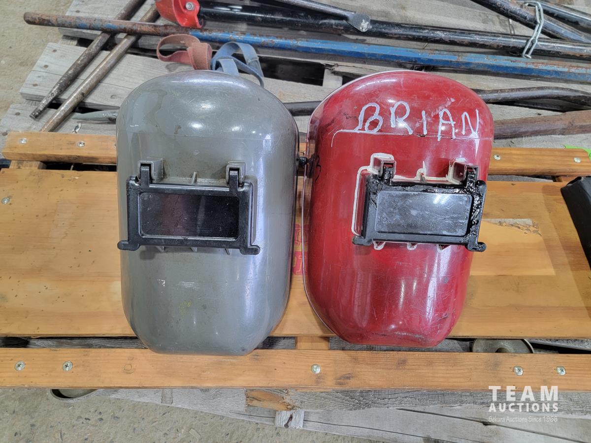 2028 Ridgid Vice Stand, Qty of Pry Bars, Creeper and (2) Welding Helmets