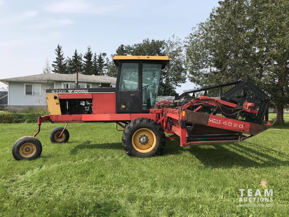 Versatile 4020 20 ft double delivery rigid draper header, Cummins B 4 cylinder diesel engine, A/C, Hart Carter pickup reel,, 17.5L-24 front tires, 5L-14 rear tires