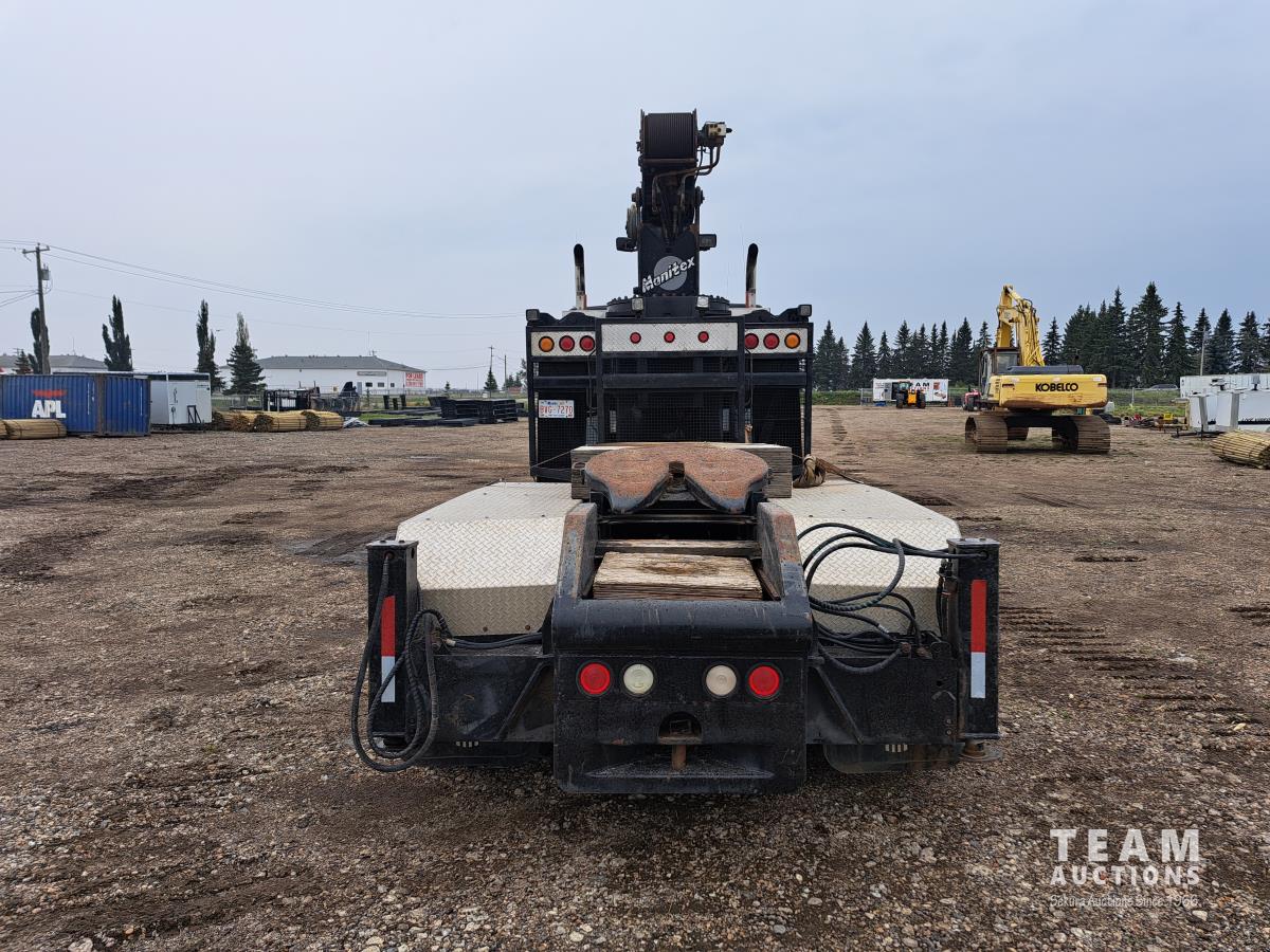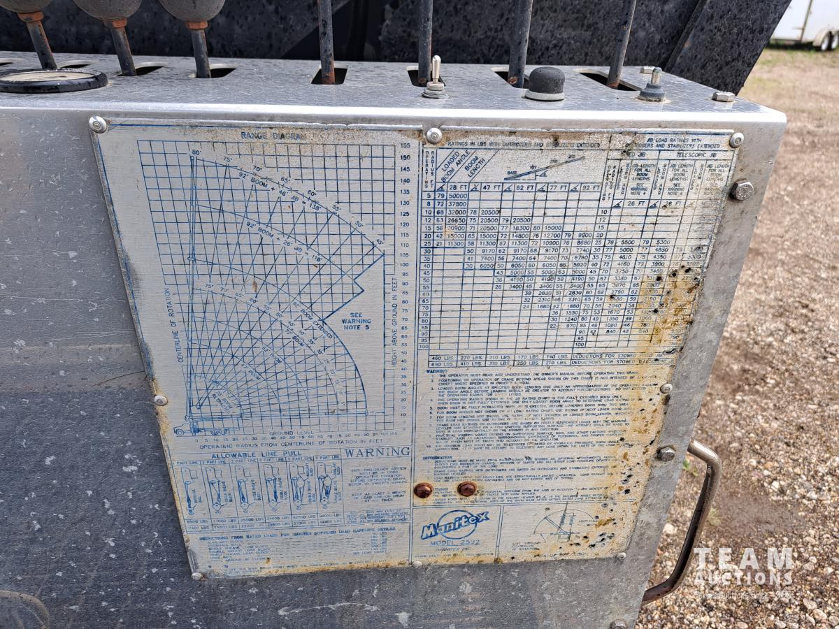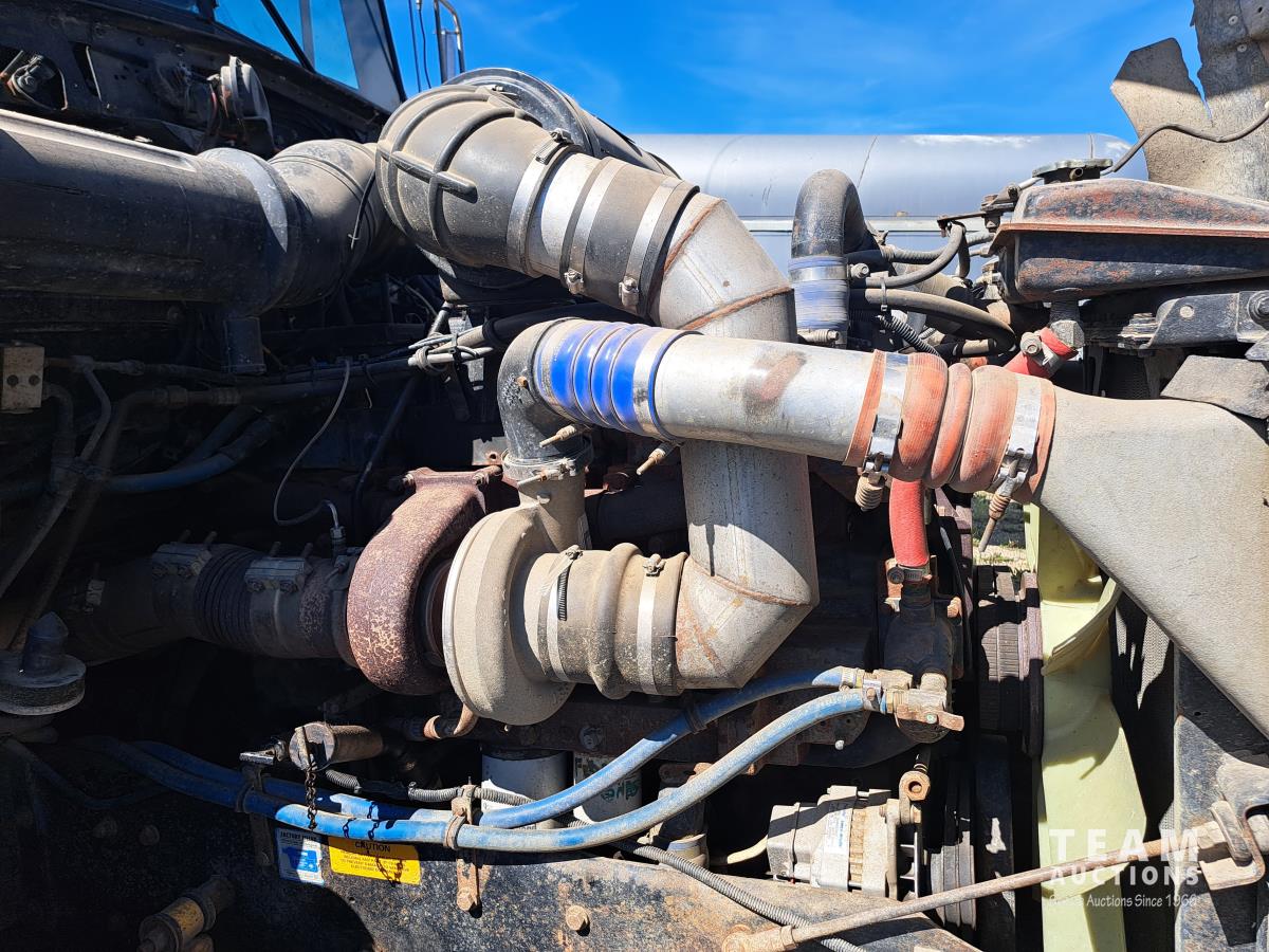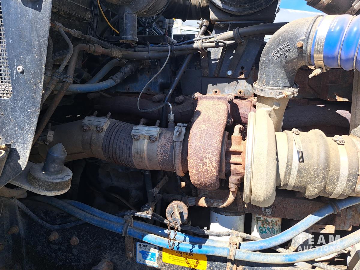 Cummins N14 6 cylinder diesel engine, engine brake, engine block heater, positive air shutoff, Fuller RTL016718BP 18 speed manual transmission, flat top sleeper, A/C, cruise control, air ride seats, stereo, MANITEX 2592 92 ft straight boom rear mount crane, outriggers, all aluminum wheels, 445/65R22.5 front tires, 11R24.5 rear tires