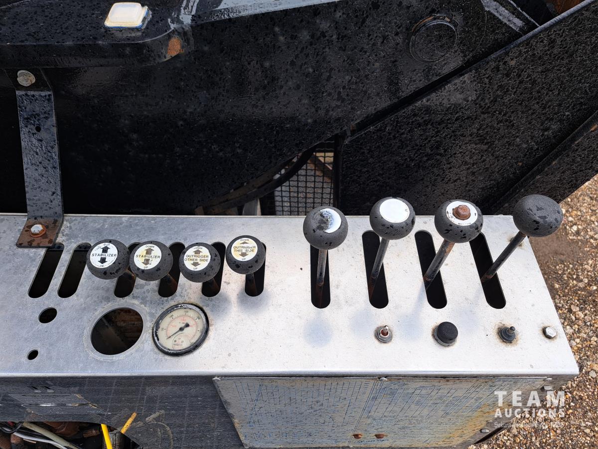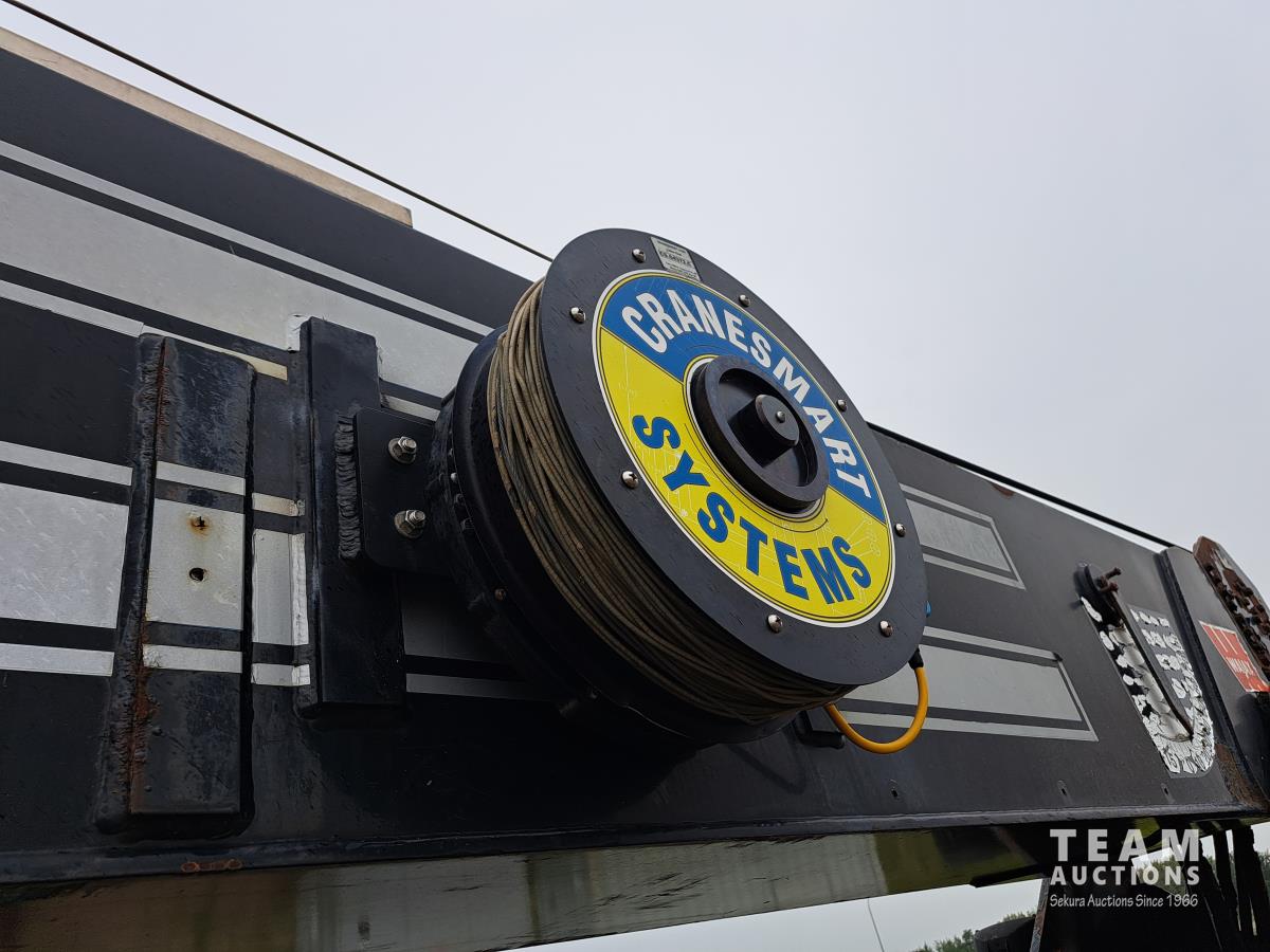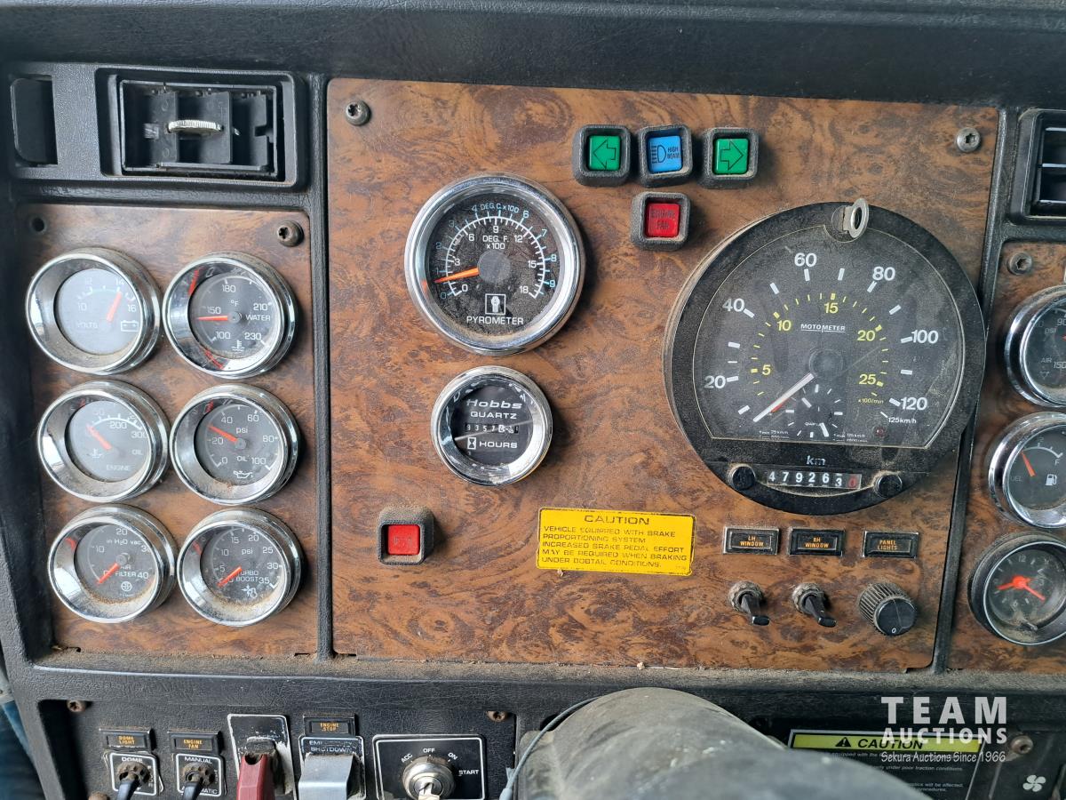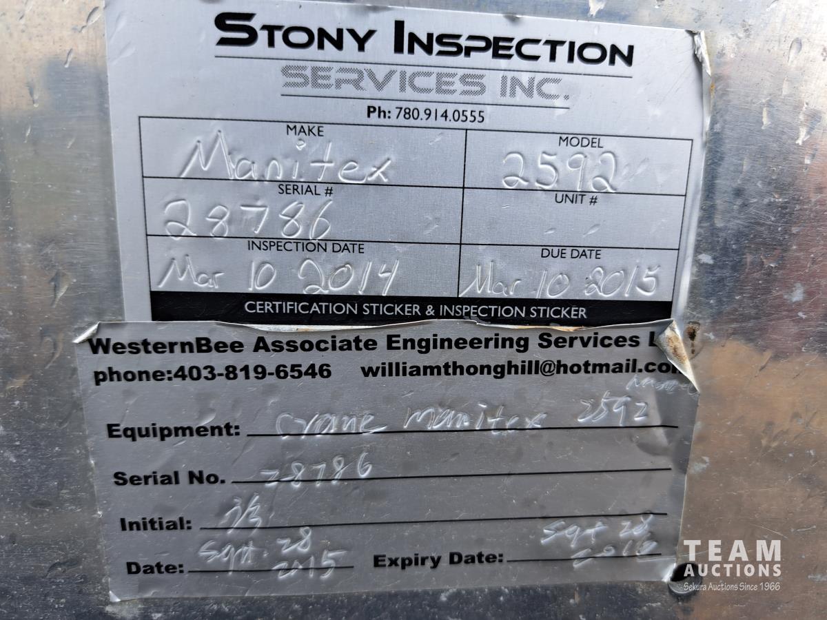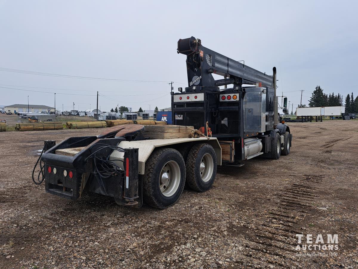 Cummins N14 6 cylinder diesel engine, engine brake, engine block heater, positive air shutoff, Fuller RTL016718BP 18 speed manual transmission, flat top sleeper, A/C, cruise control, air ride seats, stereo, MANITEX 2592 92 ft straight boom rear mount crane, outriggers, all aluminum wheels, 445/65R22.5 front tires, 11R24.5 rear tires