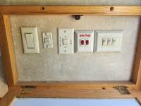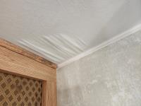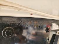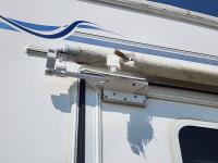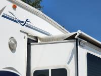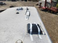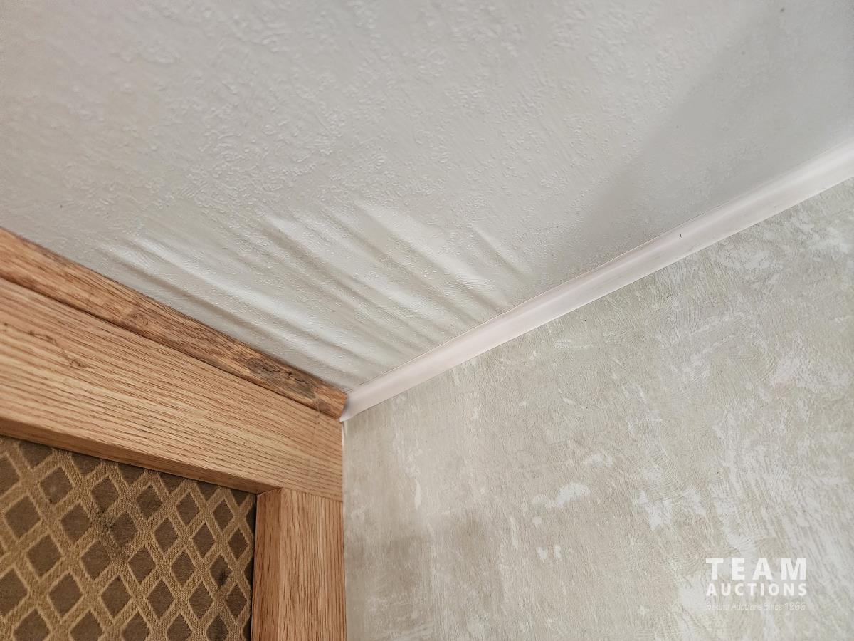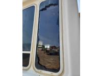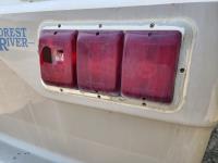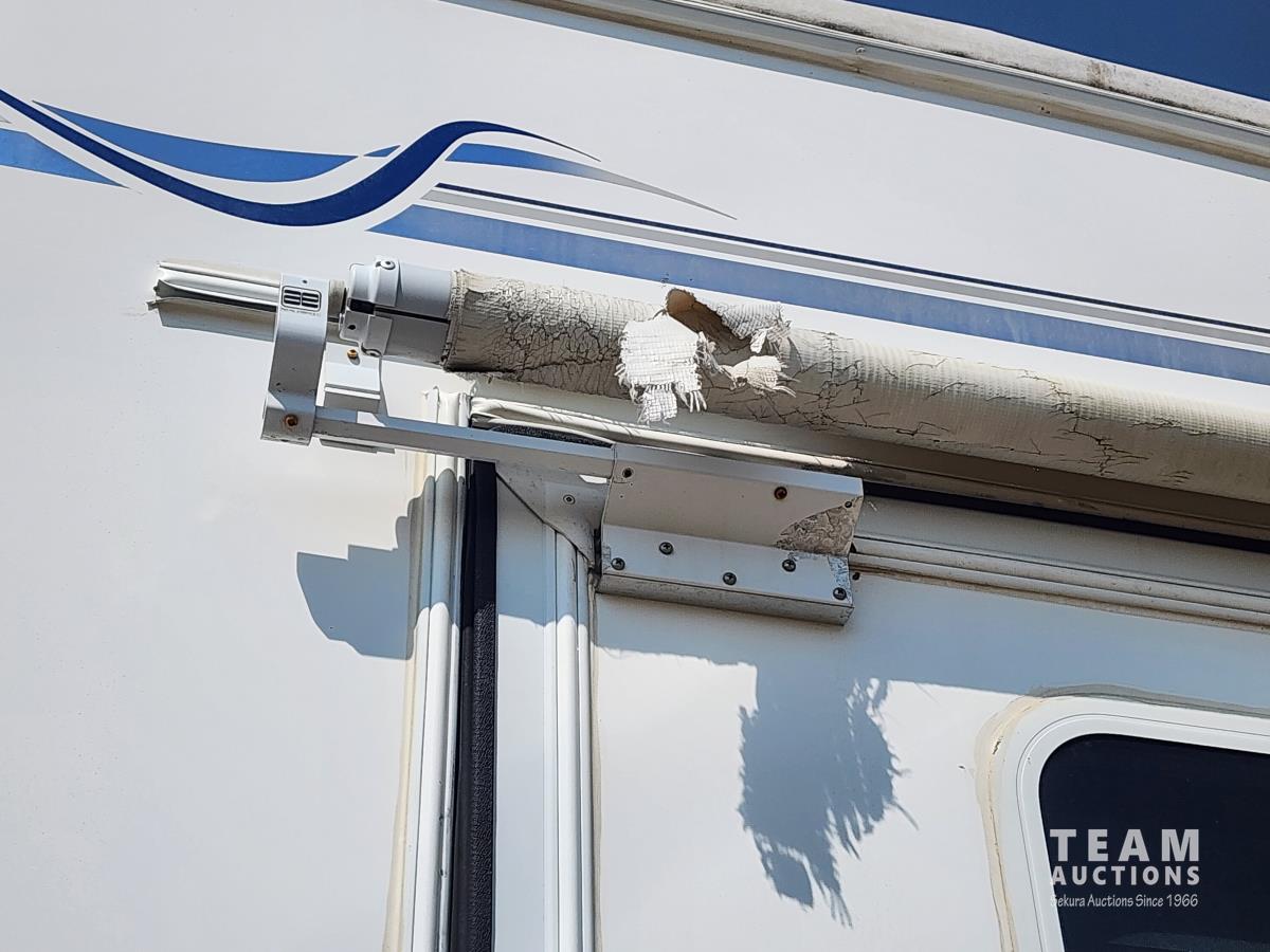 Broken tail light, broken back window, torn awning, missing A/C vent, bent slide, broken roof vents, broken glass in bedroom cupboard, water damage in back corner.