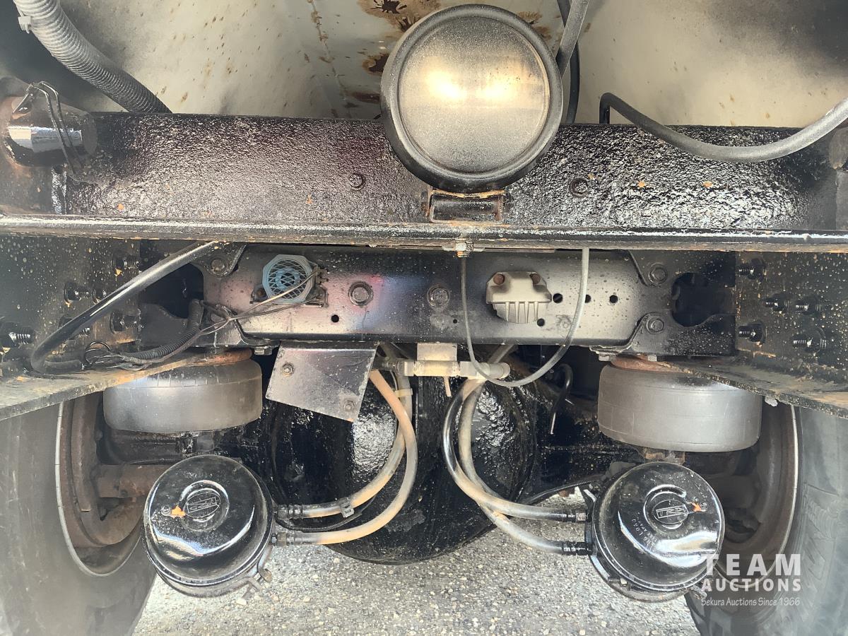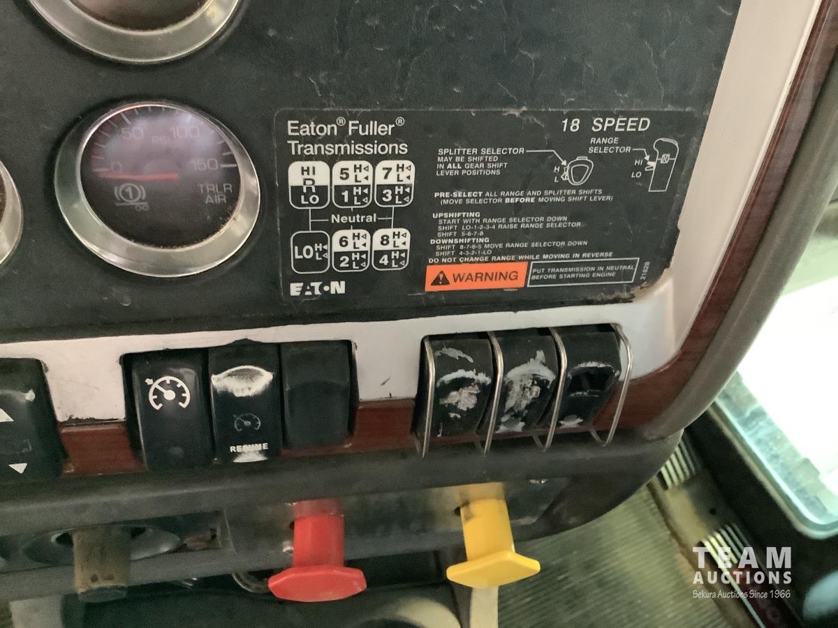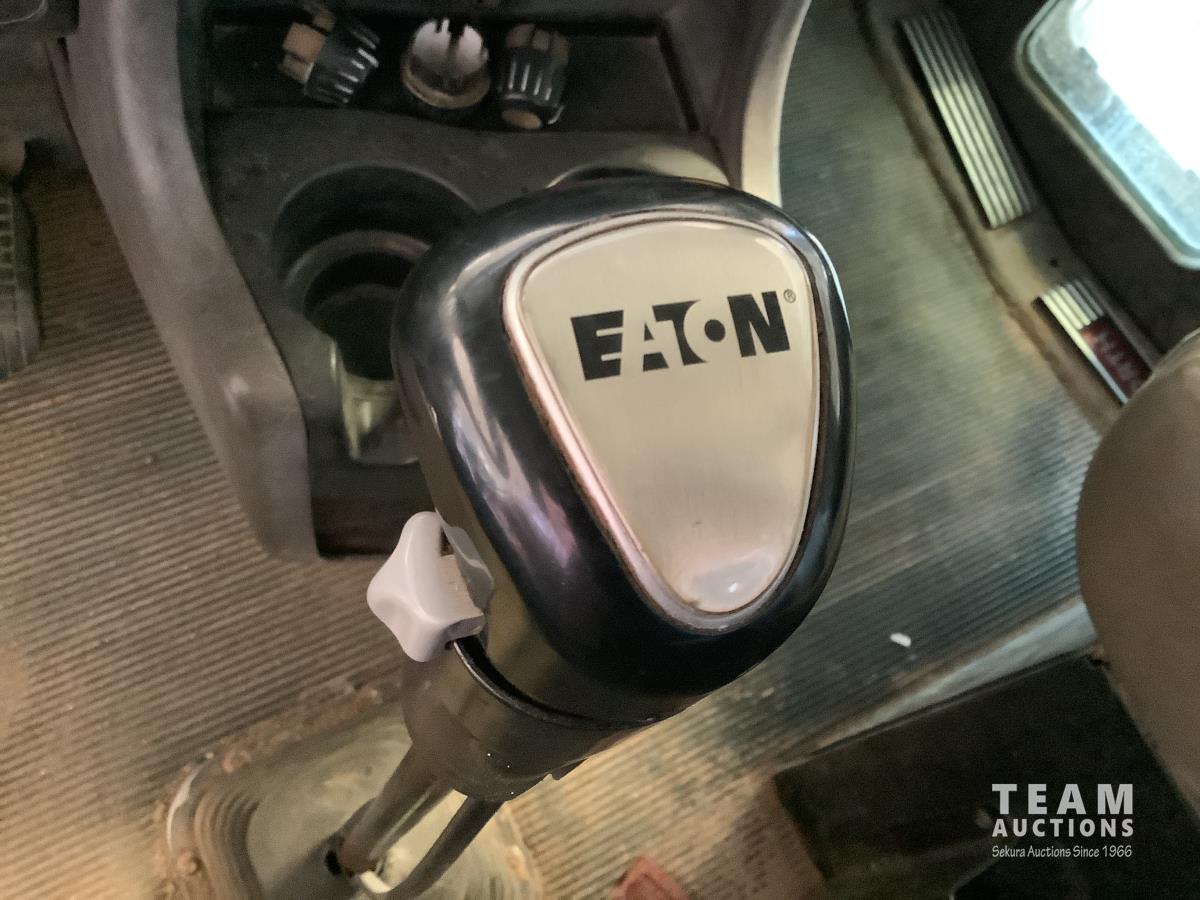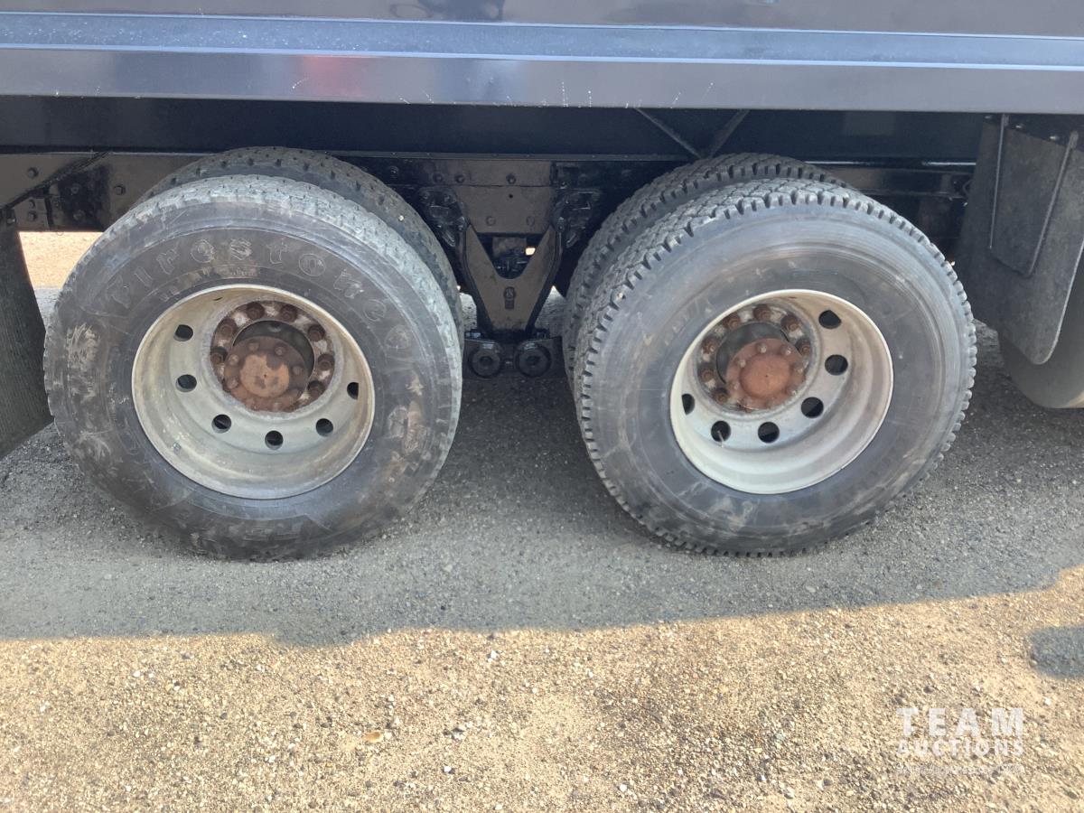 Caterpillar C15 engine, engine brake, Eaton Fuller 18 speed transmission, 15 ft steel box, rear small chute in the tail gate, in cab air shift controls for operating the box, air ride suspension, 46,000 lb rear axles, full lockers, all aluminum wheels, 11R24.5 rear tires