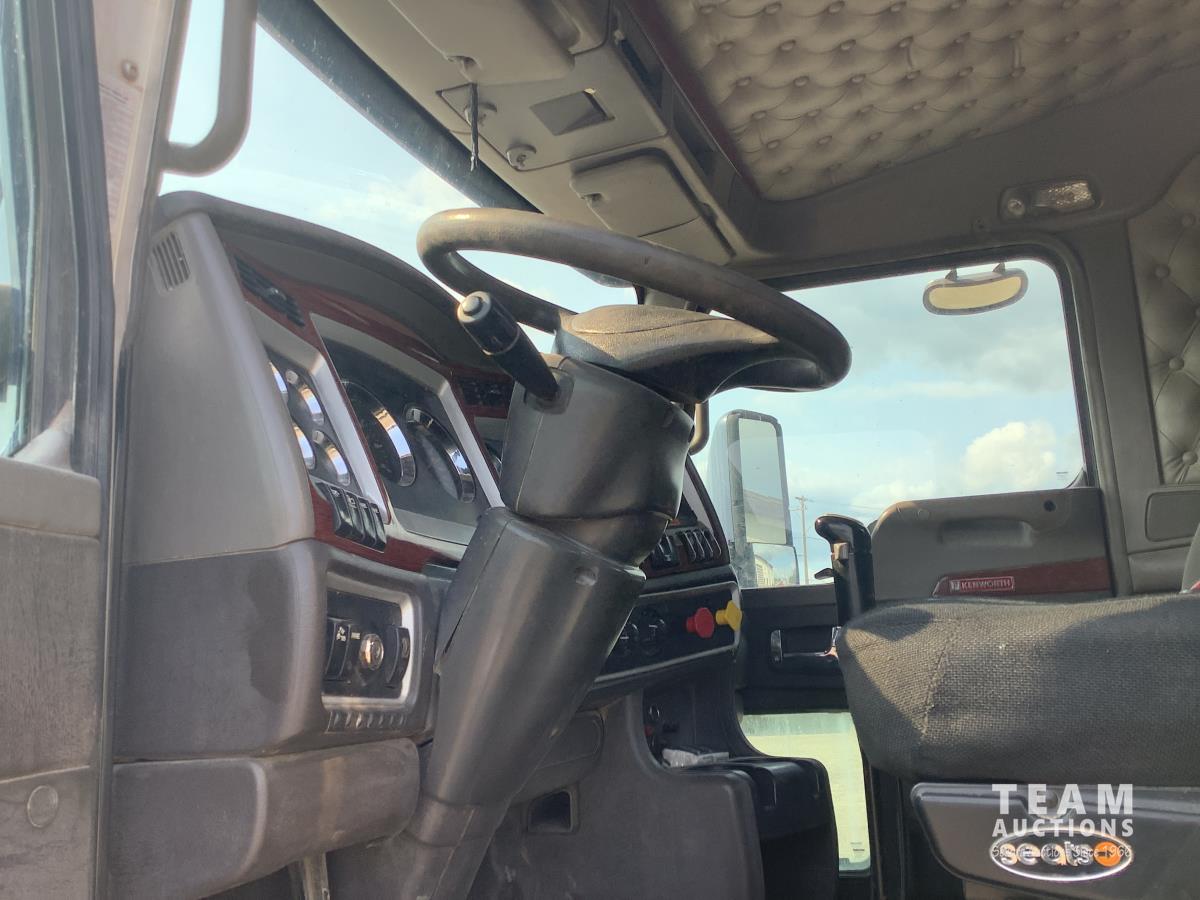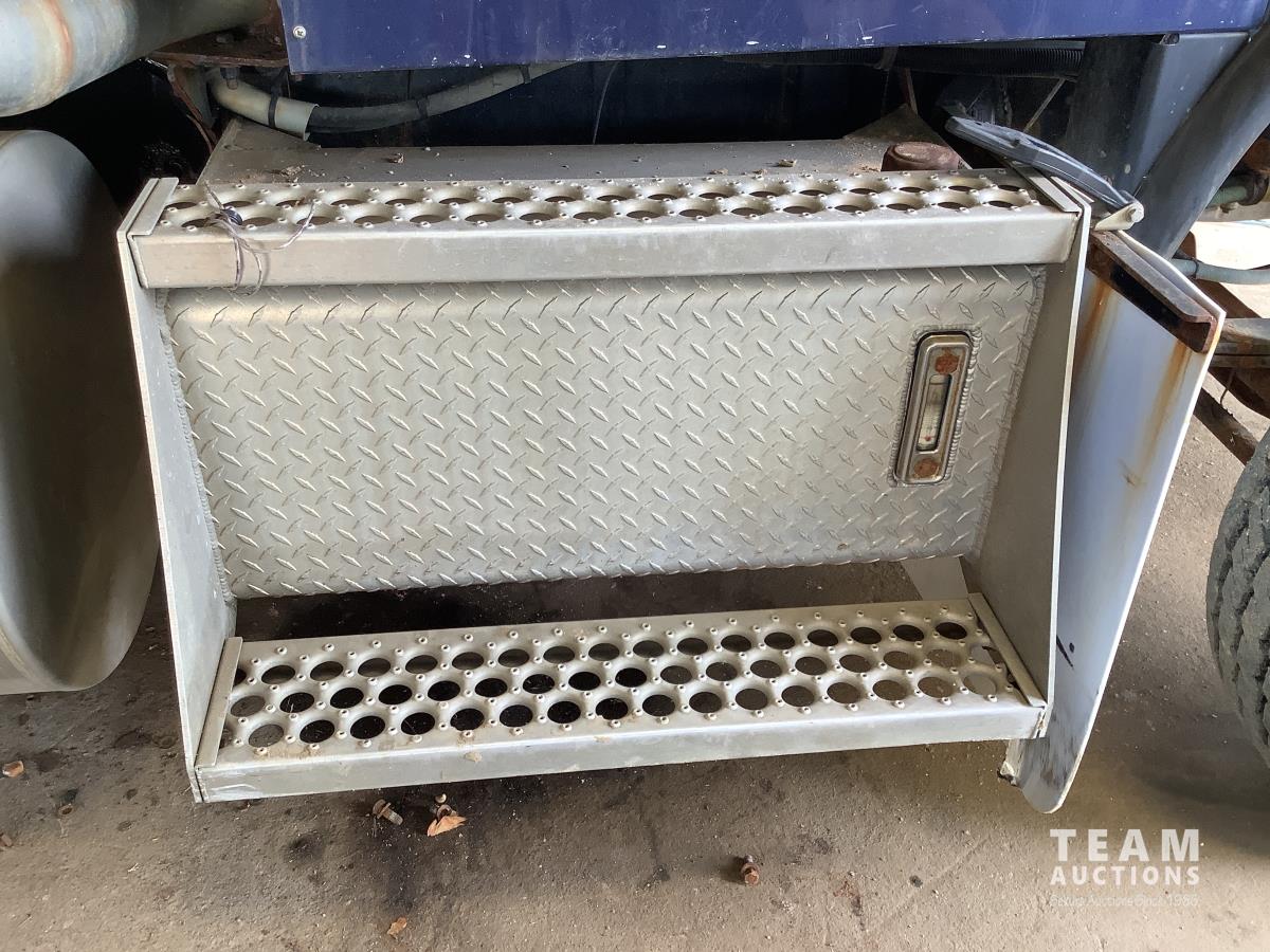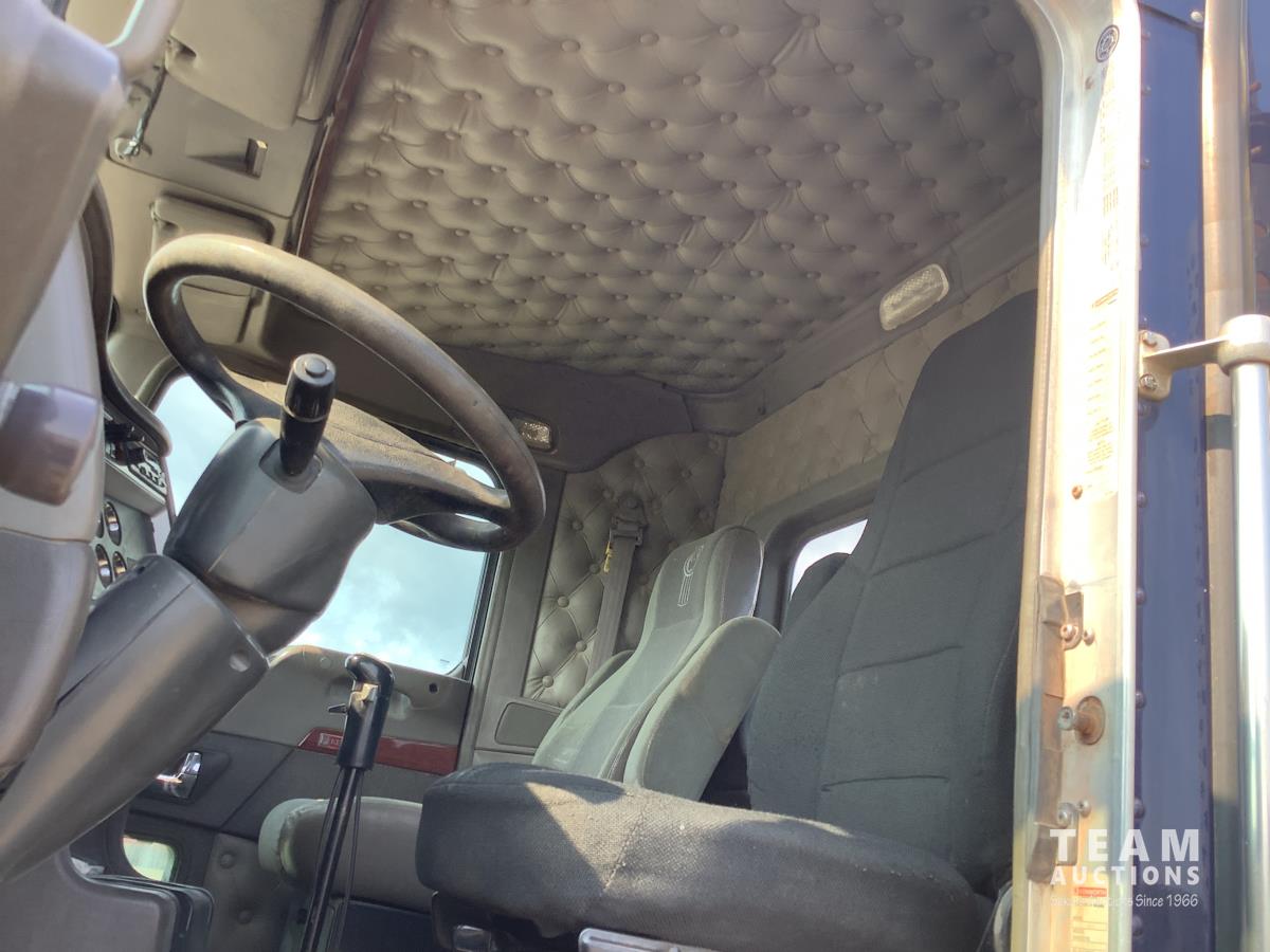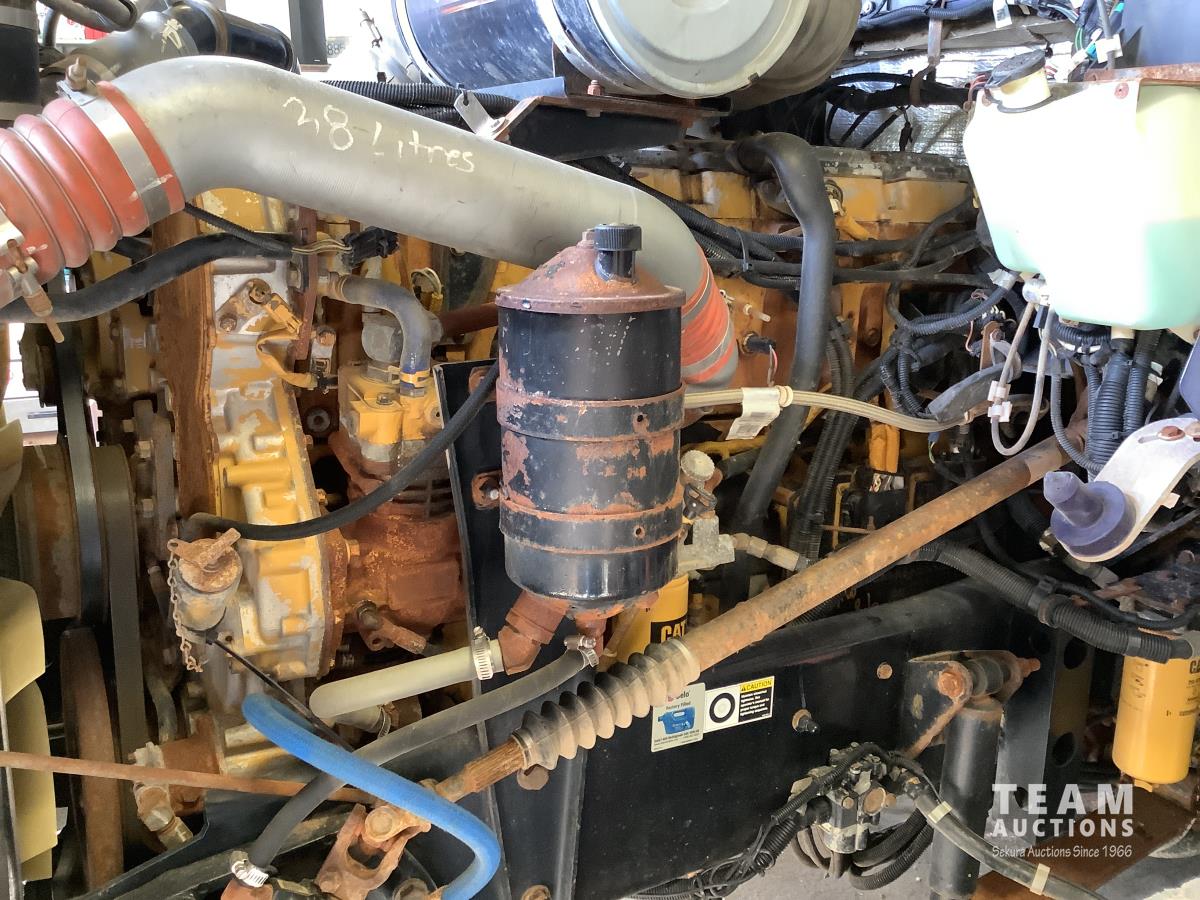 Caterpillar C15 engine, engine brake, Eaton Fuller 18 speed transmission, 15 ft steel box, rear small chute in the tail gate, in cab air shift controls for operating the box, air ride suspension, 46,000 lb rear axles, full lockers, all aluminum wheels, 11R24.5 rear tires