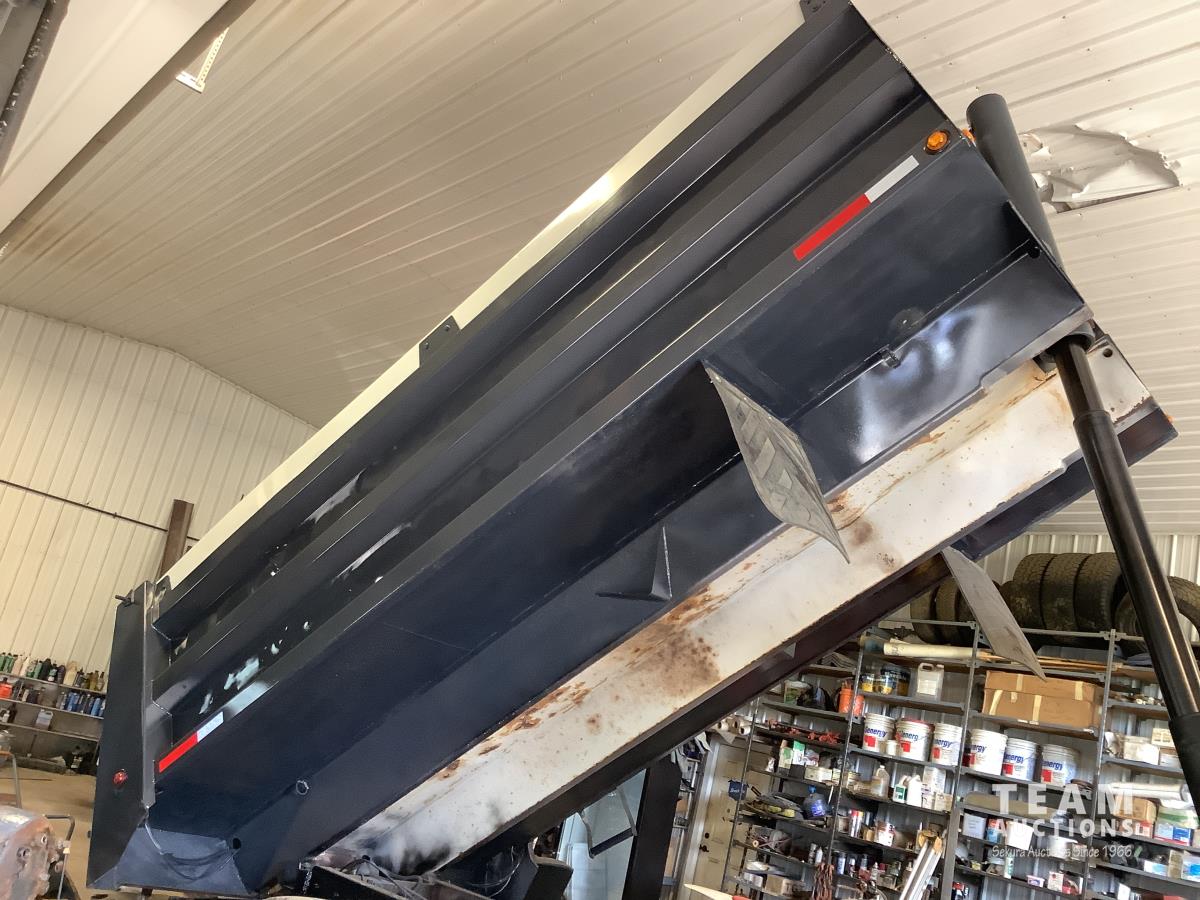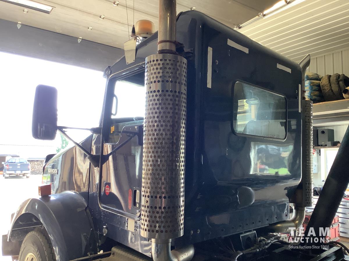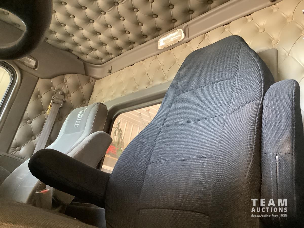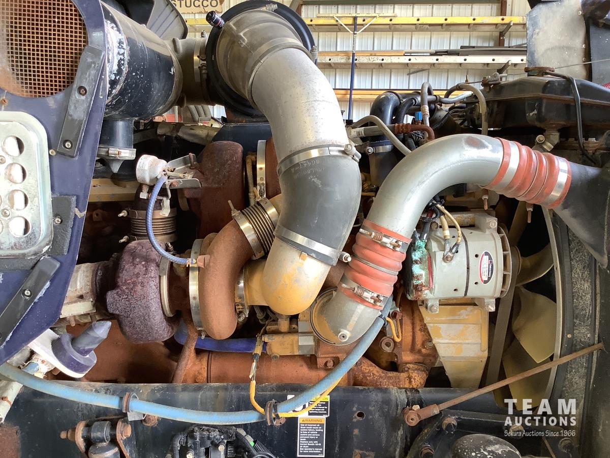 Caterpillar C15 engine, engine brake, Eaton Fuller 18 speed transmission, 15 ft steel box, rear small chute in the tail gate, in cab air shift controls for operating the box, air ride suspension, 46,000 lb rear axles, full lockers, all aluminum wheels, 11R24.5 rear tires