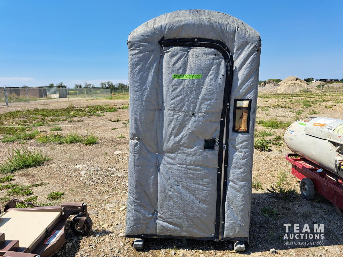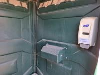 On skid, hand sanitizer station, urinal, toilet, paper towel holder