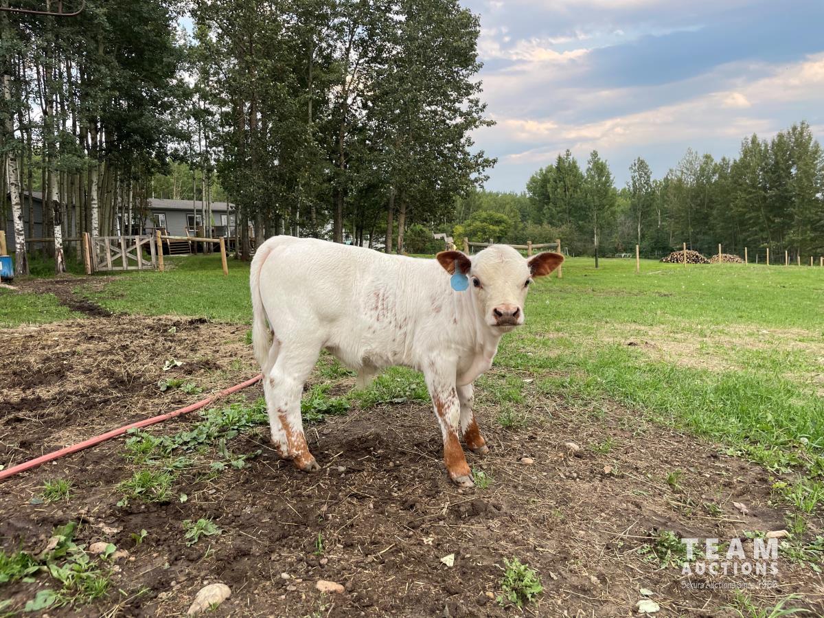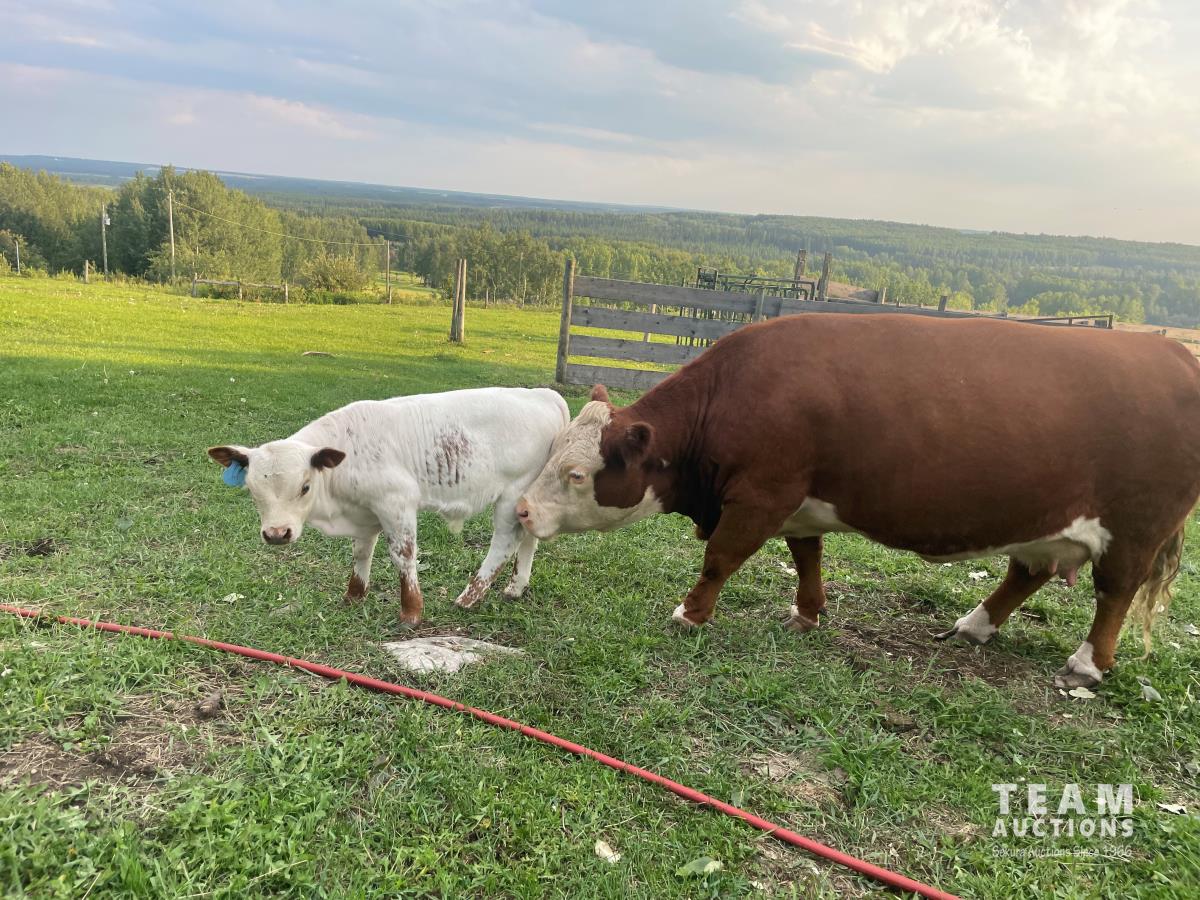 Calf is from the bull snowy. Her name is Lotto. She is a pet and the bull has been in the pen with her for past while. Calf sells with cow.