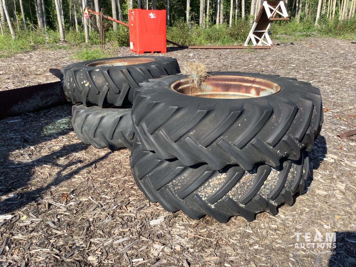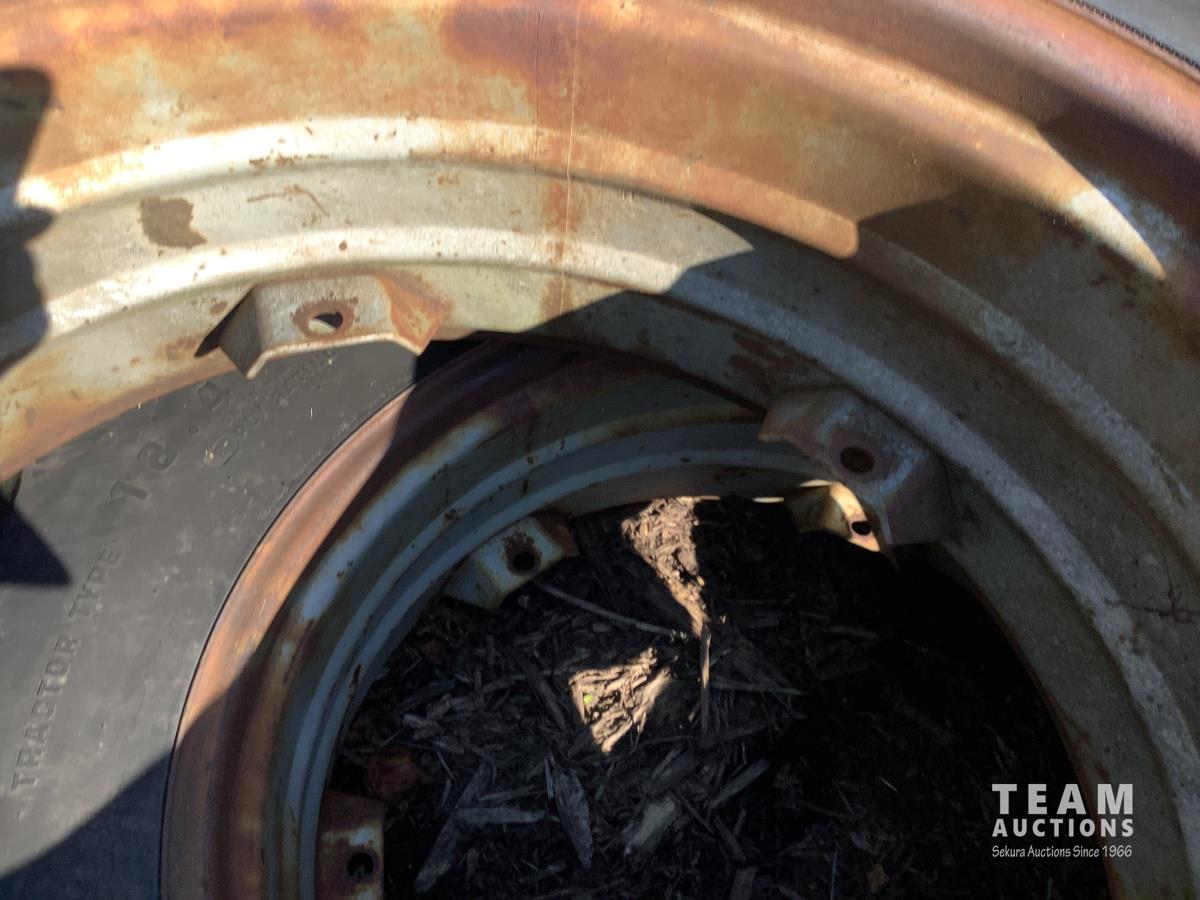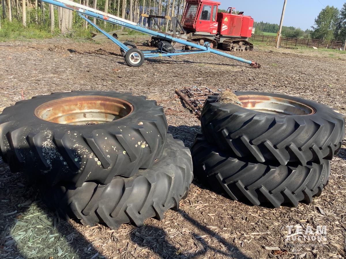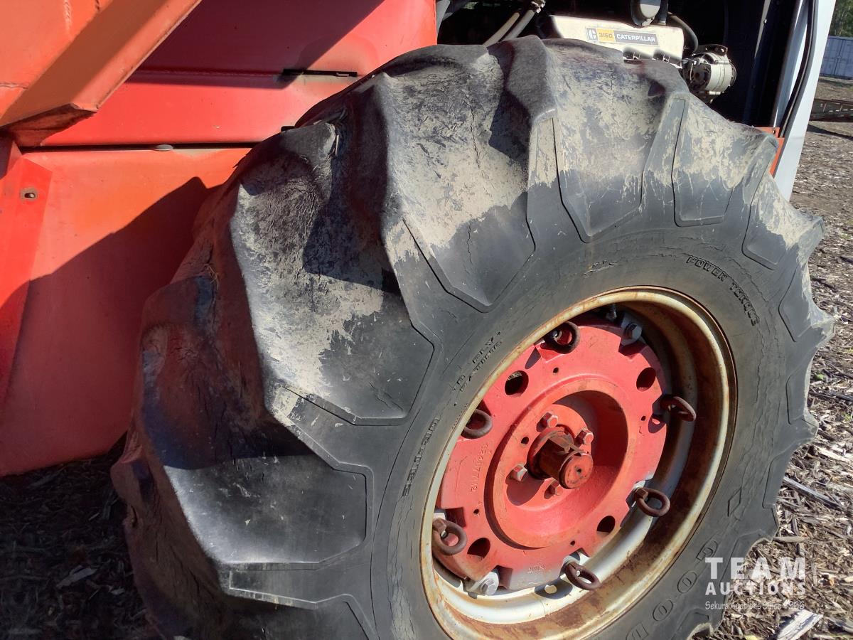 Caterpillar 3150 engine, 12 speed manual transmission, cab, A/C, heat, 2 rear hydraulic outlets, 23.1X30 tires with a set of 18.4X34 duals (all hardware is there but only 3 spacers), rear mounted hydraulic round bale carrier, rear mounted snow blade