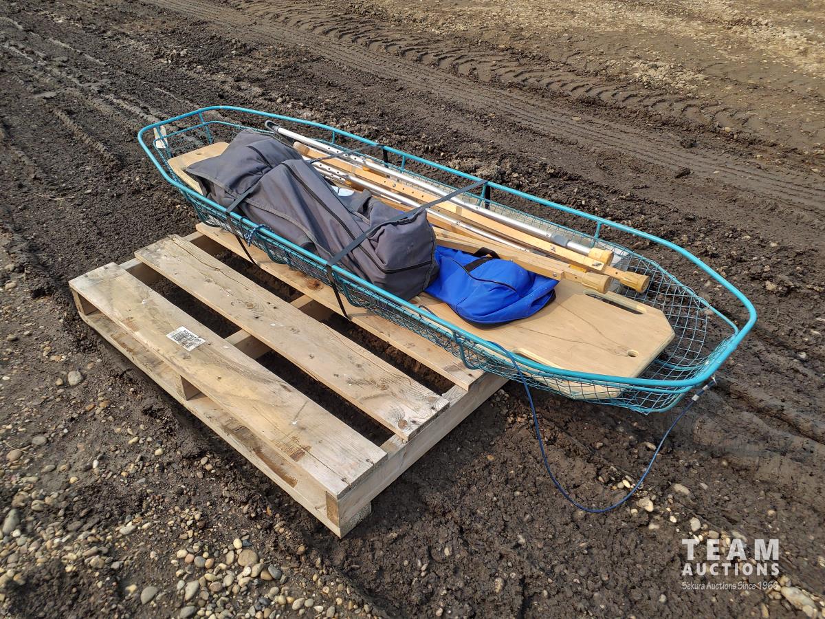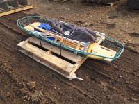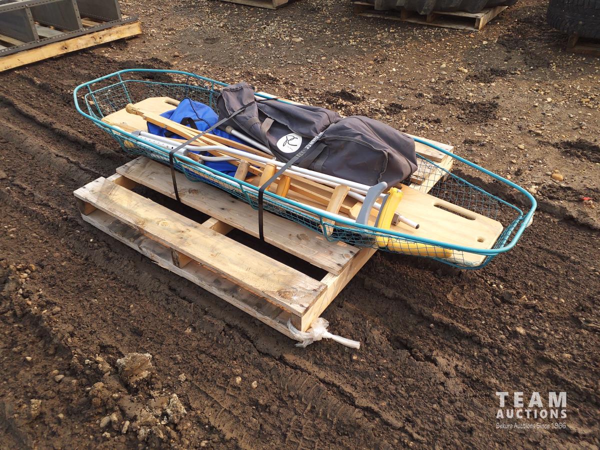 Medical stretcher, back board, neck braces, (2) sets of crutches