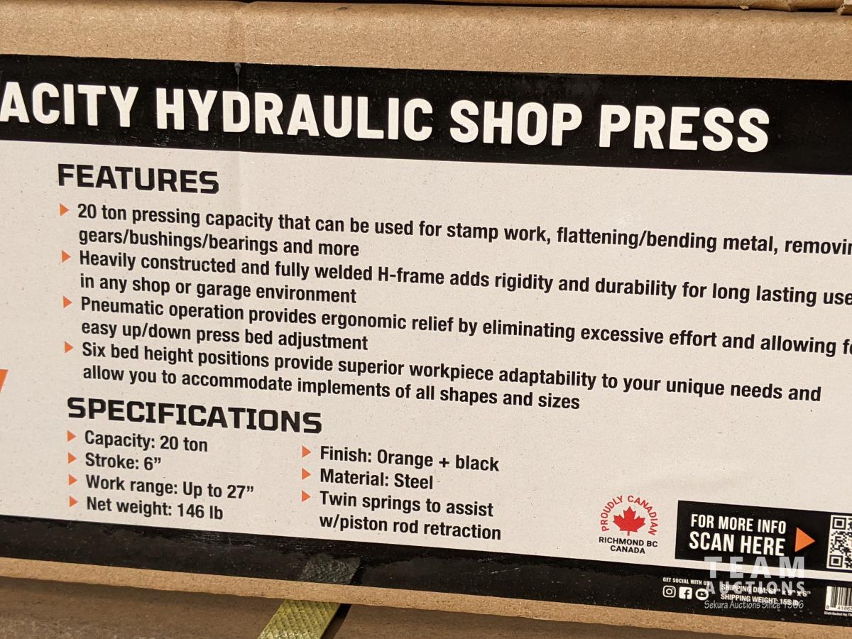 2025 20 Ton Capacity Hydraulic Shop Press (Unused)