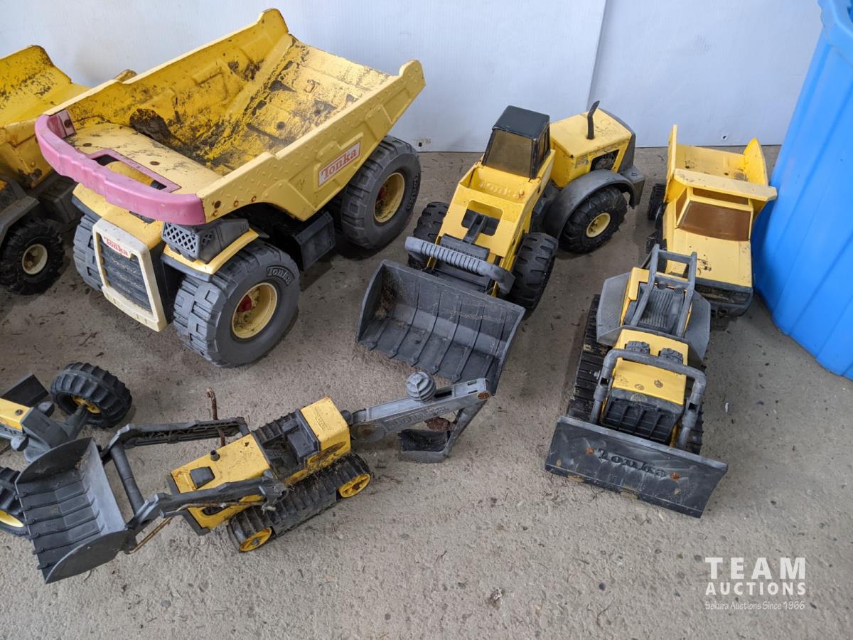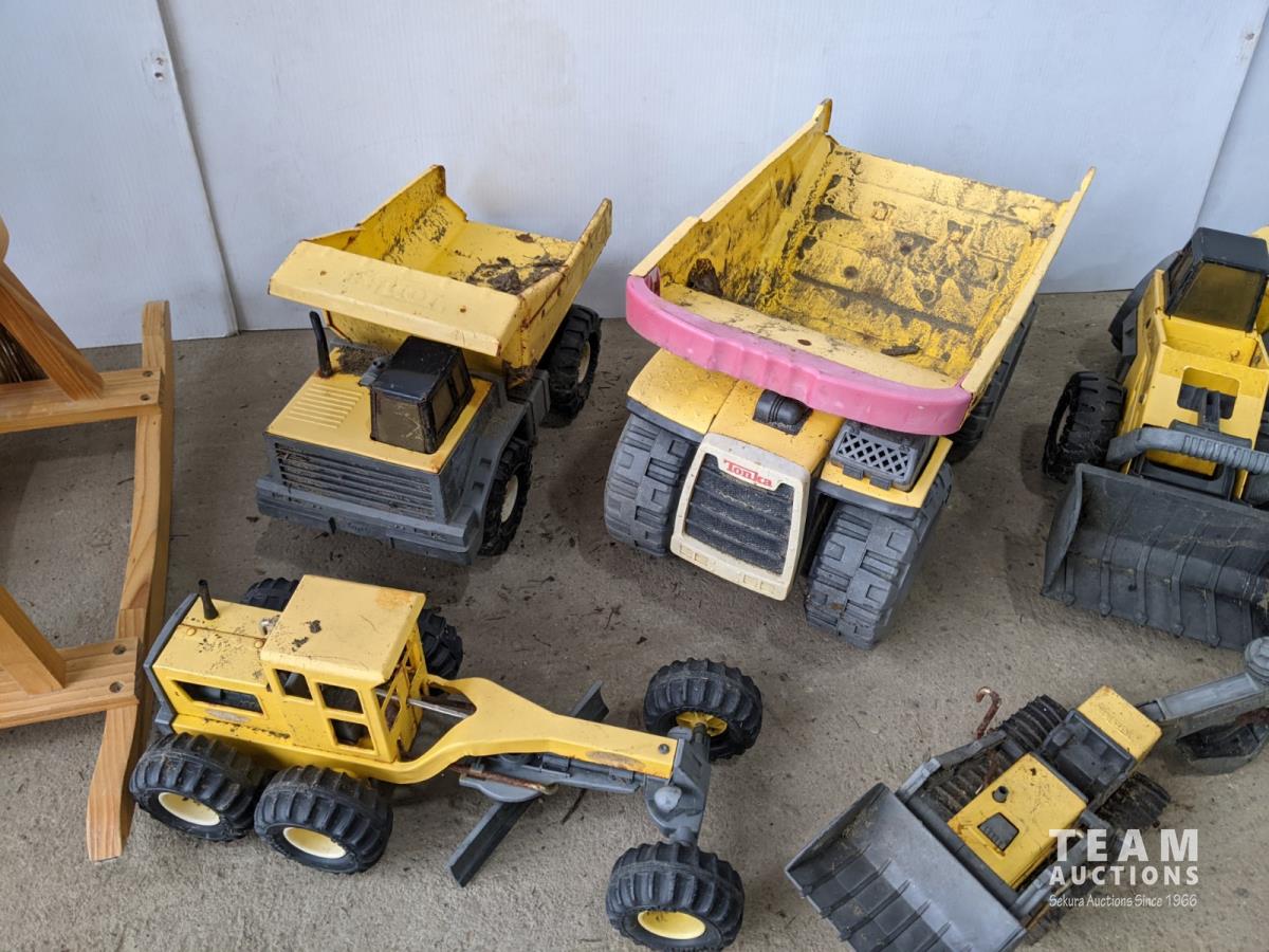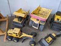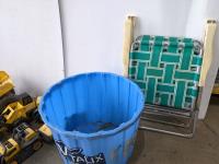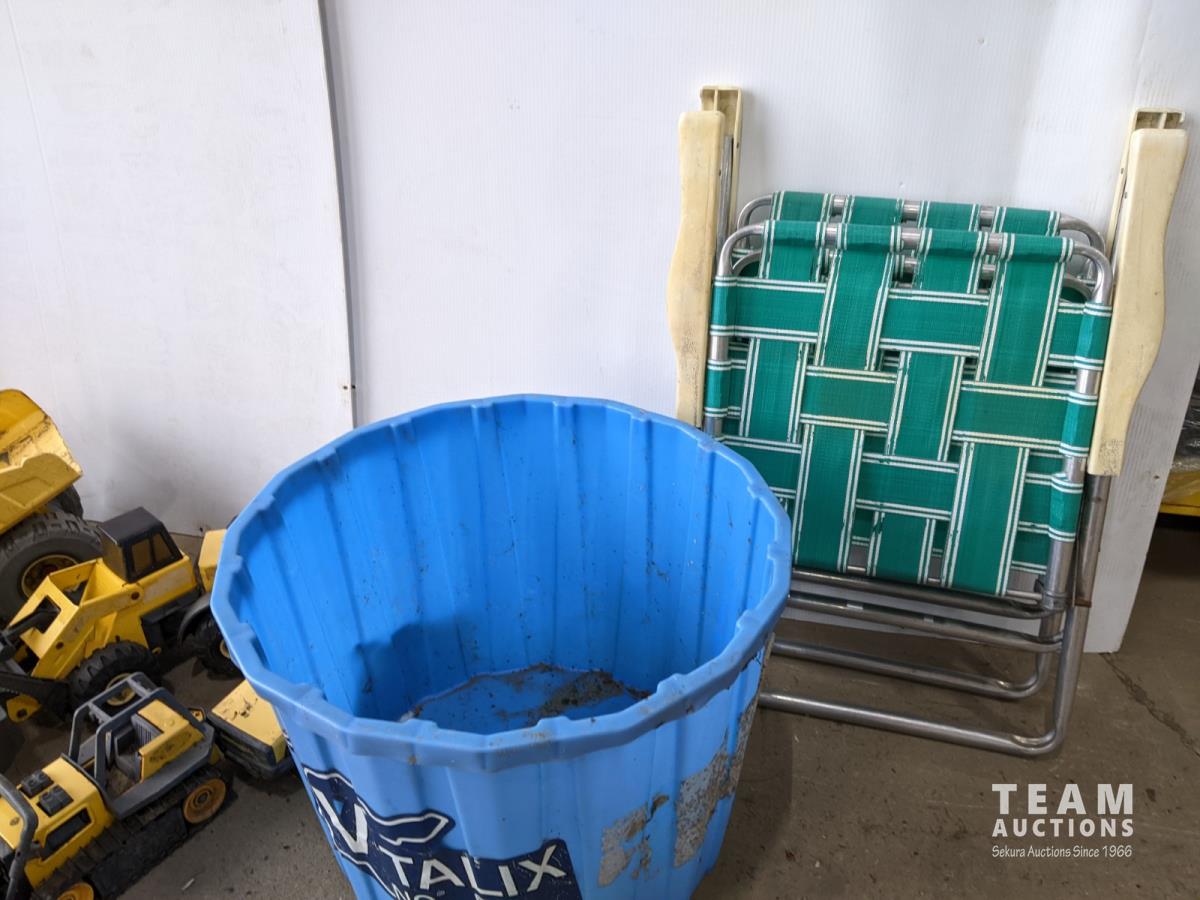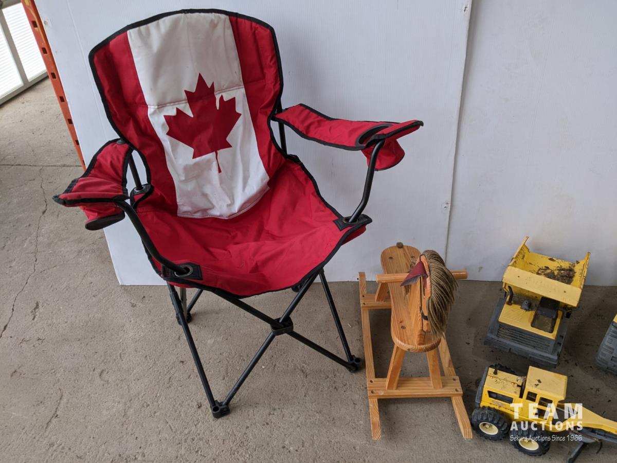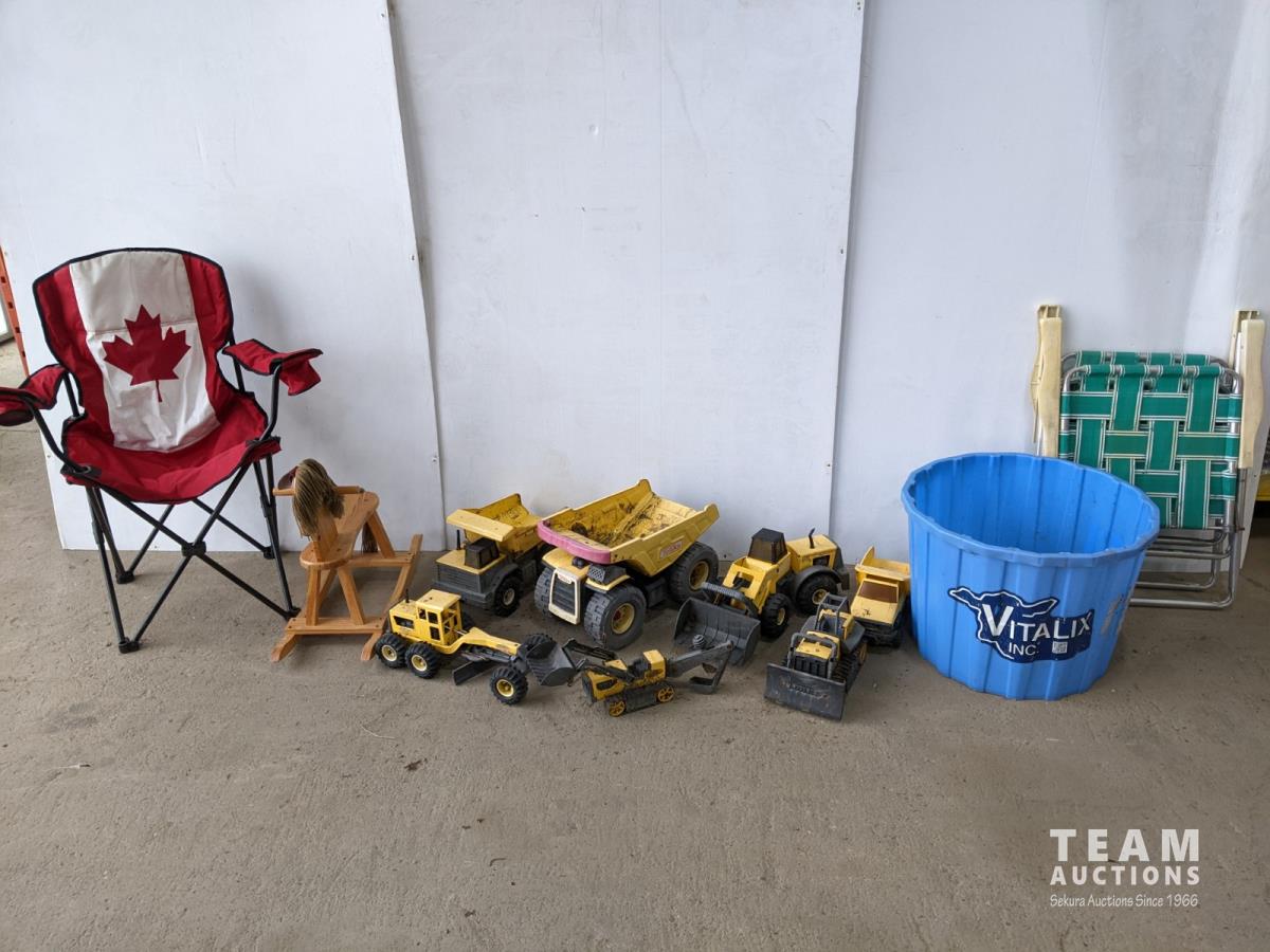 1598 (3) Folding Lawn Chairs, (7) Toy Trucks and Rocking Horse