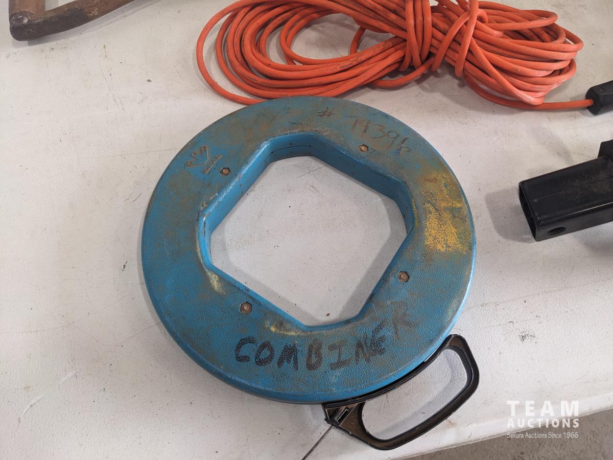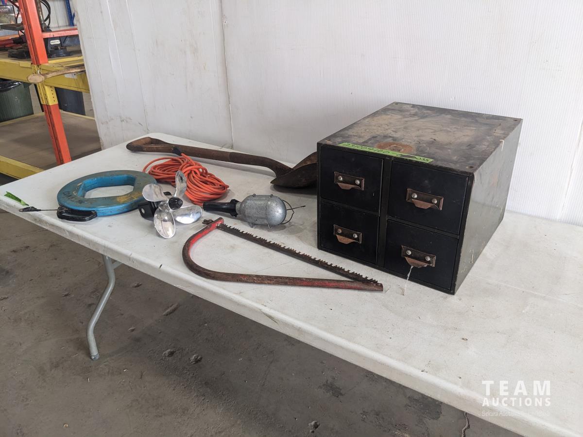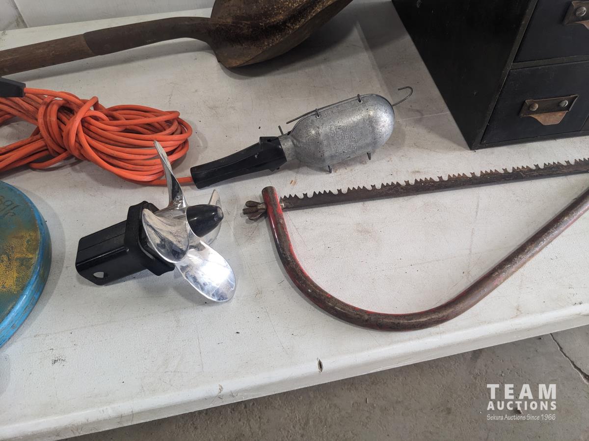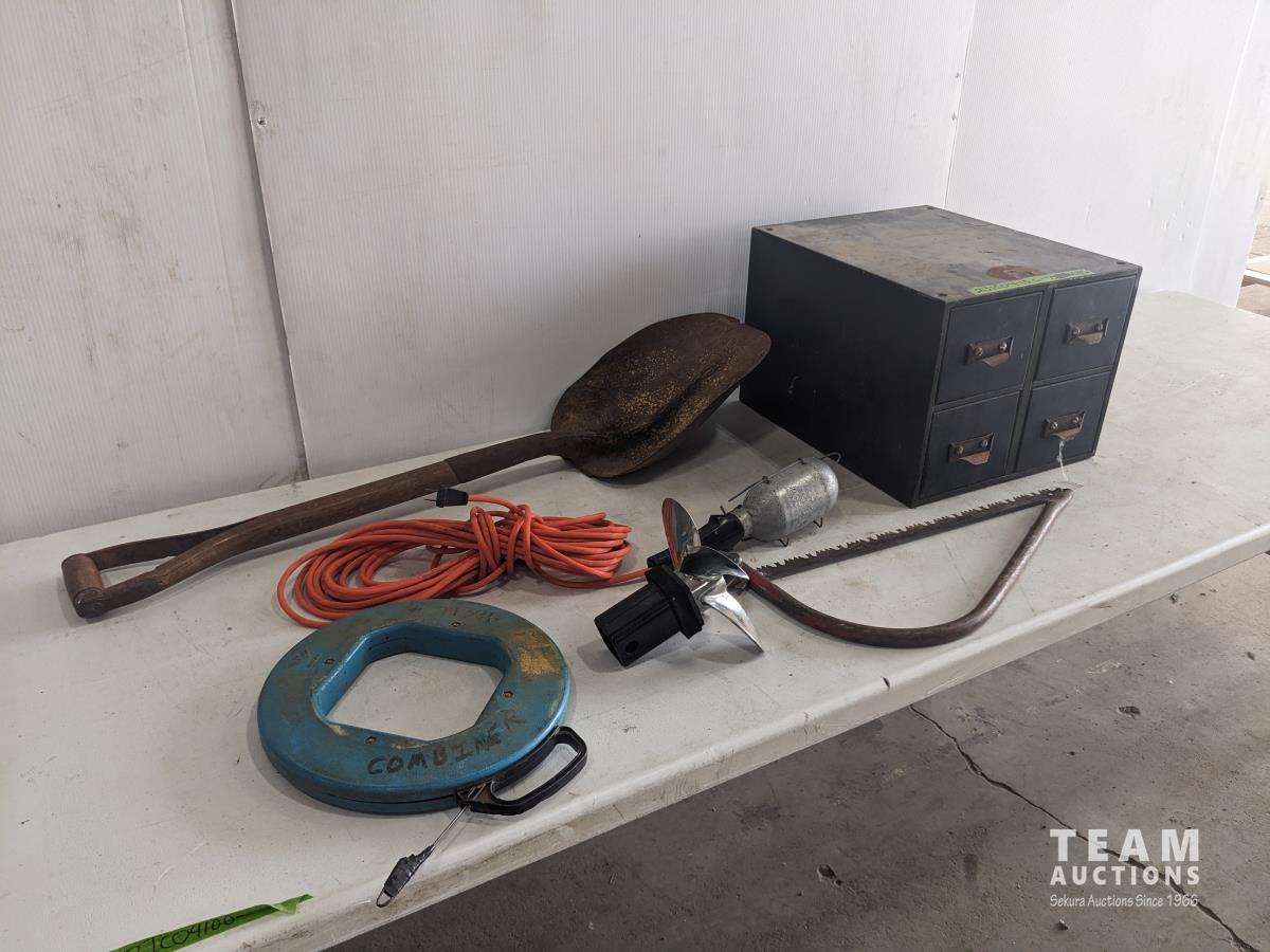Fish tape, trouble light, shovel, saw, 4 drawer cabinet