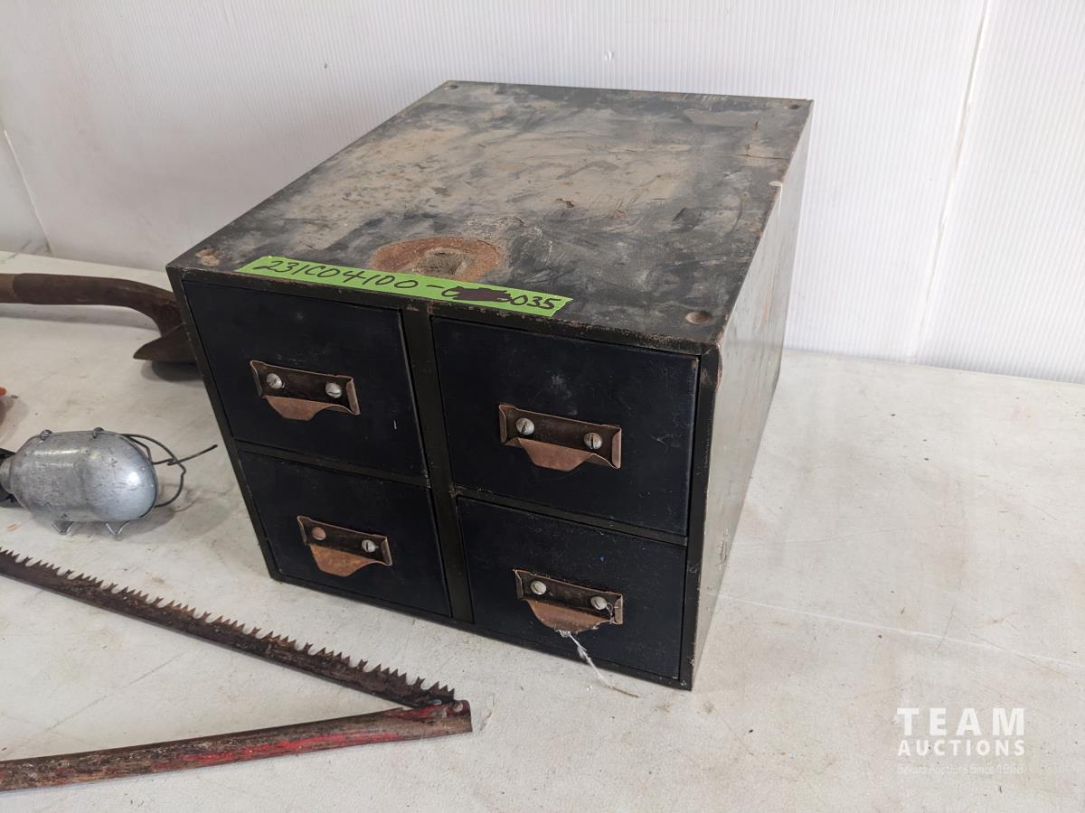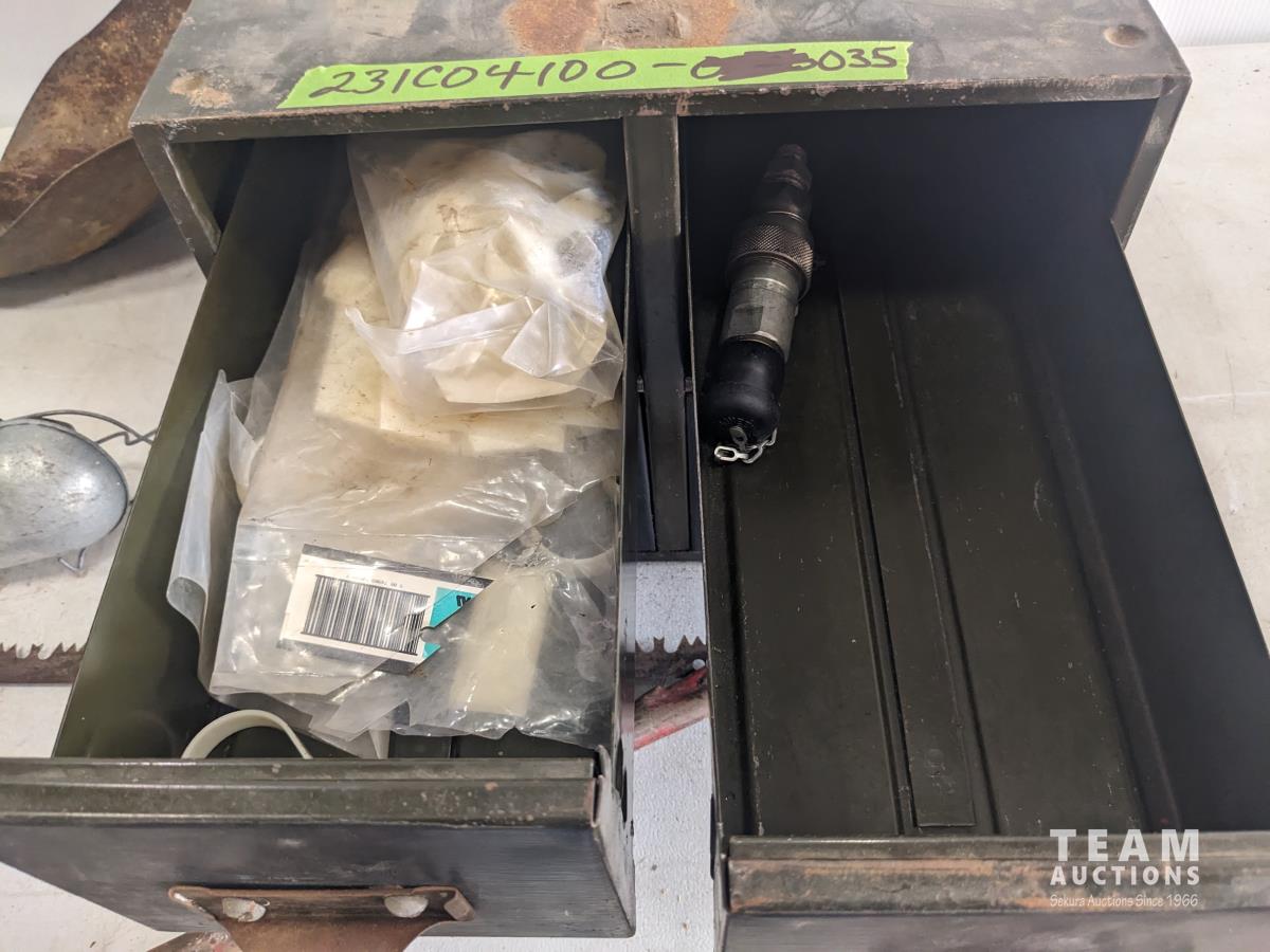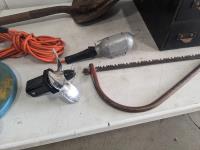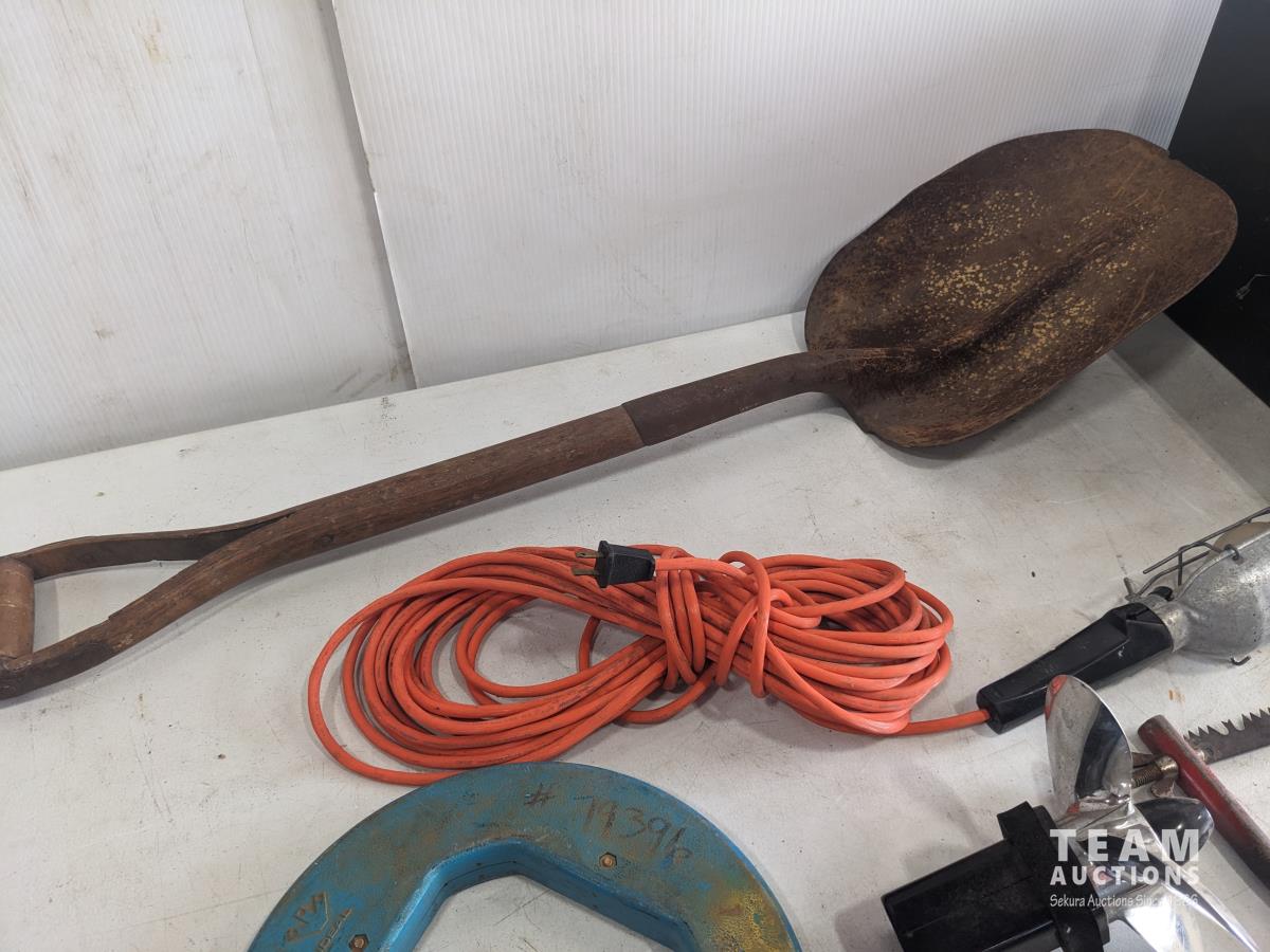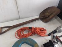 Fish tape, trouble light, shovel, saw, 4 drawer cabinet