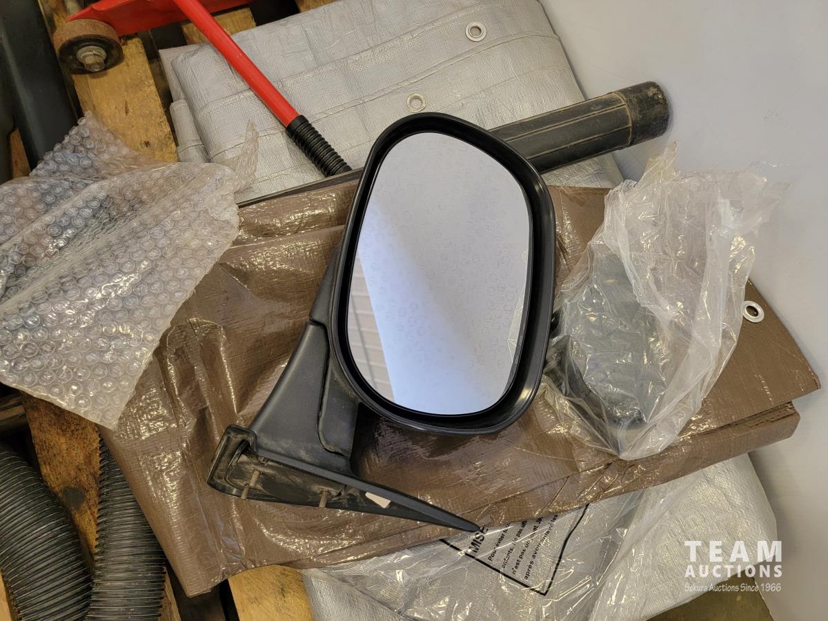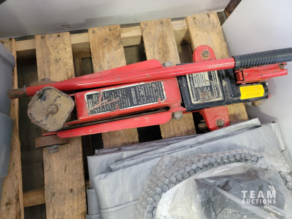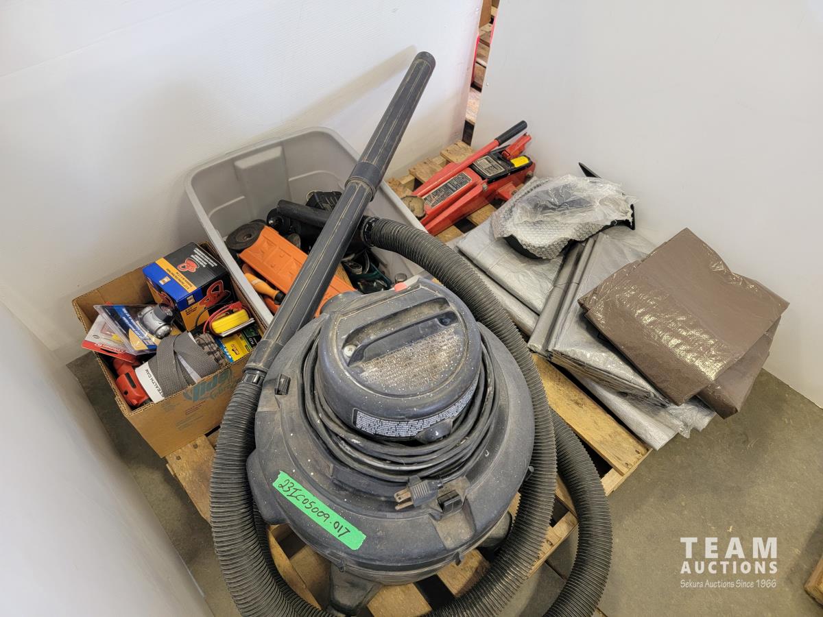 Shop vac, 3000 lb floor jack, (3) tarps, truck mirror