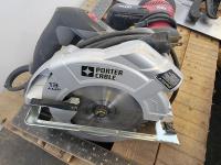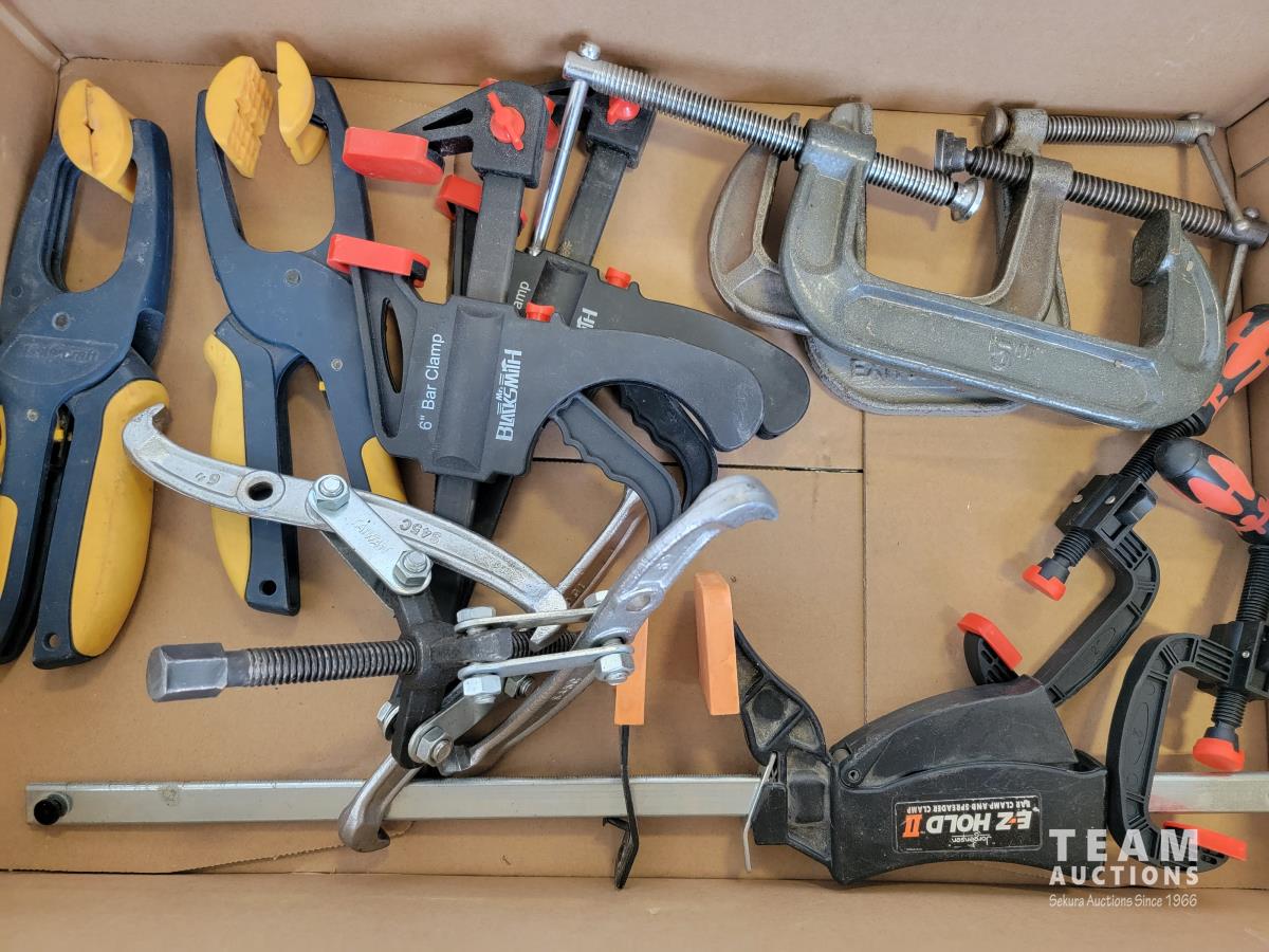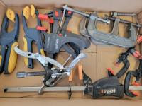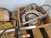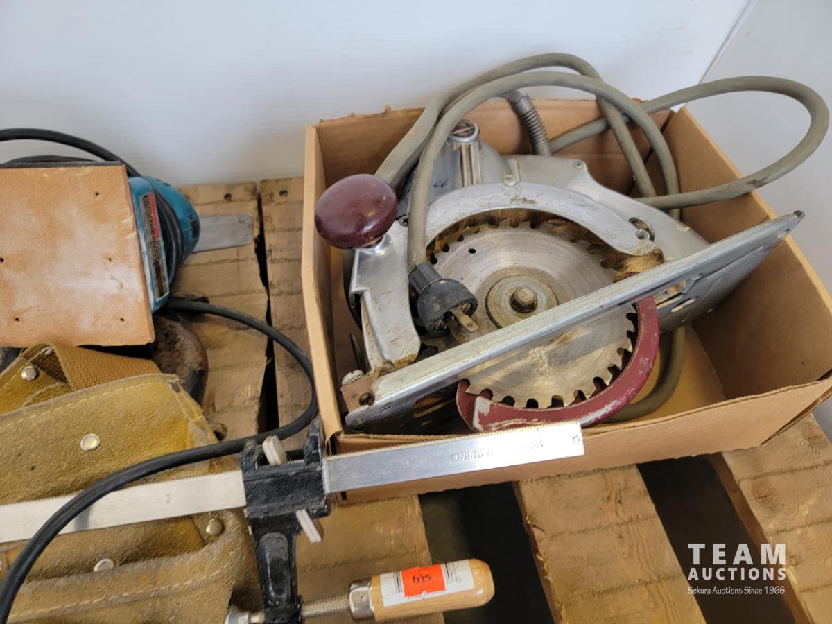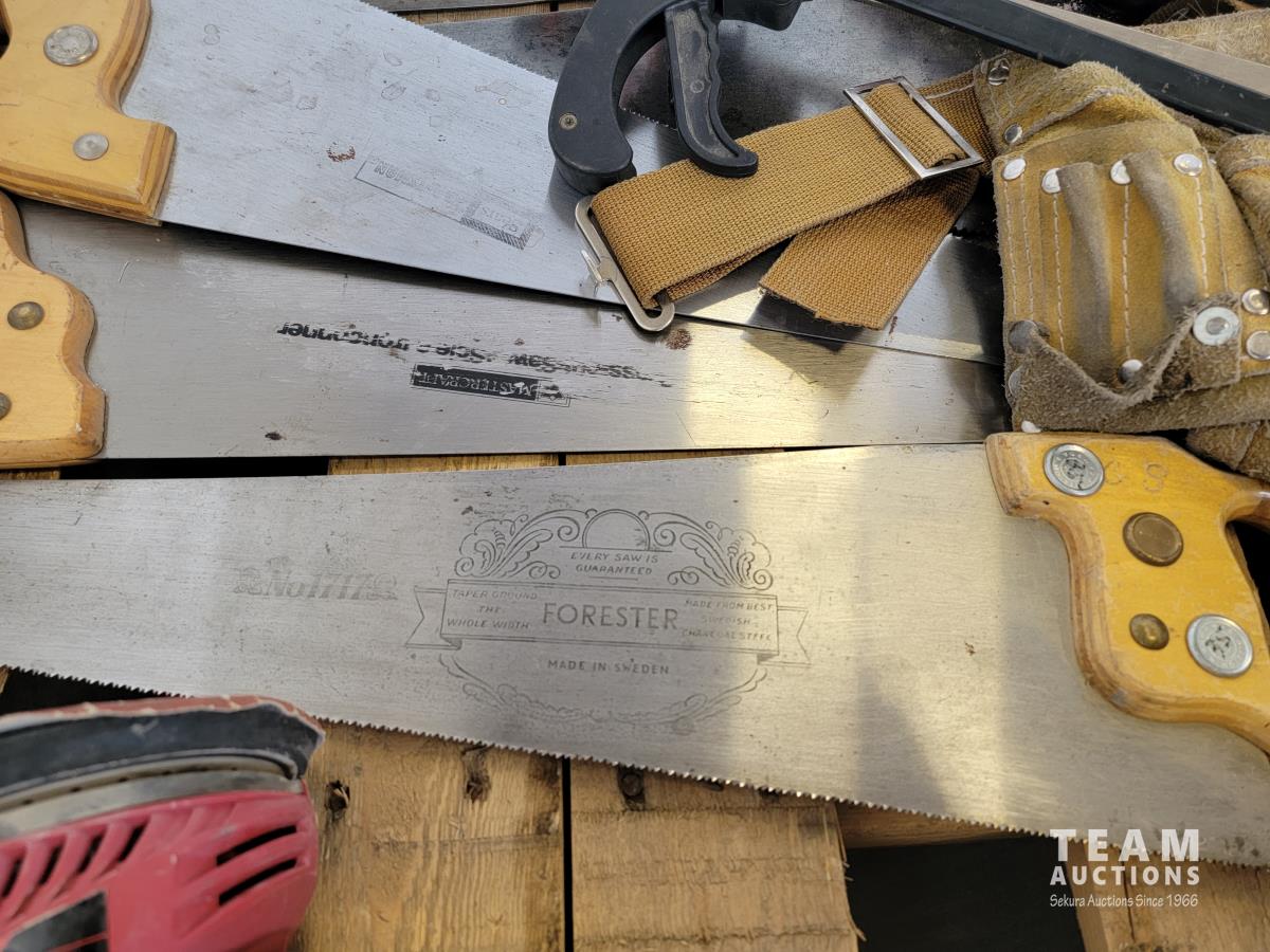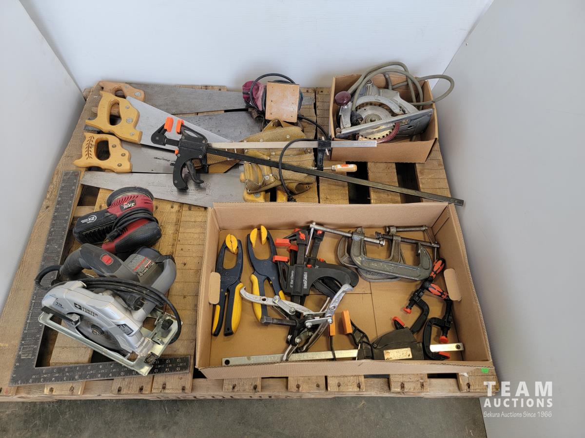(2) circular saws, (2) electric sanders, assorted clamps, qty of saws, tool belt, large square