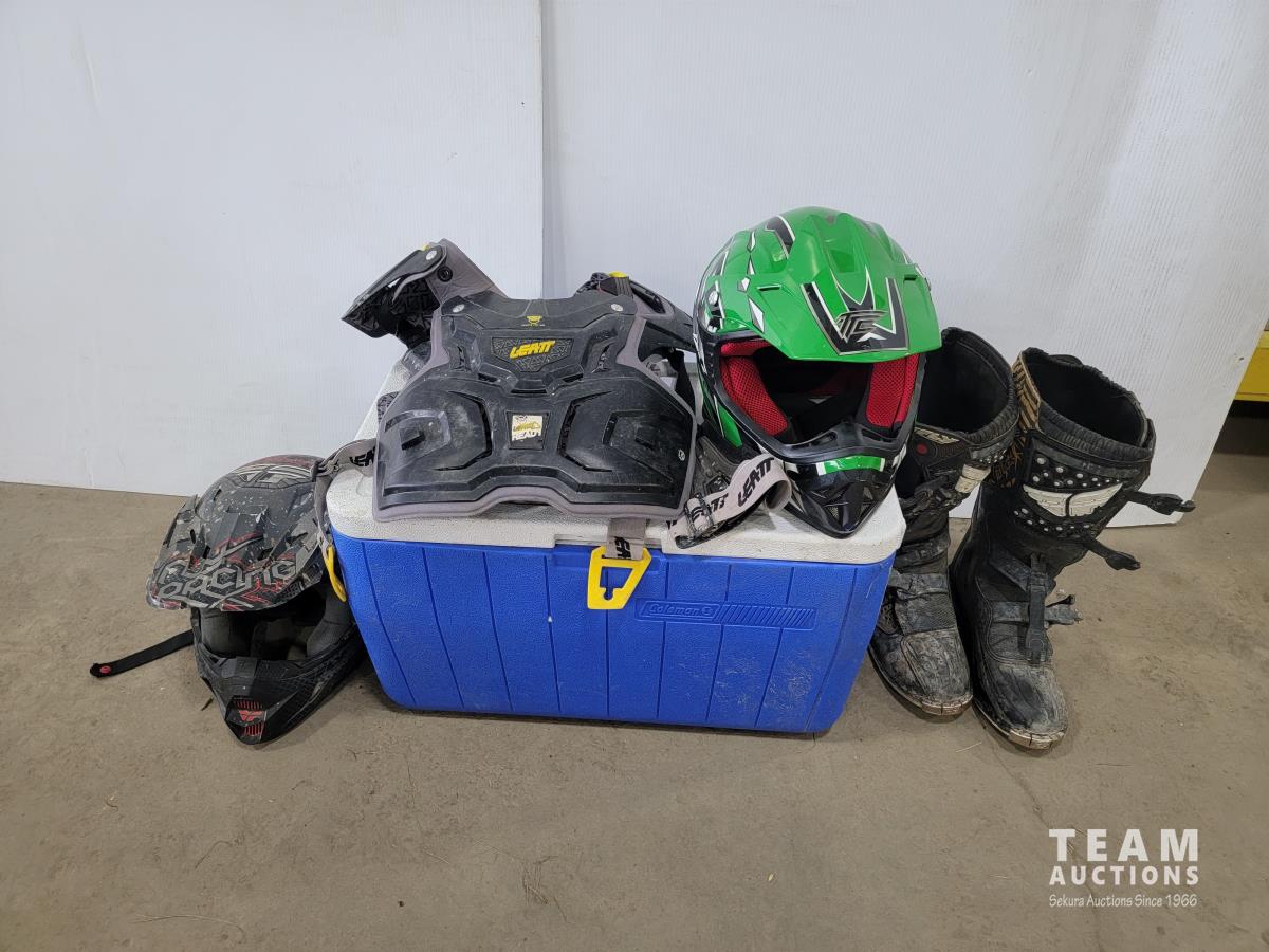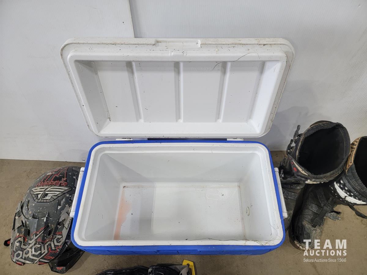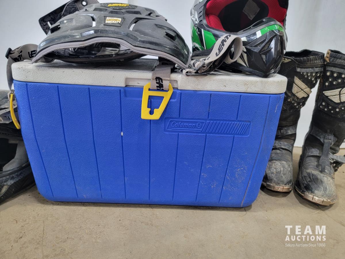 1191 Cooler, (2) ATV Helmets, Chest Protector and Dirt Bike Boots