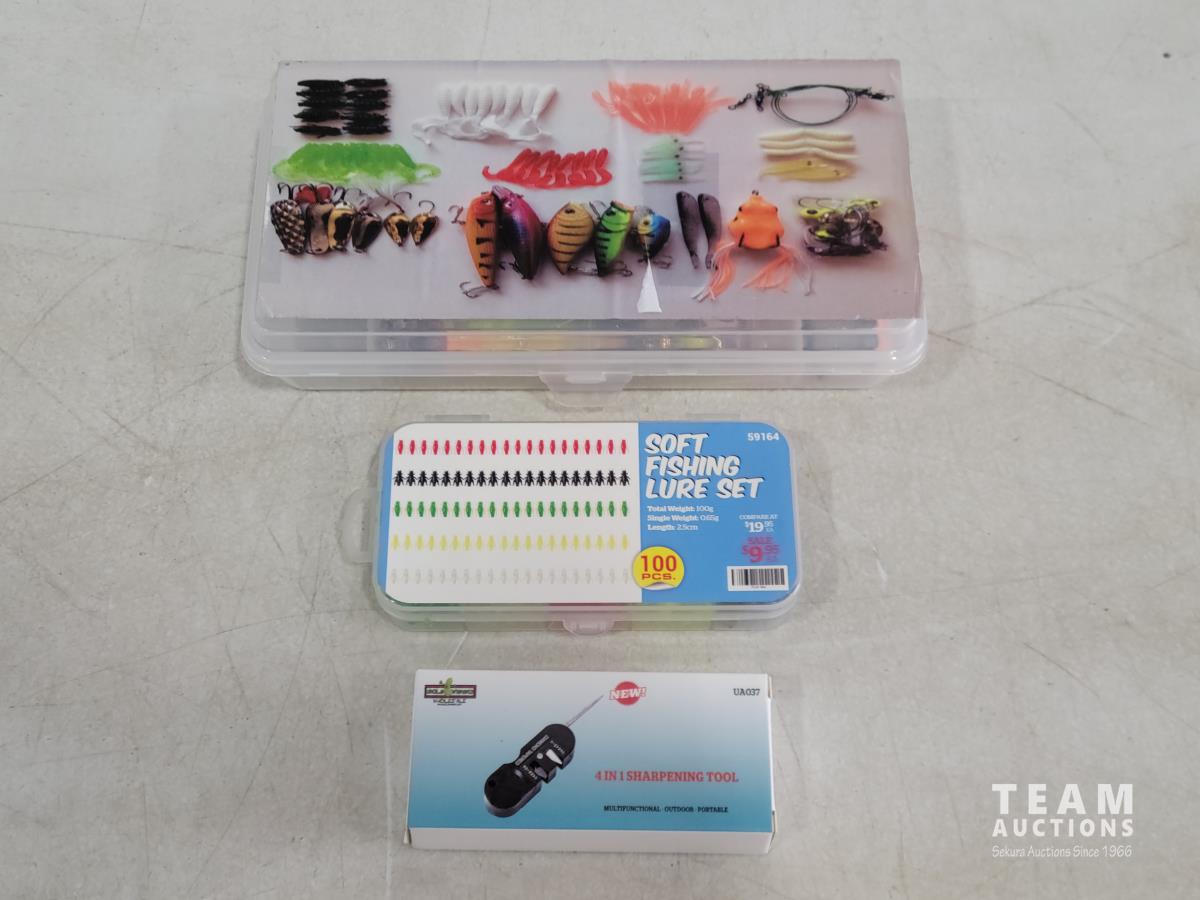 1761 Fishing Lure Kit, 100 Piece Soft Fishing Lure Set and 4 in 1 Sharpening Tool (Unused)