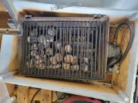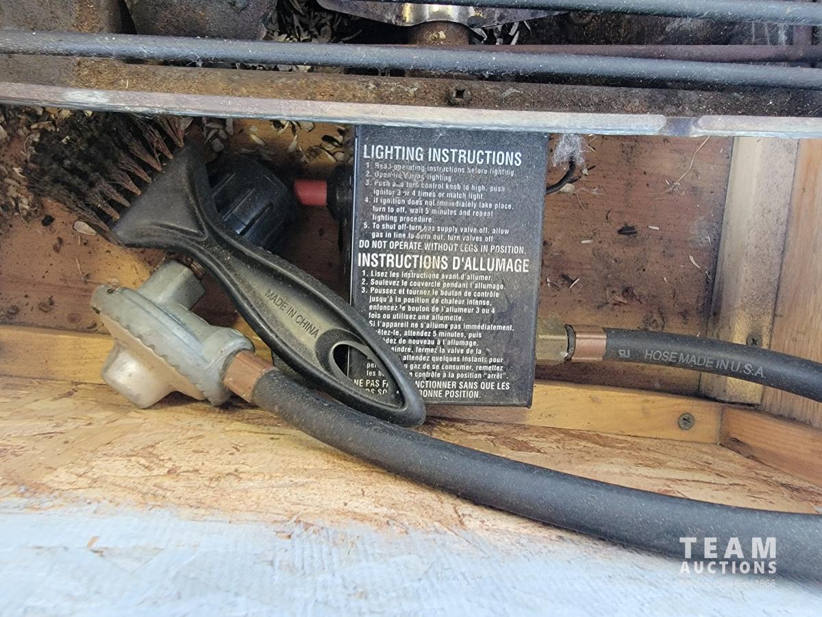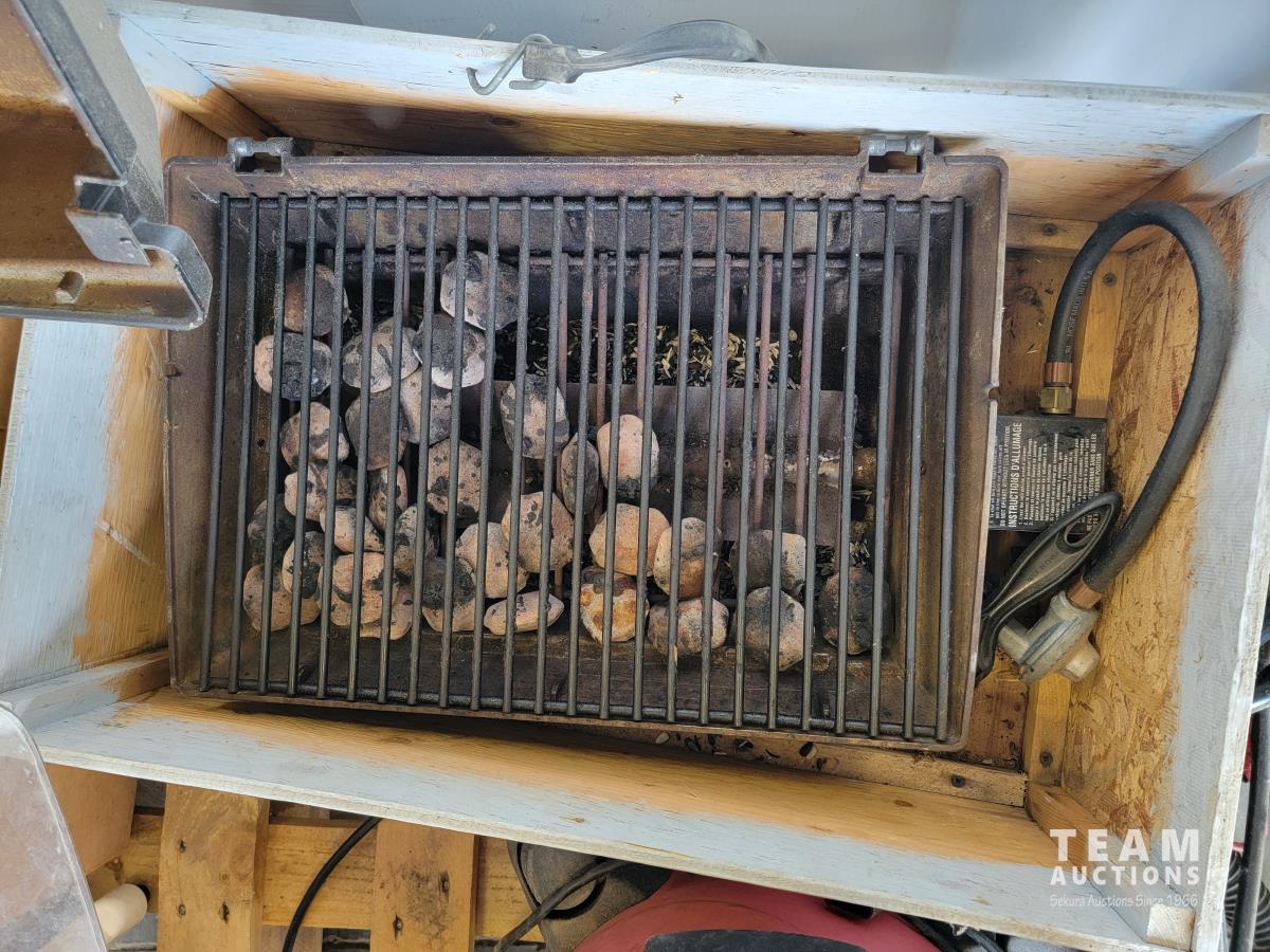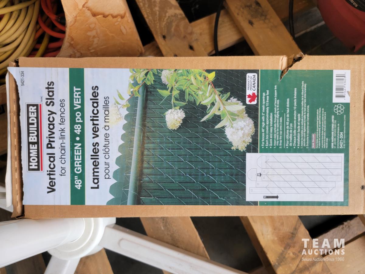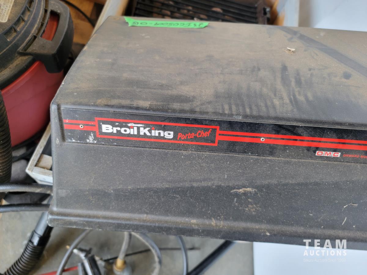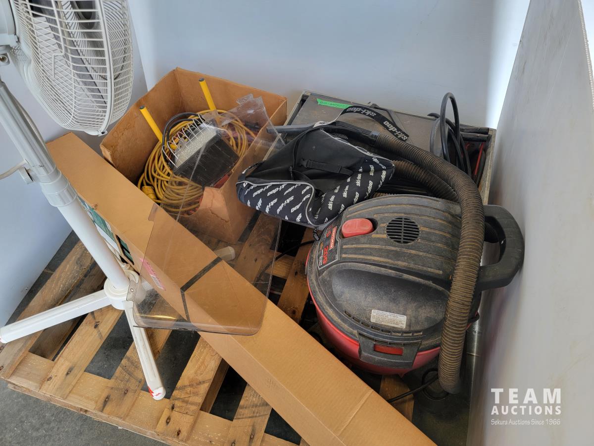 Broil King BBQ, Craftsman shop vac, floor fan, vertical privacy slats, work light, extension cords