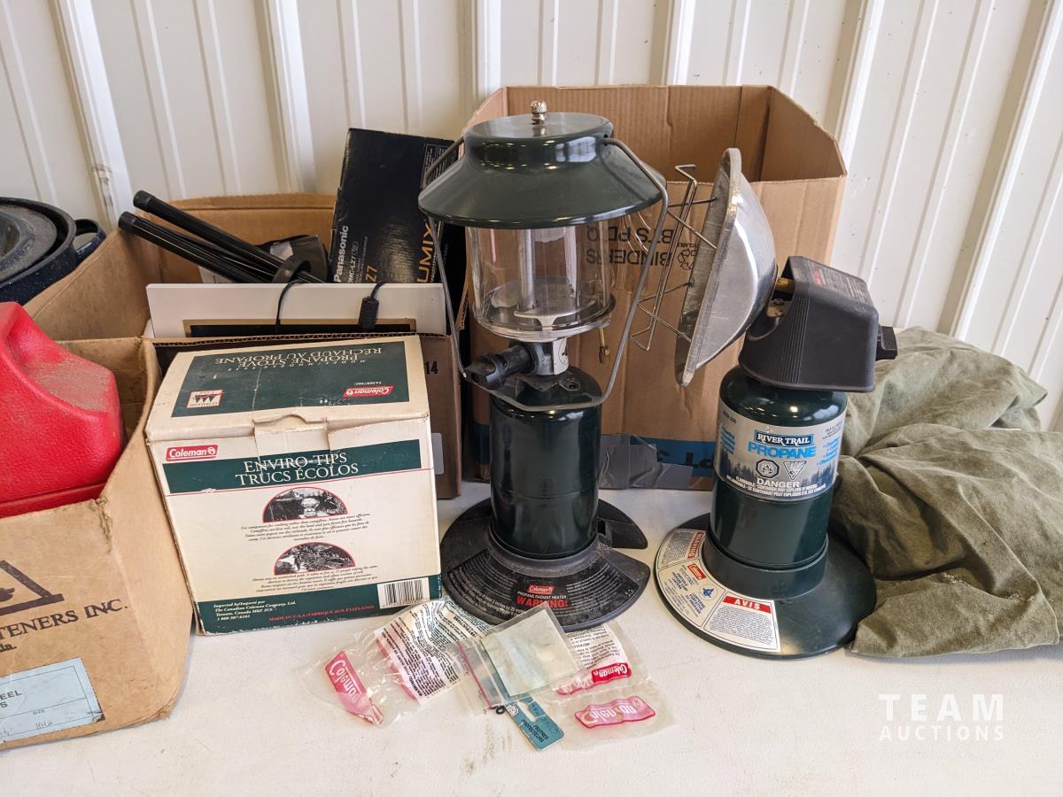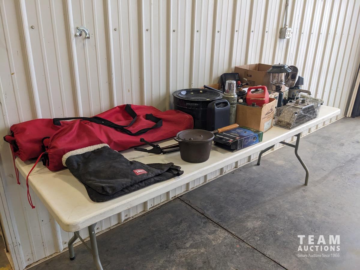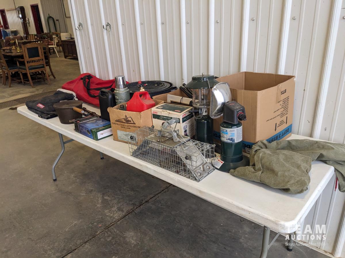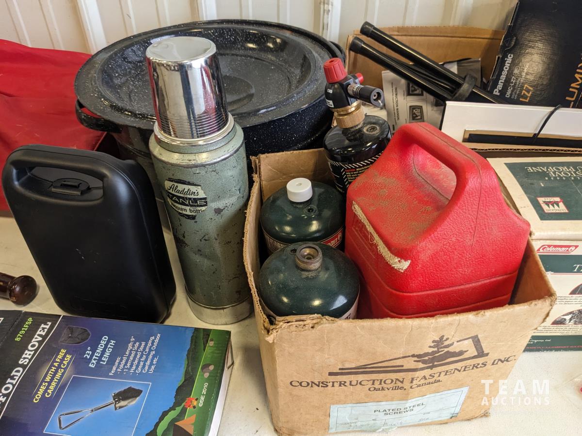 Lanterns, propane bottles, Tri-fold shovel, cast pot, live tarp, miscellaneous items
