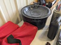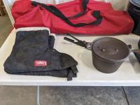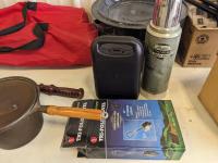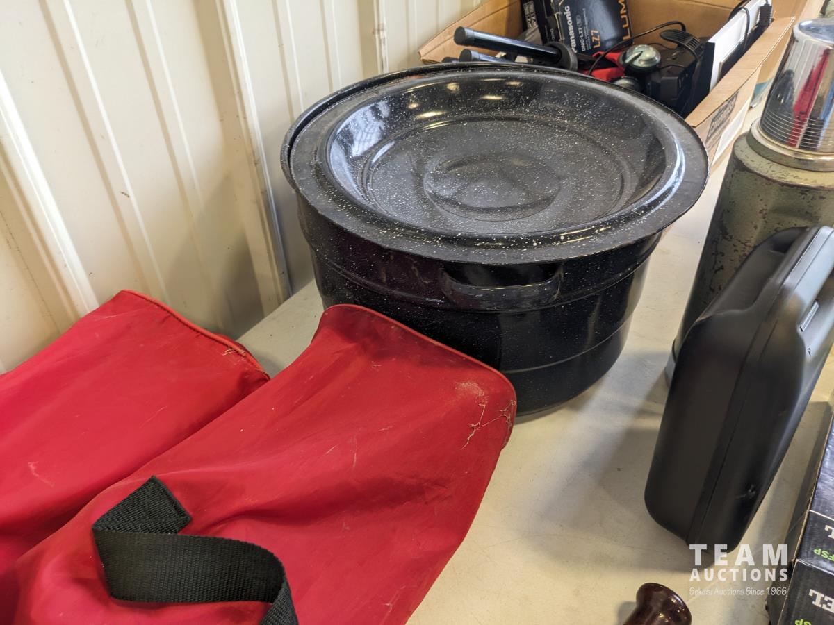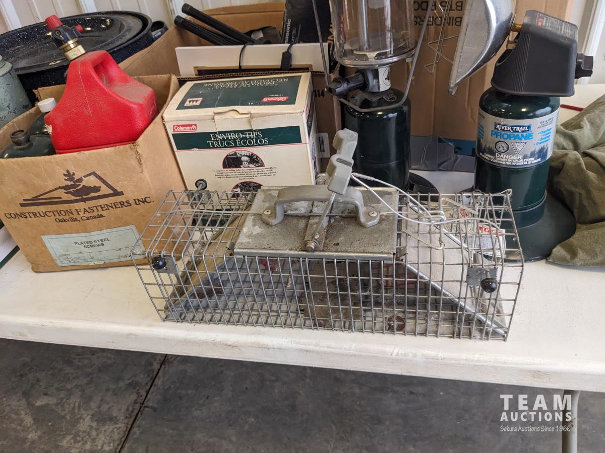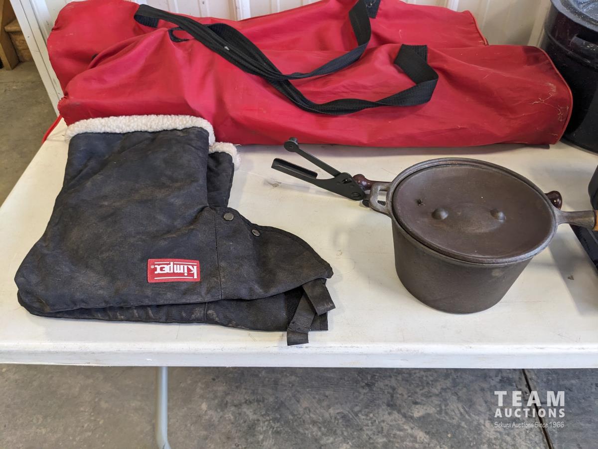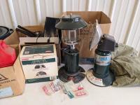 Lanterns, propane bottles, Tri-fold shovel, cast pot, live tarp, miscellaneous items