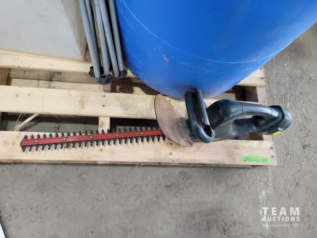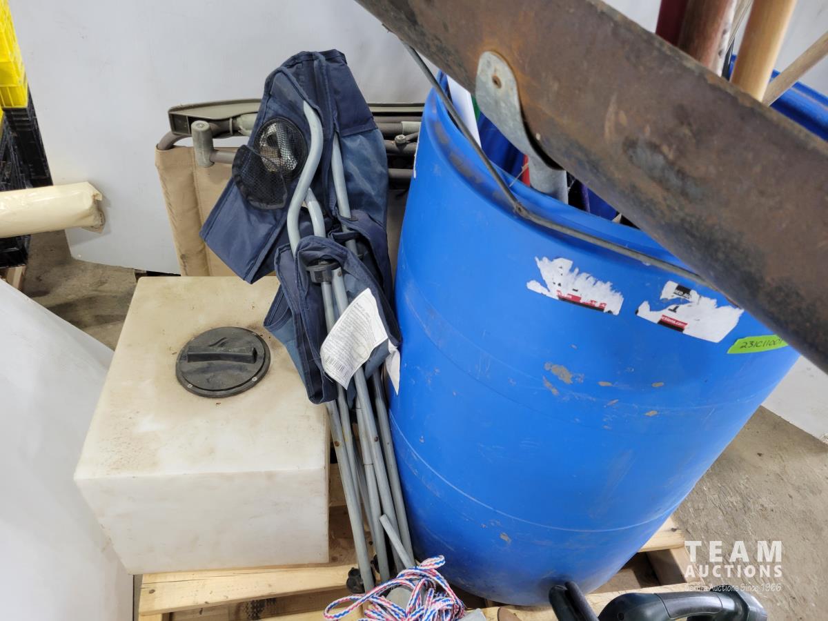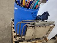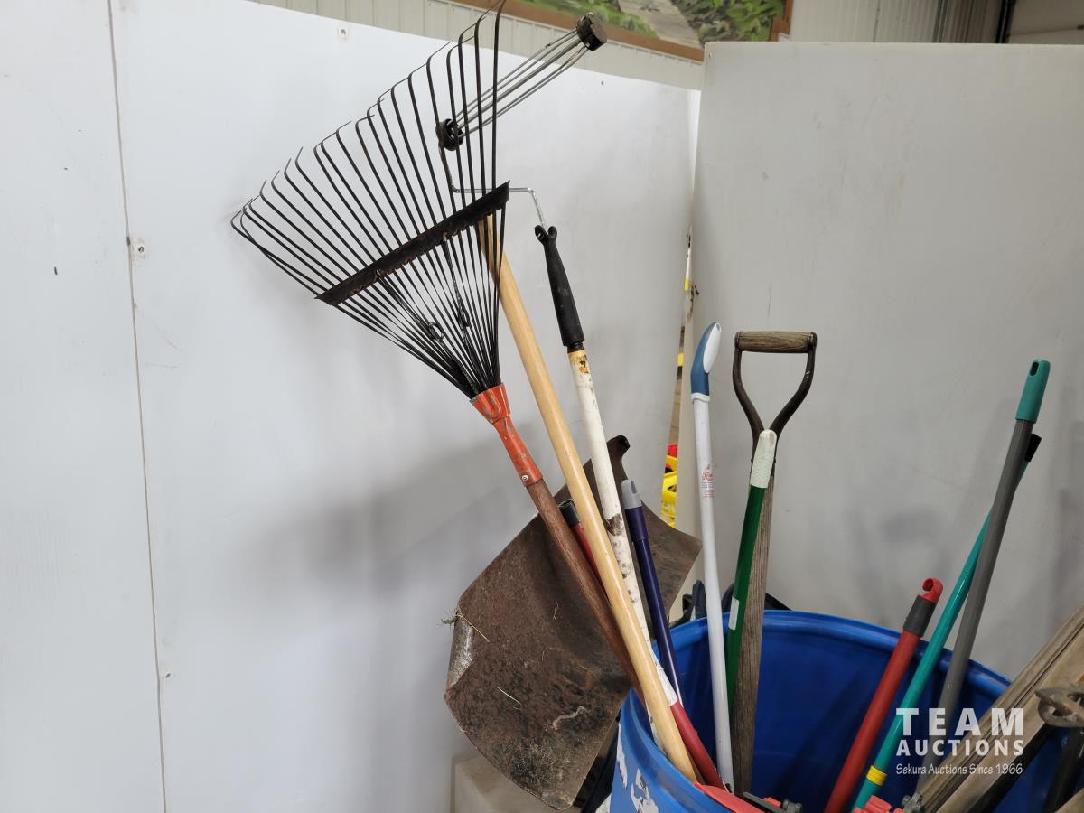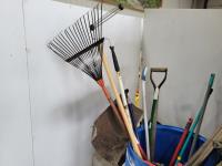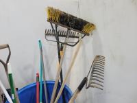 Rakes, shovels, brooms, (2) camping chairs, small poly tank, boat anchor, Yardworks cordless hedge trimmer