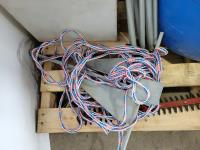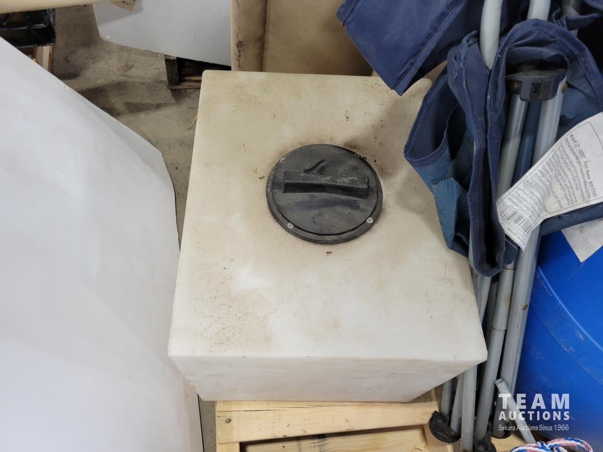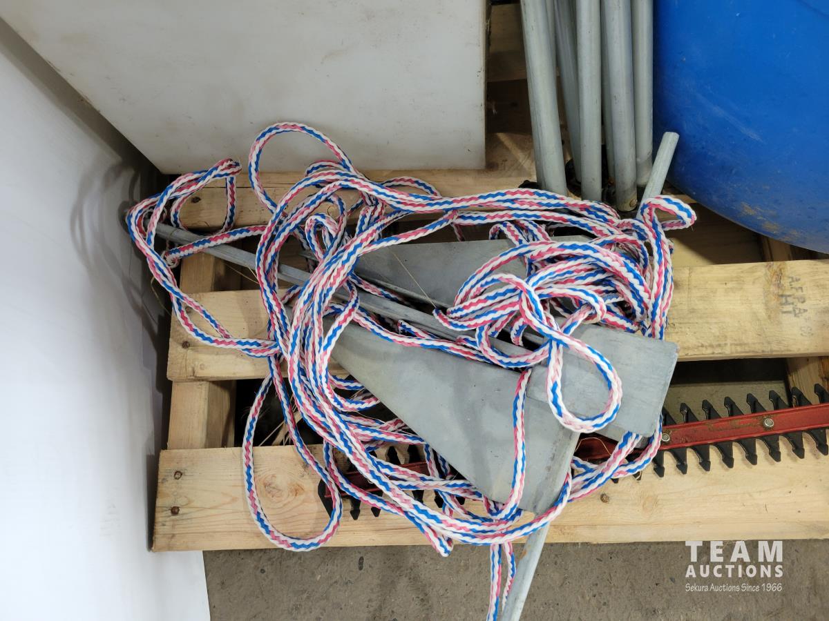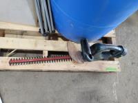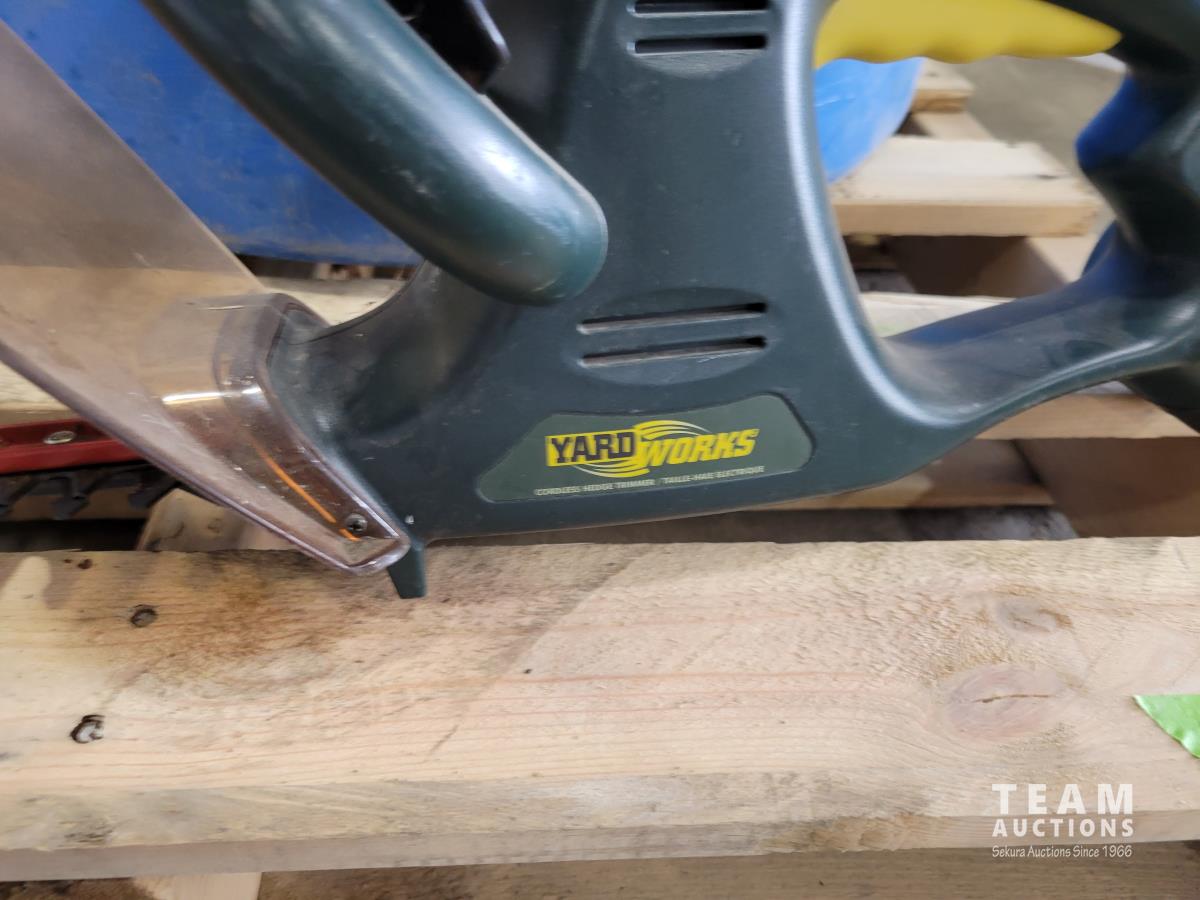 Rakes, shovels, brooms, (2) camping chairs, small poly tank, boat anchor, Yardworks cordless hedge trimmer
