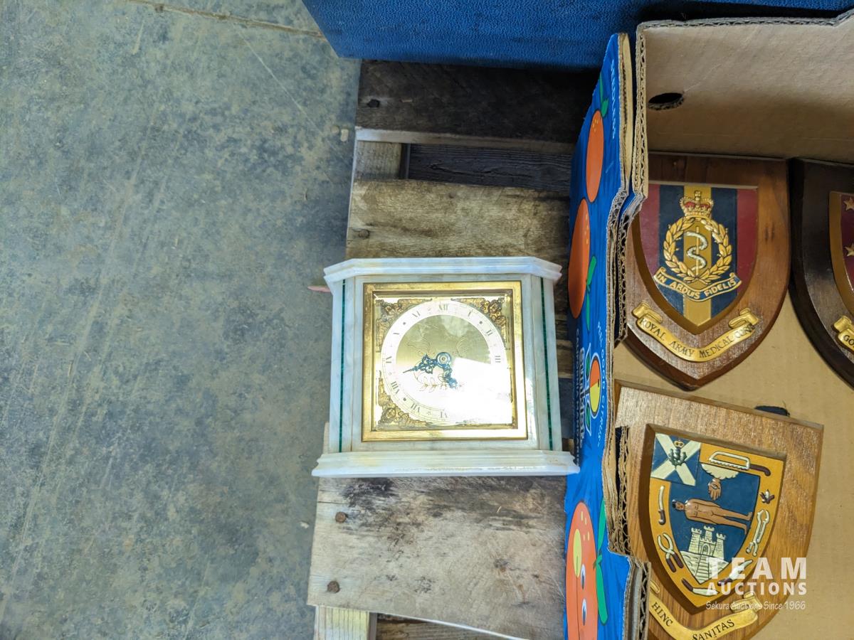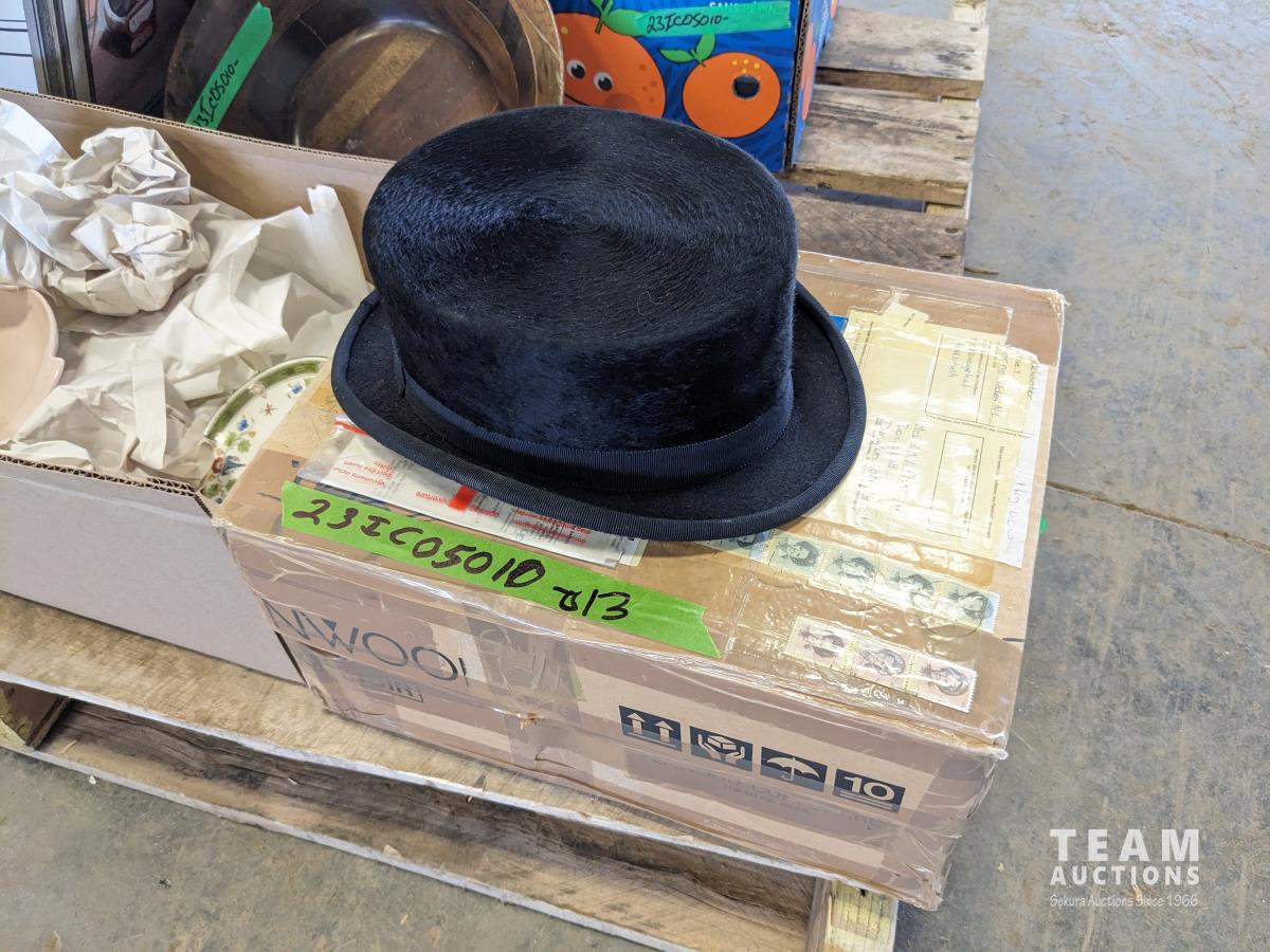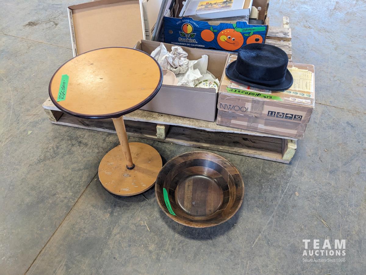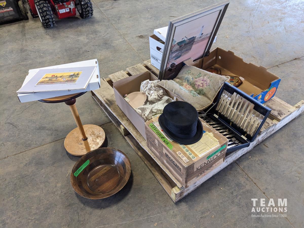 Felt hat, cutlery set, mantle clock, (6) medical wall plaques, qty of china, wood side table, picture frames