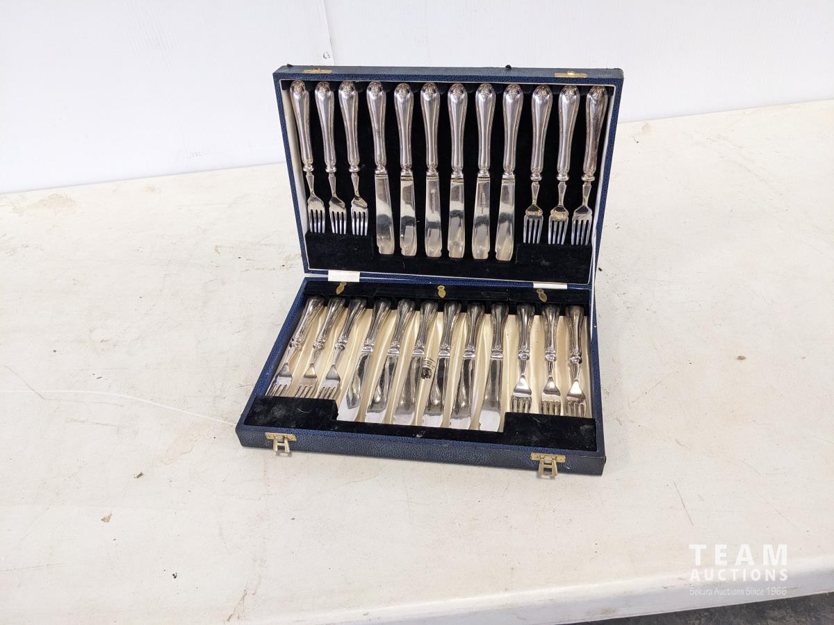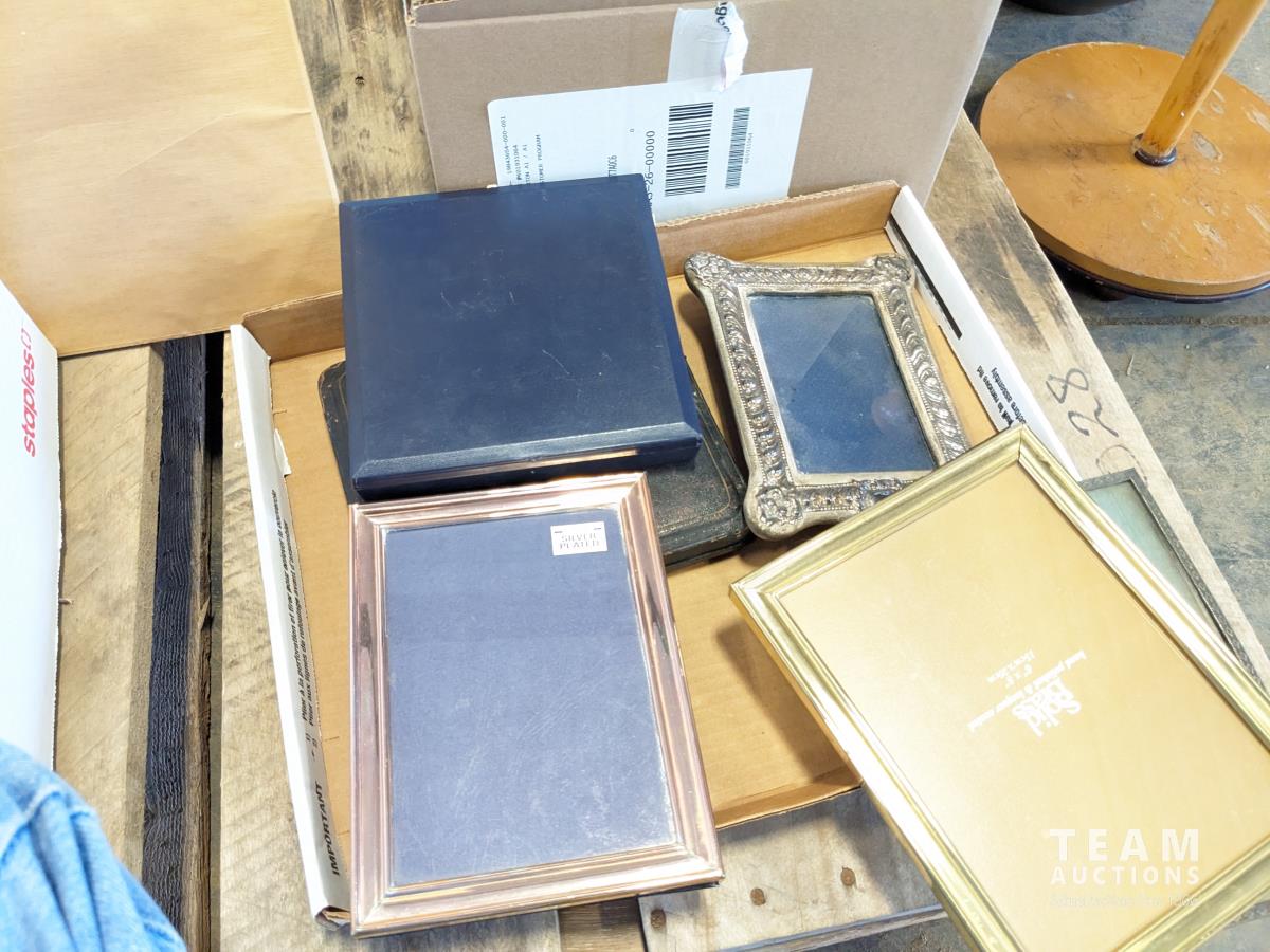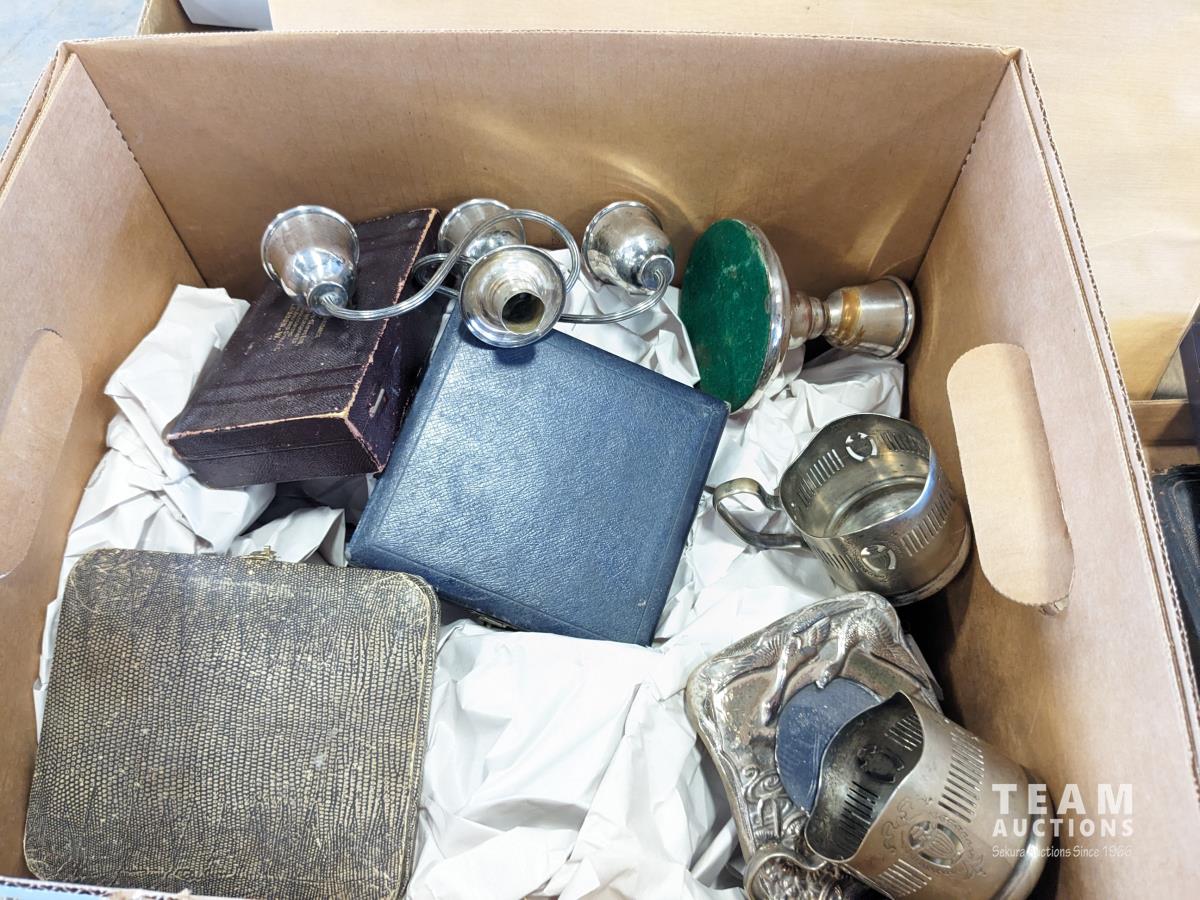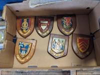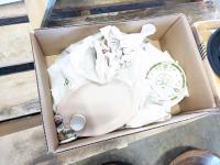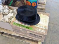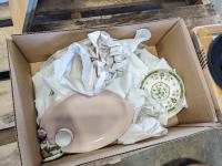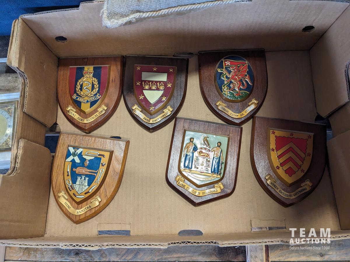 Felt hat, cutlery set, mantle clock, (6) medical wall plaques, qty of china, wood side table, picture frames