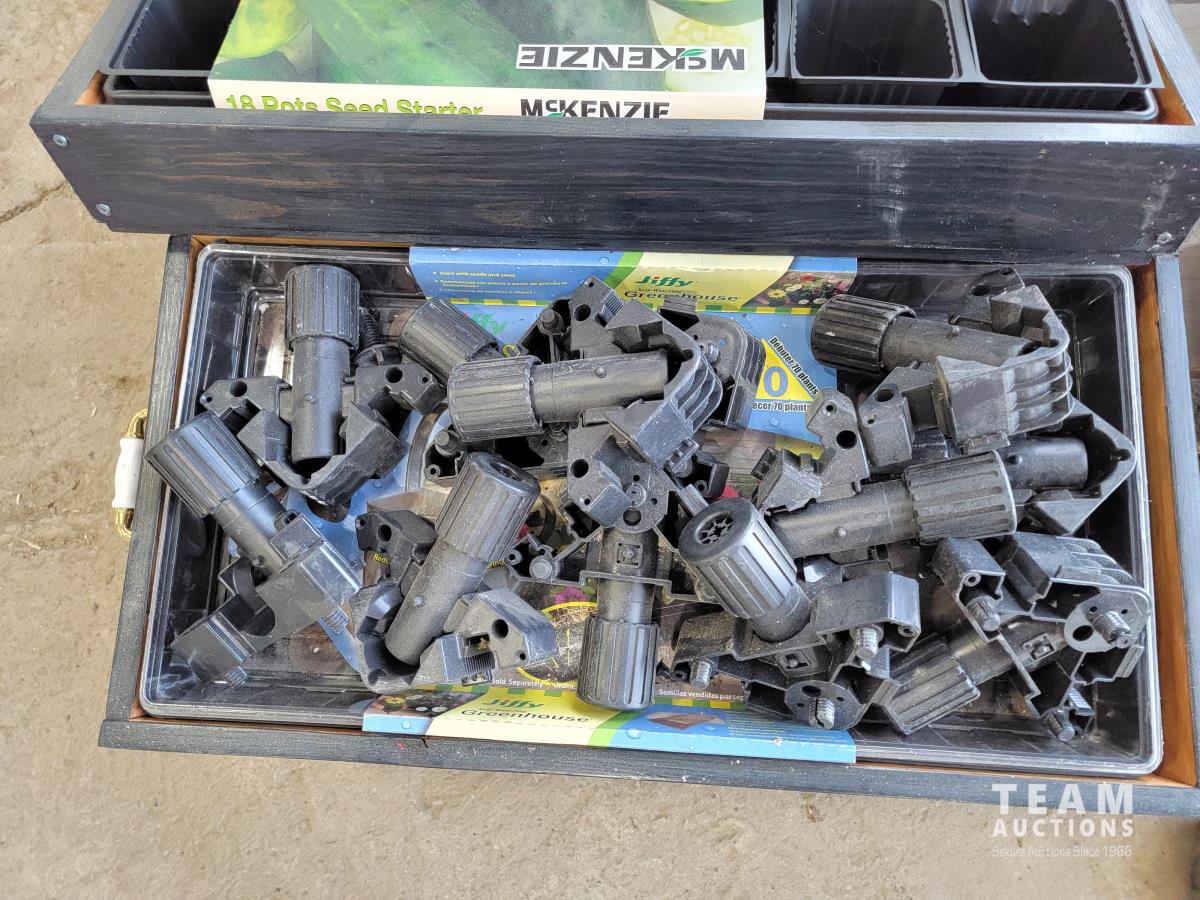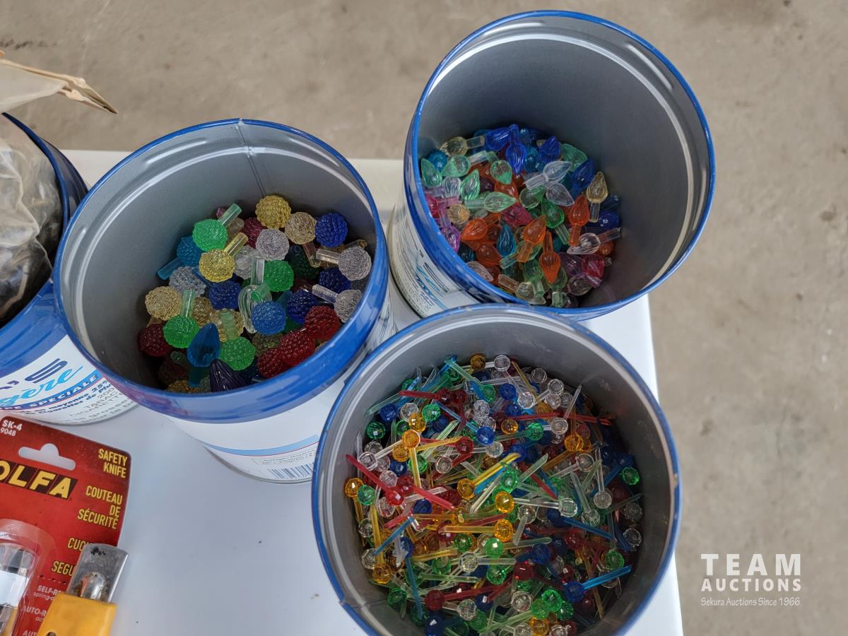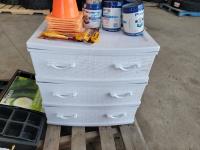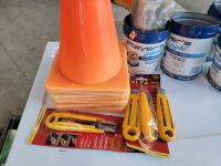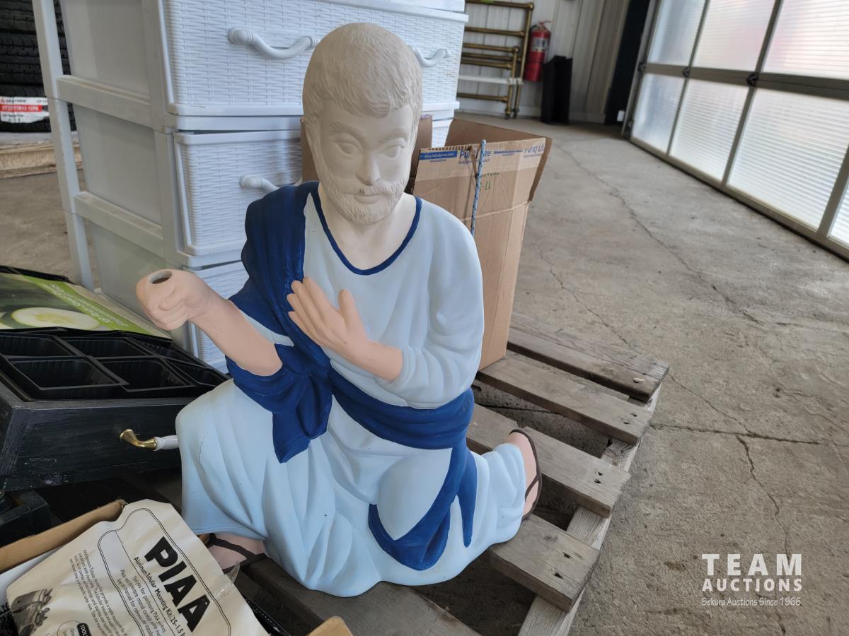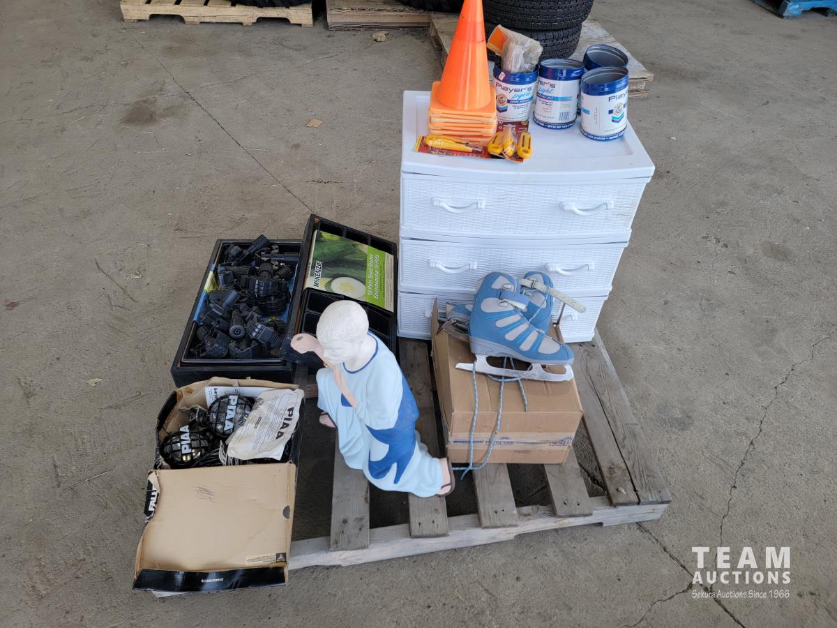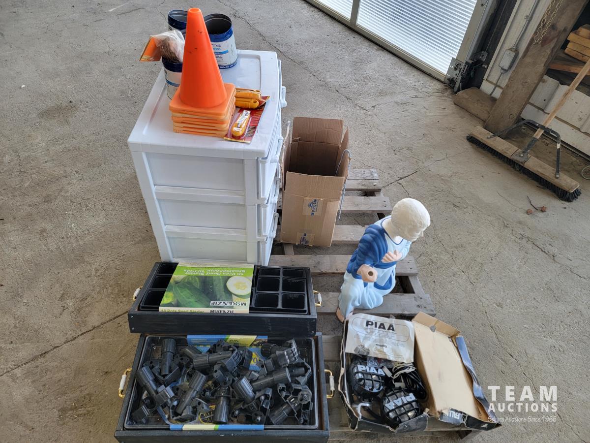 18 seed starter pots, traffic cones, poly 3 drawer shelf, size 6 skates, safety knives, ceramic Christmas light decor, PIAA aluminum tubular 1.25 inch - 1.5 inch light mounting kit, Joseph statue, base cabinet level adjustors